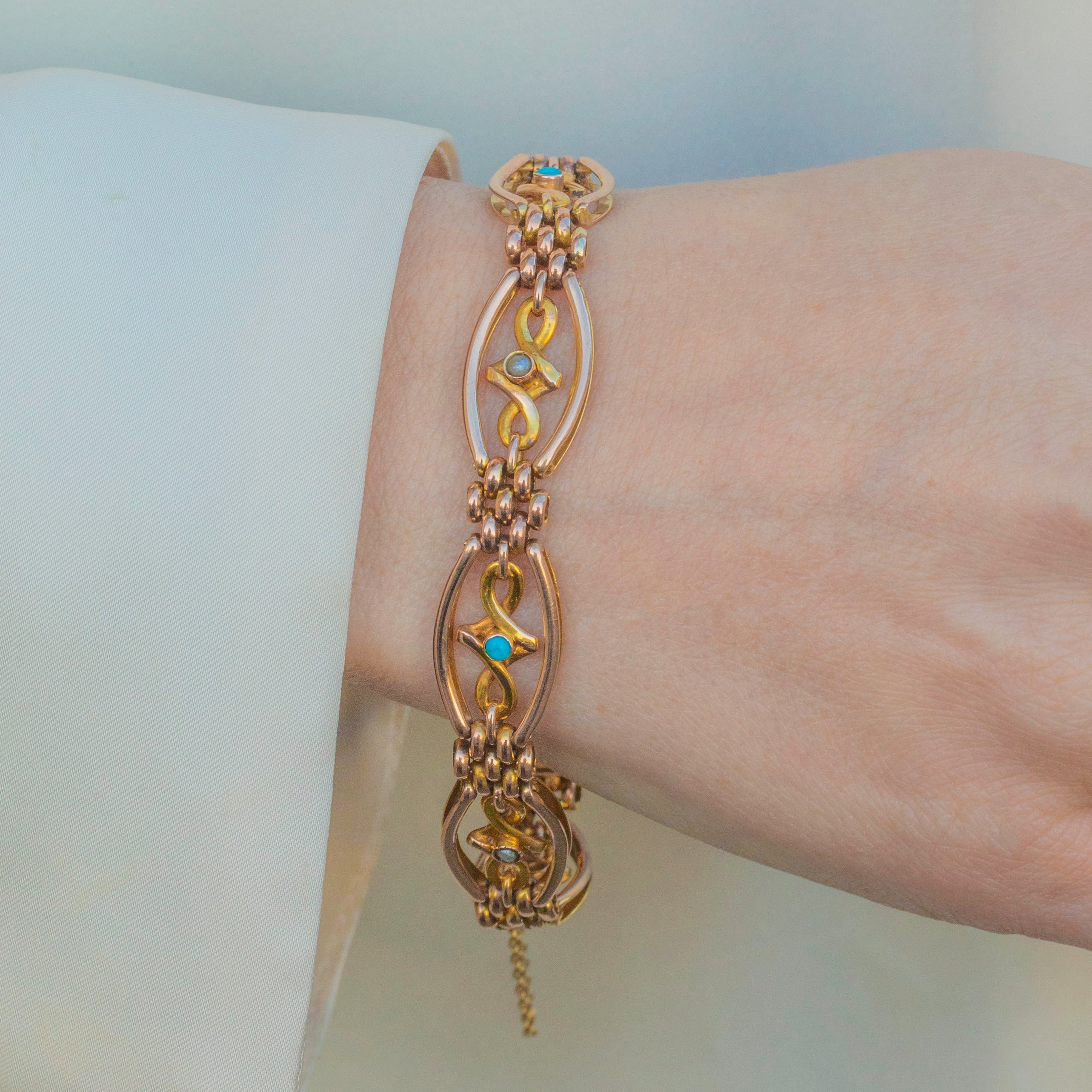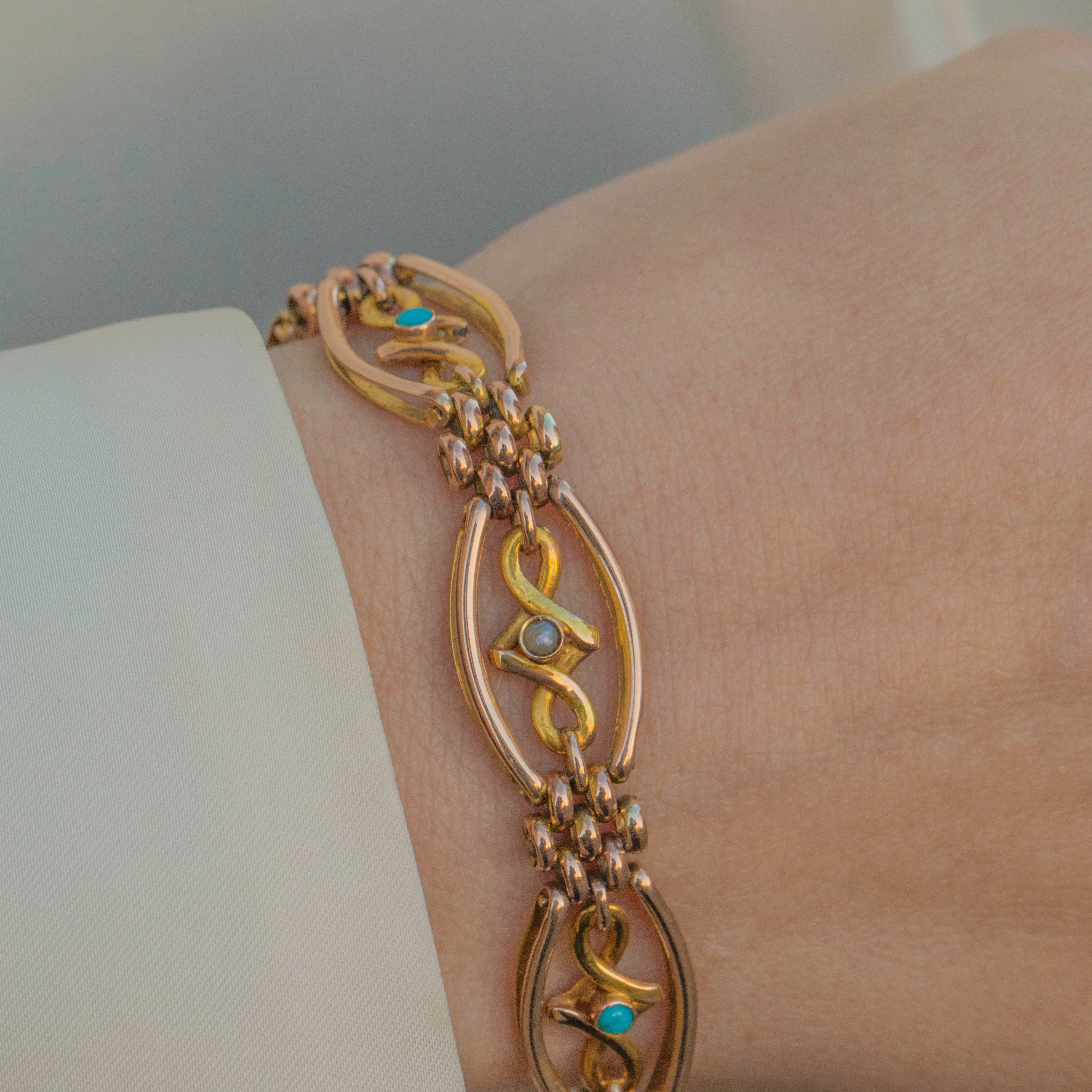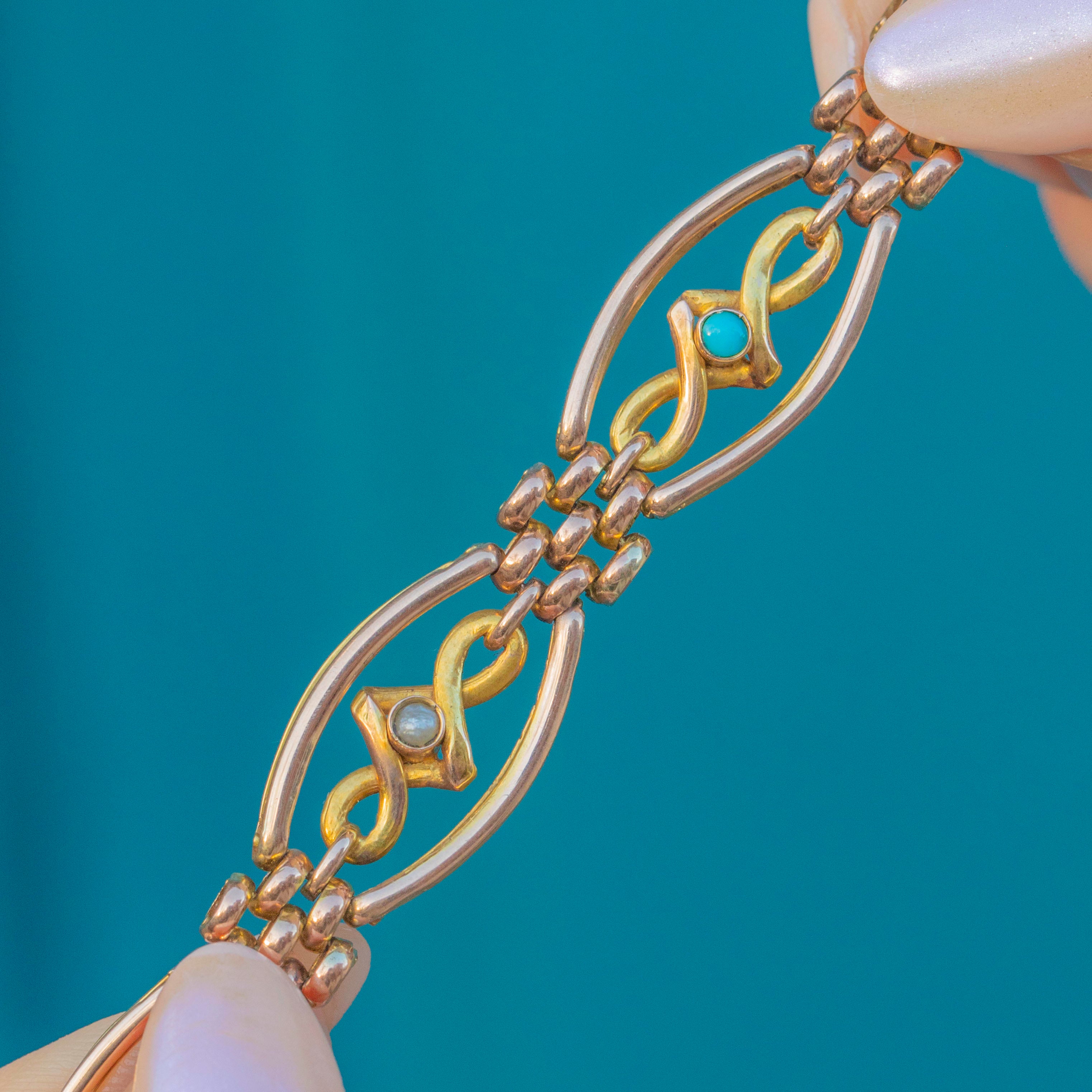 EXCELLENT. This Victorian 9ct Gold Turquoise Pearl gate bracelet is in excellent condition throughout. Each gemstone is securely set and retains a brilliance of hue, whilst the links are all securely connected and are free from any damage to note. Her clasp fastens securely shut and she is complete with a safety chain. Accruing a gorgeous saturation over its lifetime, her 9ct Gold remains as bright as ever! Allow her to lovingly wrap herself around your wrist for years to come.