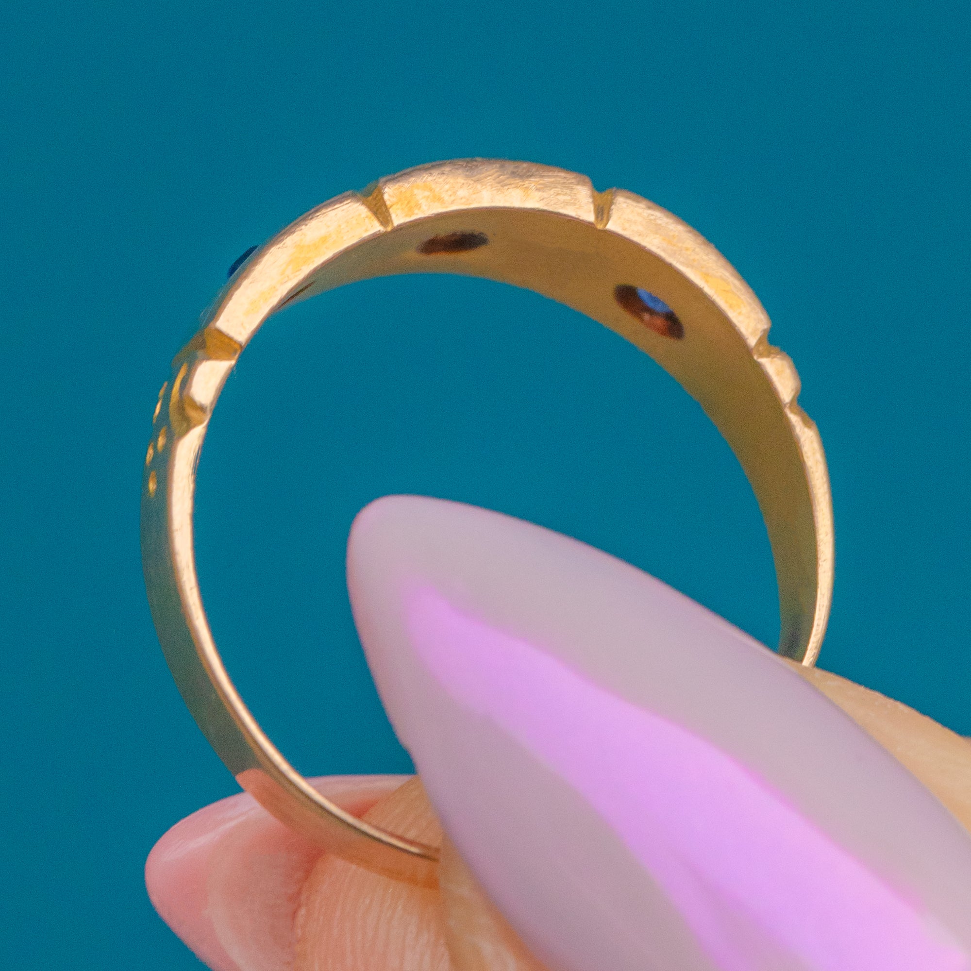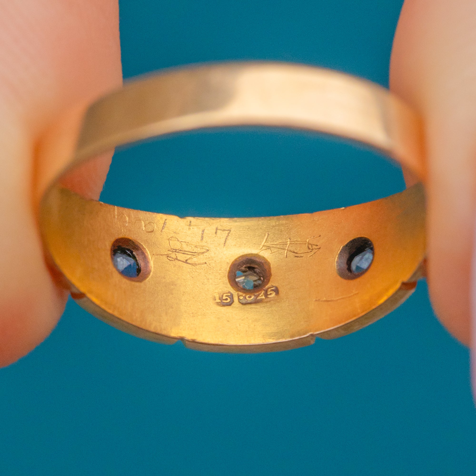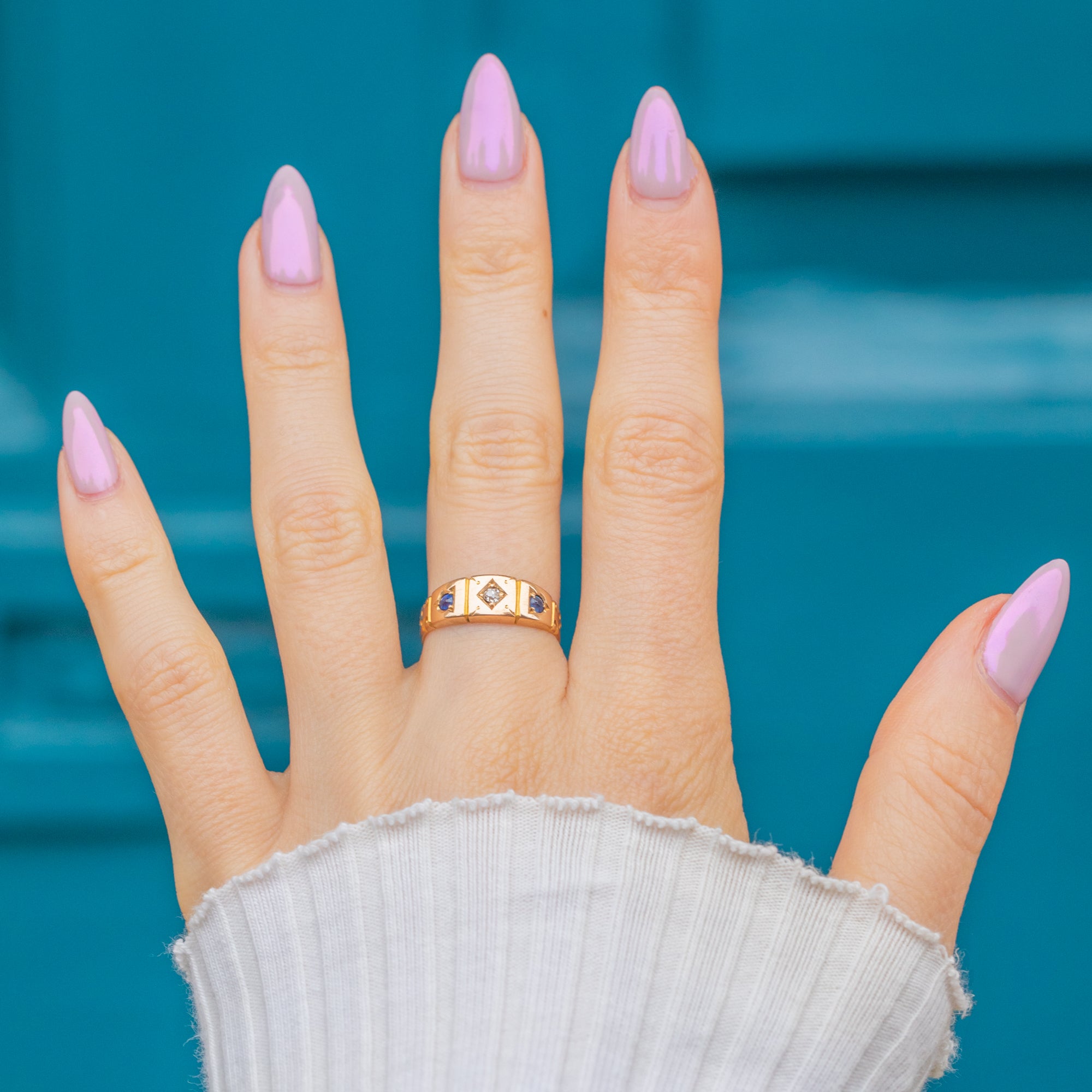 A classic Victorian “gypsy” ring in rich 15ct Gold, star-set with a sparkling Diamond flanked by vivid blue Sapphires. The smooth domed band and crisp geometric settings give this piece that quintessential late-19th-century look—chic on its own and perfect for stacking.