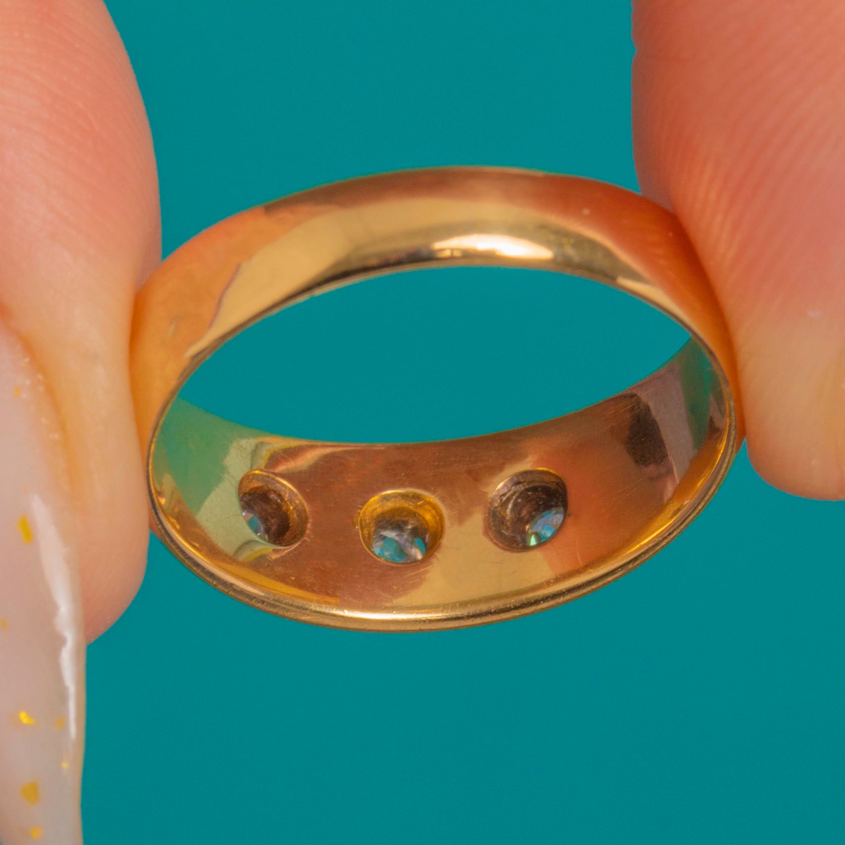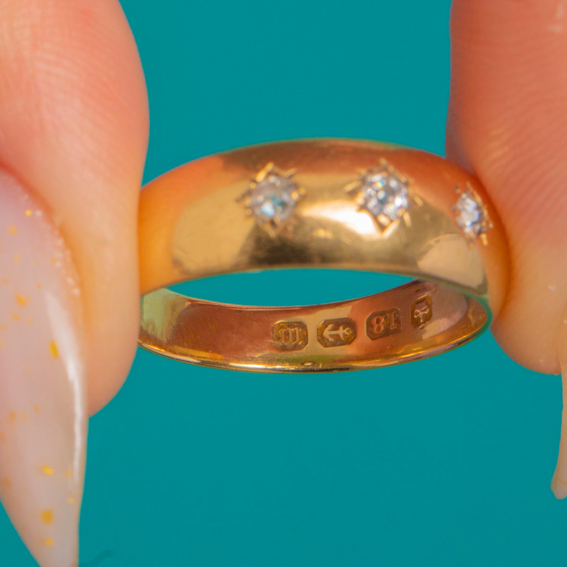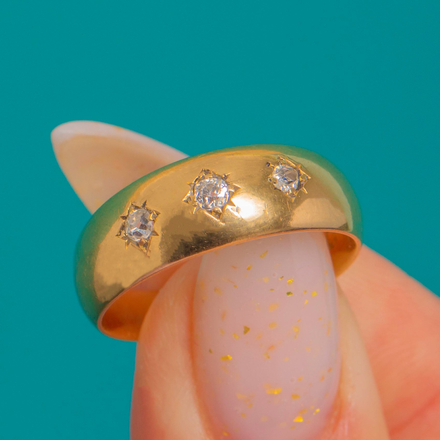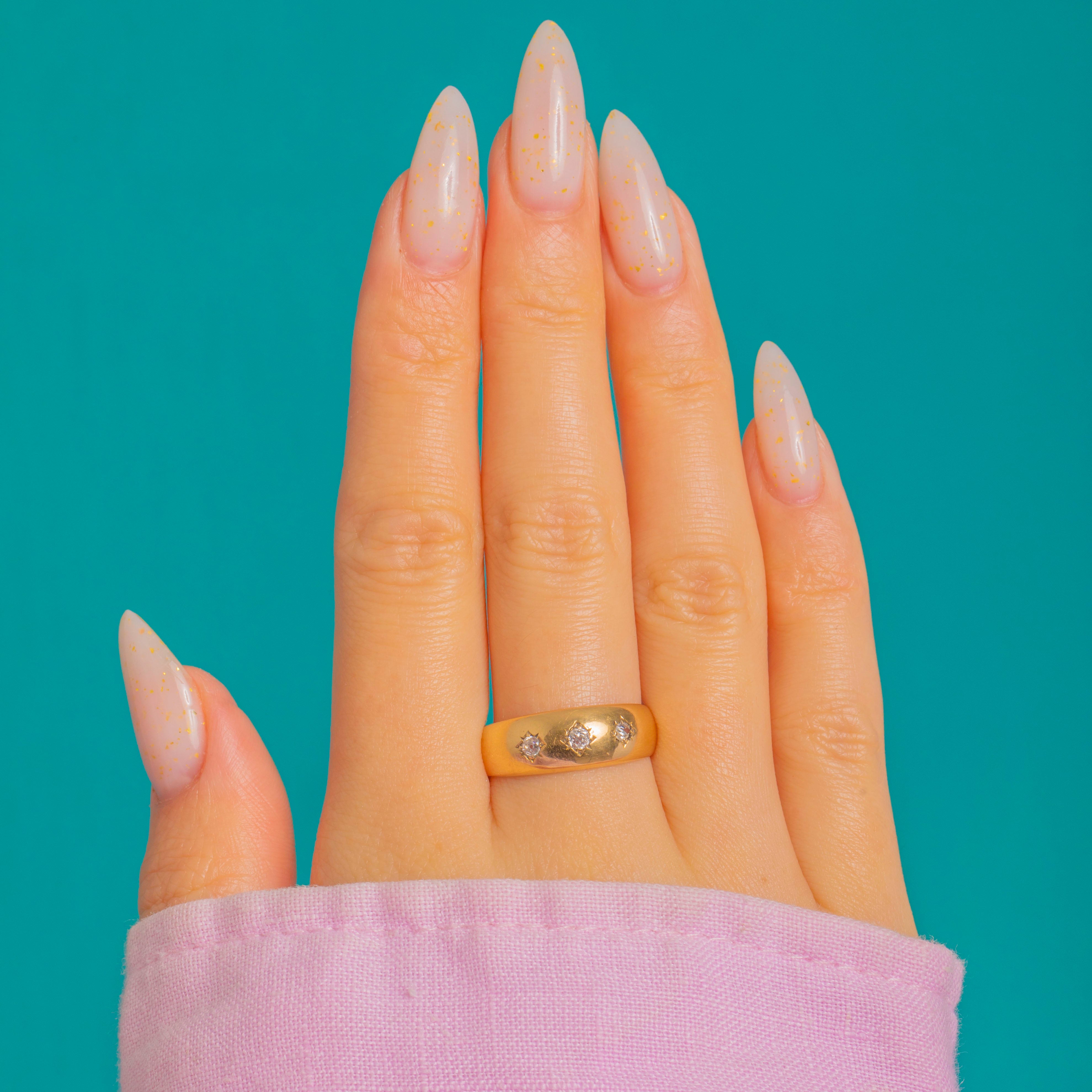 Timeless and beautifully understated, this late Victorian three-stone gypsy ring is crafted in rich 18ct Gold and set with three bright Diamonds in engraved eight-point star settings. The centre Diamond is subtly larger, flanked by a matching pair, all set flush into a smooth, domed band for effortless, everyday elegance.