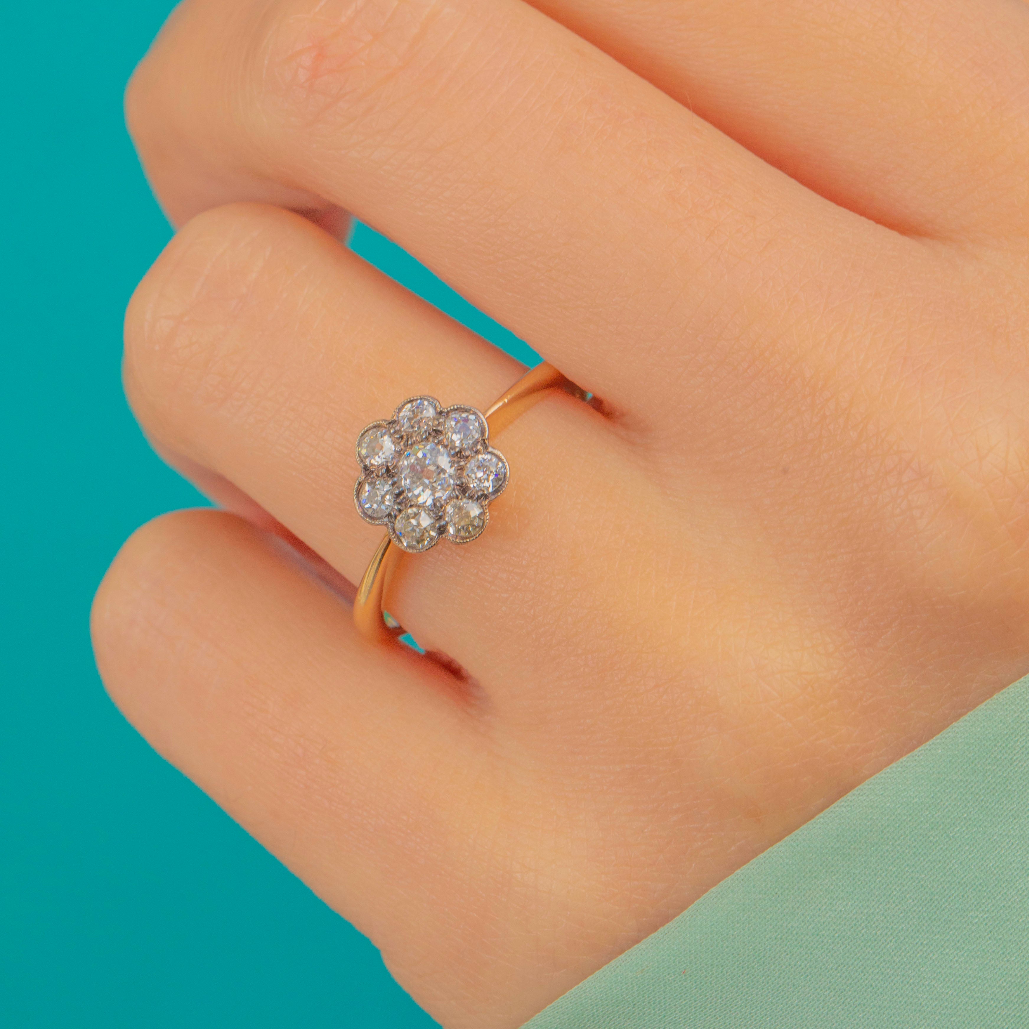 A beautiful Victorian Diamond cluster ring crafted in rich 18ct Gold with classic Silver milgrain settings, dating to the late 19th century. The central Diamond sparkles brightly, surrounded by a halo of matching old-cut stones that create a romantic, timeless cluster—an iconic choice for an antique engagement ring.