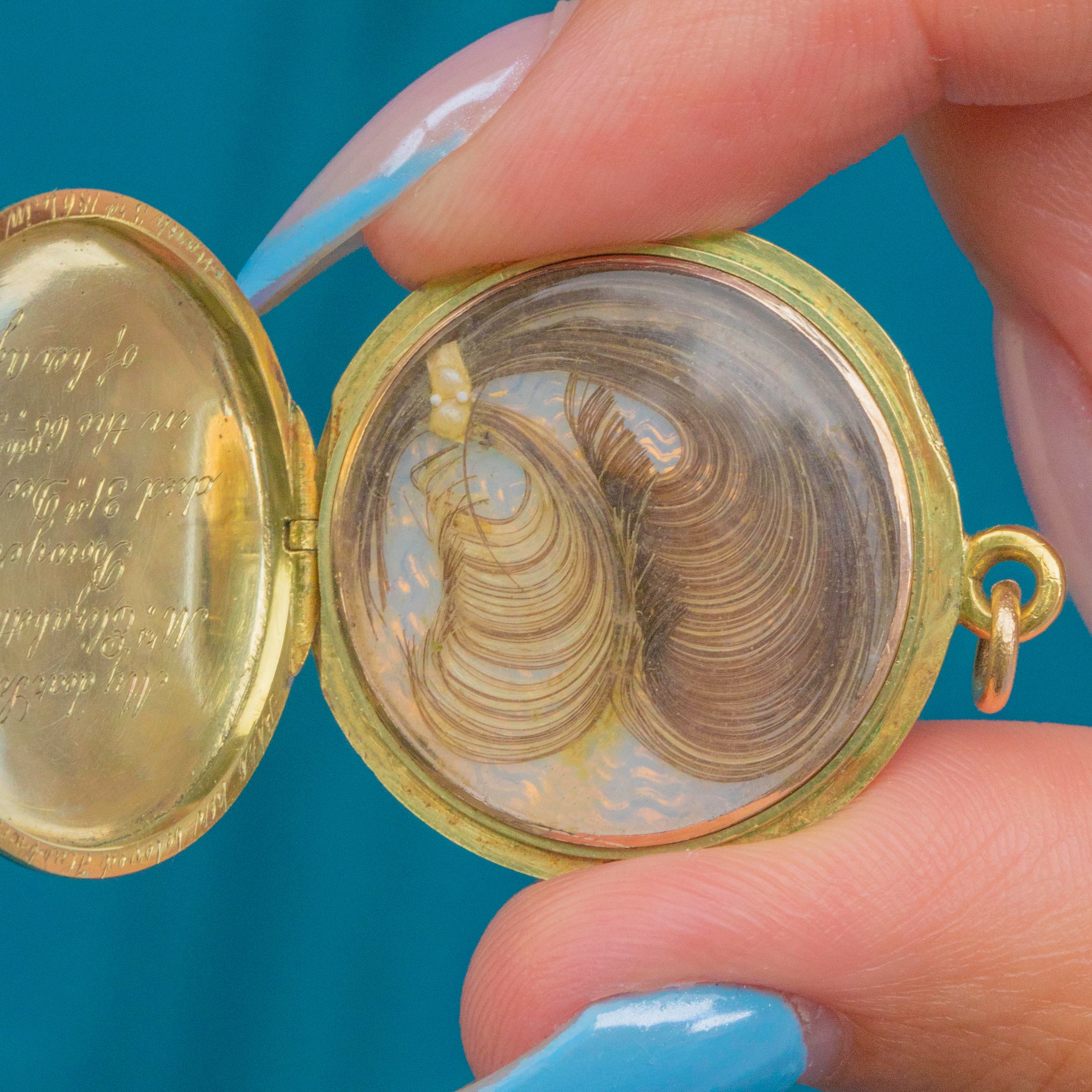 EXCELLENT: This antique Victorian 9ct Gold mourning hair locket is in exquisite condition for its long life. The Enamel has kept in pristine condition with no dinks or dents to note. Her Pearls are all present and secure and have a delightful lustre with minimal wear. Equally her wonderful engravings are immaculate and the lock of her well in place. Presented in her original box, she will be worn and adored for generations to come.