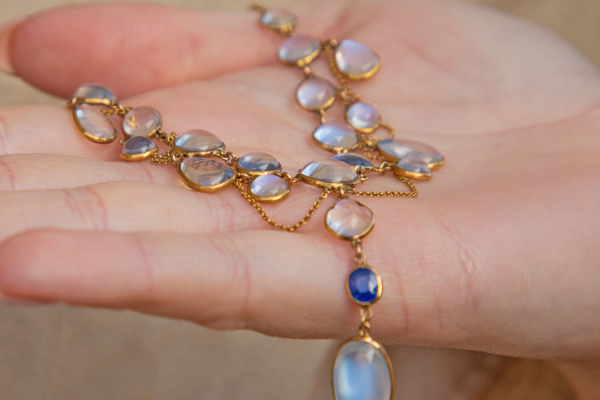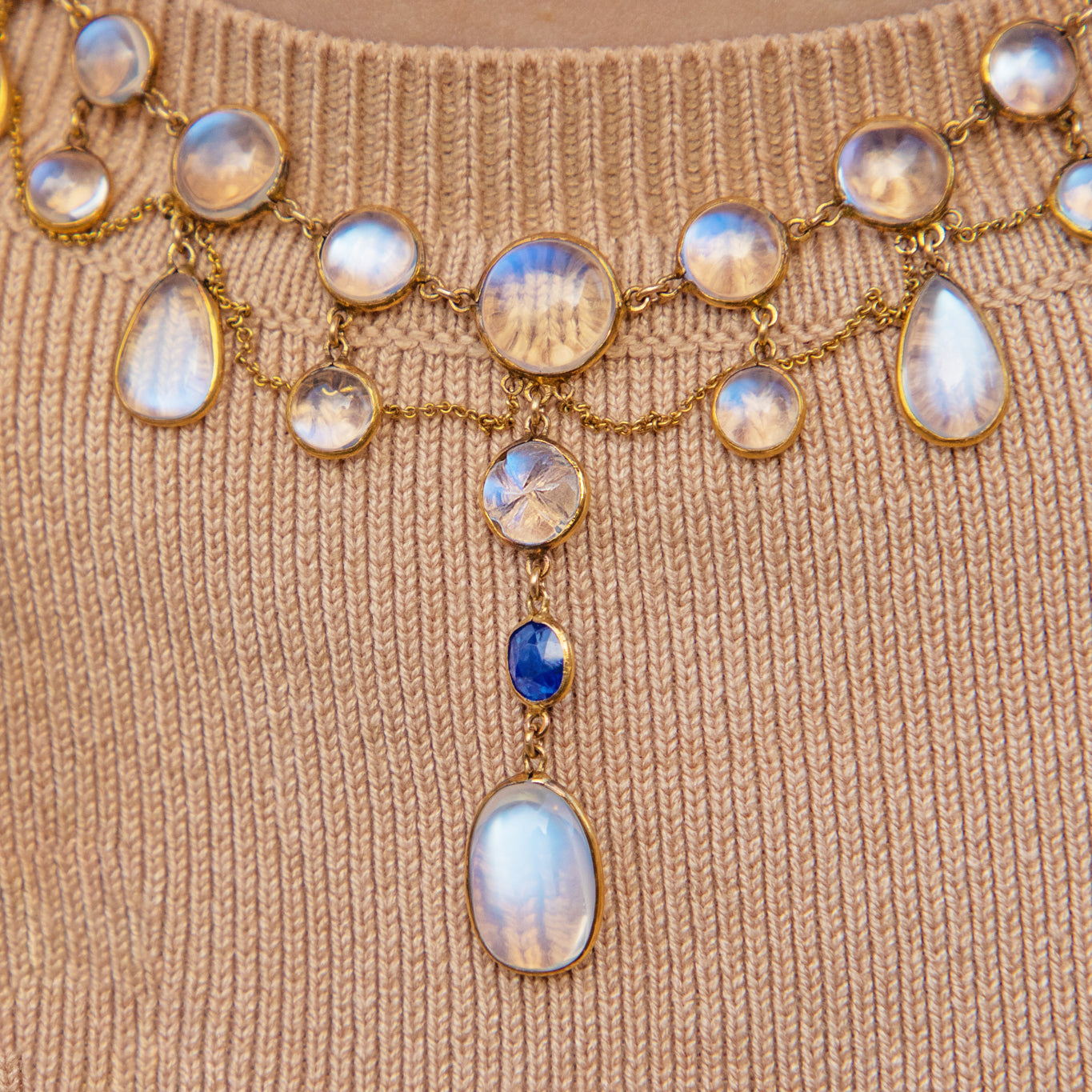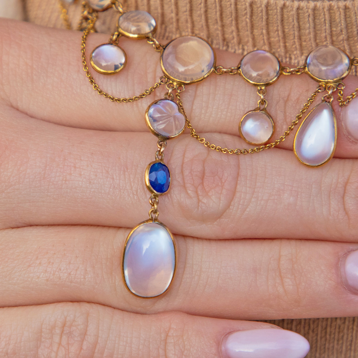 13.5" Victorian 18ct Gold Carved Ceylon Moonstone & Natural Sapphire Fringe Necklace