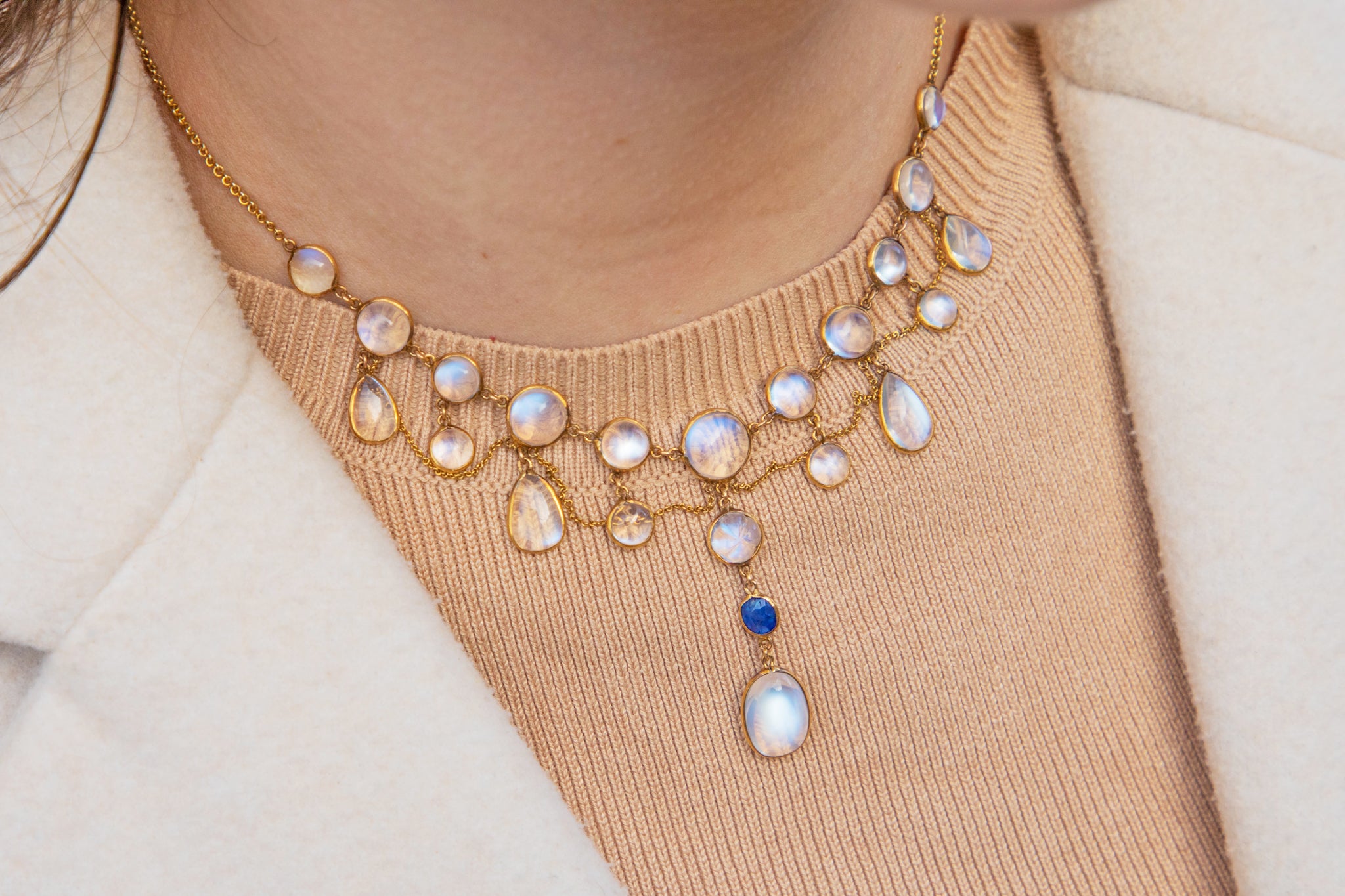 A very special Victorian 18ct Gold Ceylon Moonstone & Natural Sapphire fringe necklace in very good to excellent condition. The myriad of Moonstones are fabulous.. they have everything you could possibly want; from secure and smooth Gold bezel settings, lovely movement, and a strong play of adularescence across every single stone!