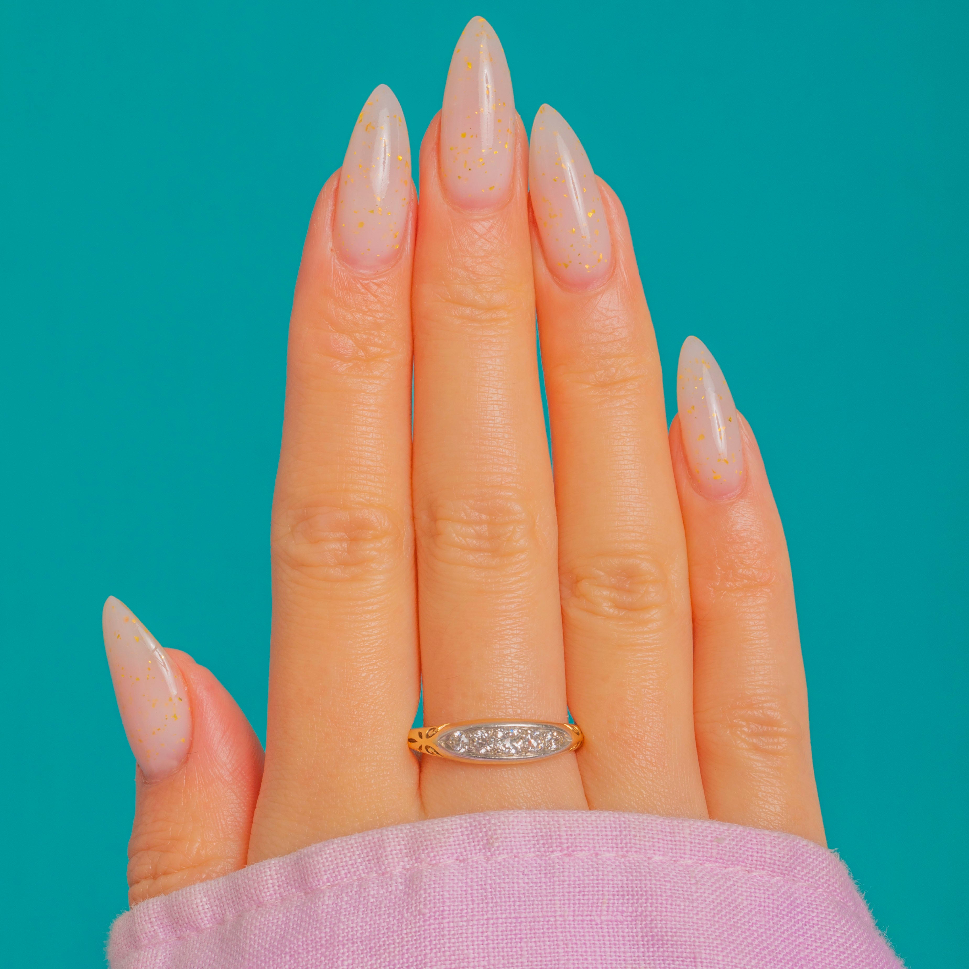 Understated and beautifully balanced, the crisp Platinum settings highlight the bright Diamonds, while the slender Gold band ensures a graceful, comfortable fit. A chic choice for stacking or wearing solo, it captures the enduring romance of Victorian design.