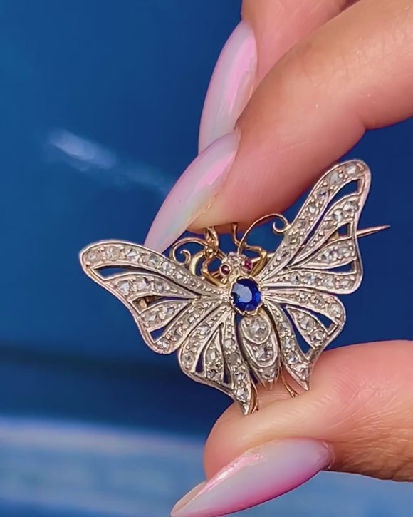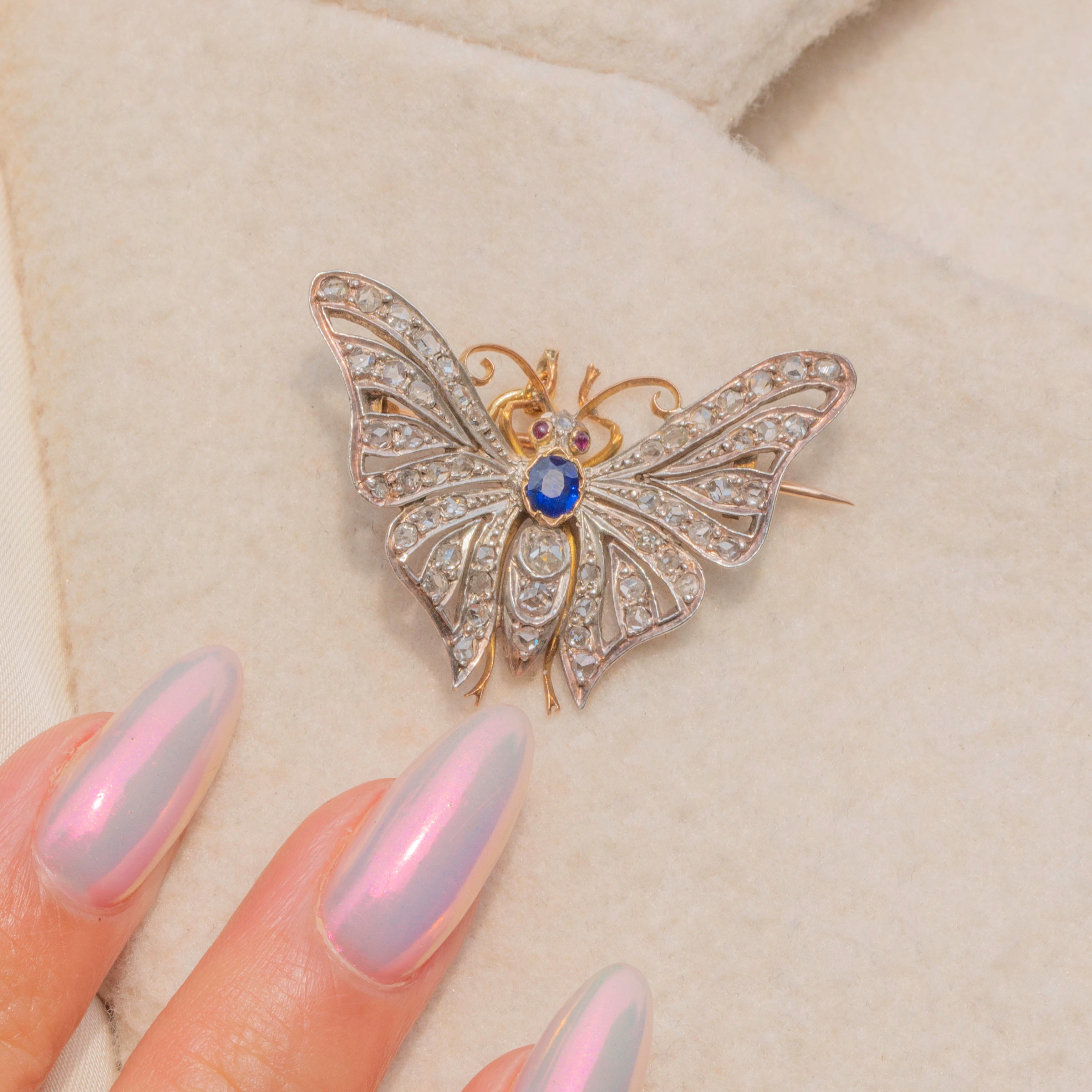 EXCELLENT: We are pleased to present this Victorian 18ct Gold Diamond Sapphire butterfly pendant in excellent condition. Each of her Diamonds are radiant and set securely within their settings. There are some small inclusions in the Sapphire - a little nod to Mother Nature -  and her Rubies are radiant. Her brooch fittings are in perfect working order and with a securely soldered jump ring, you can wear this antique butterfly with utmost confidence!