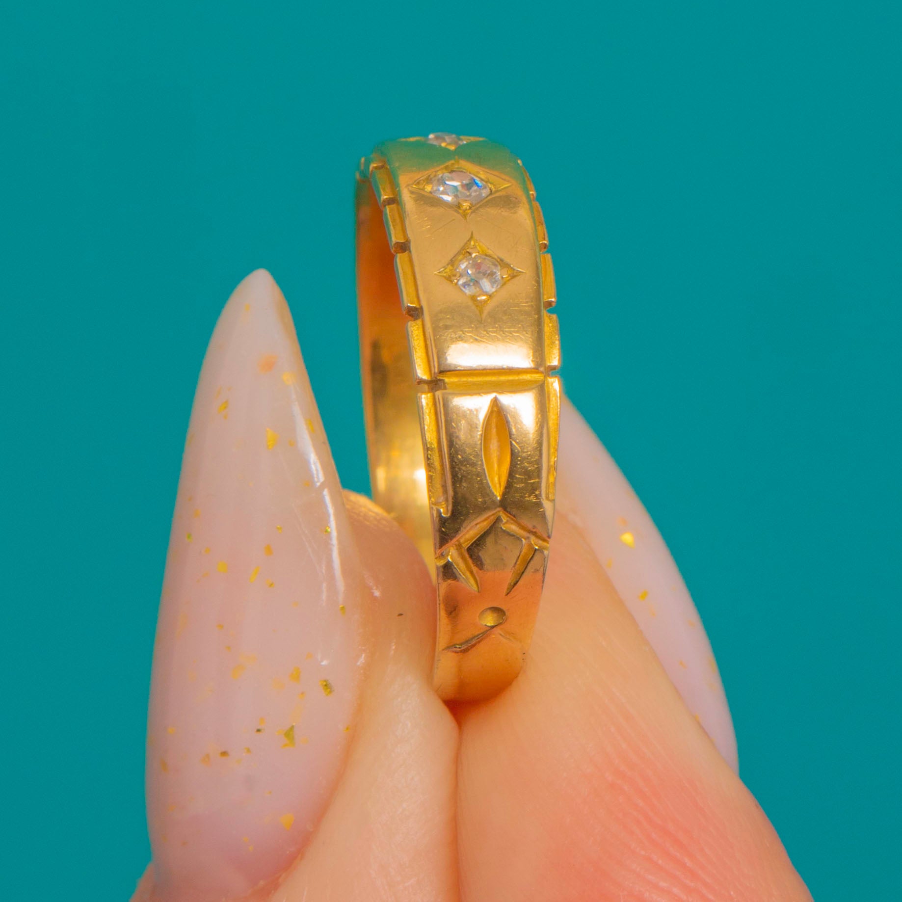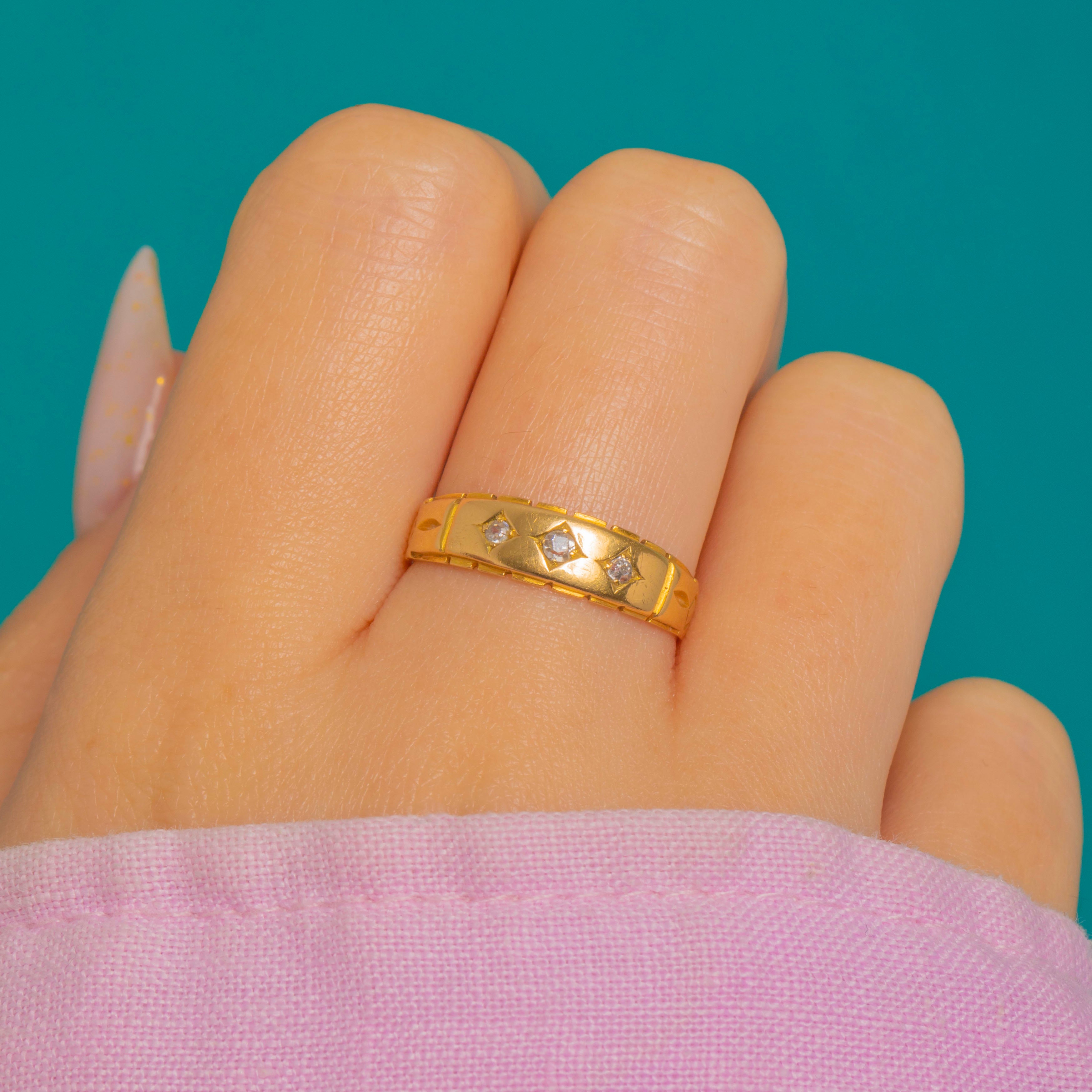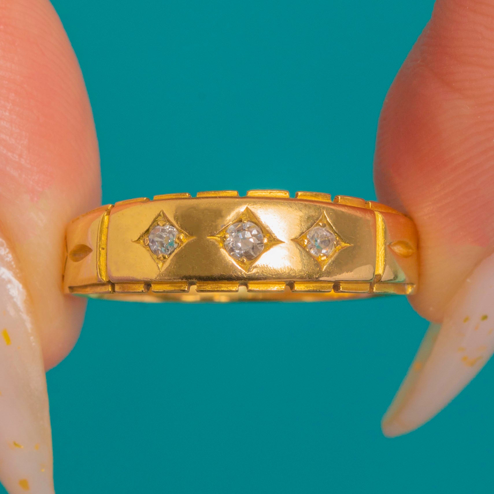 A classic late Victorian gypsy ring in rich 18ct Gold, set with a trio of bright Diamonds across a flat-topped panel. The stones are framed by crisply engraved star/lozenge bursts, with neatly notched borders, navette shoulder panels and punched-dot accents lending a refined geometric flair.
