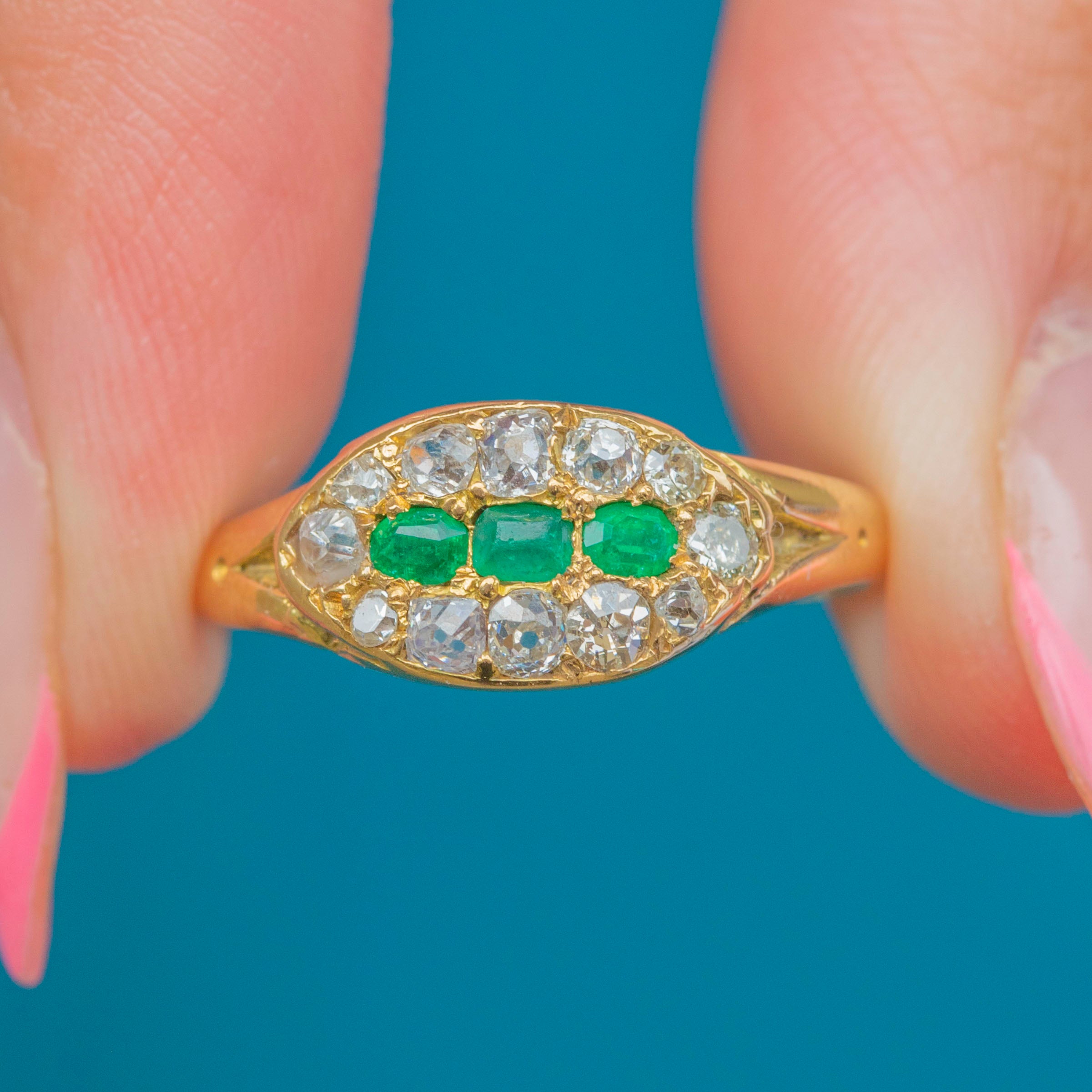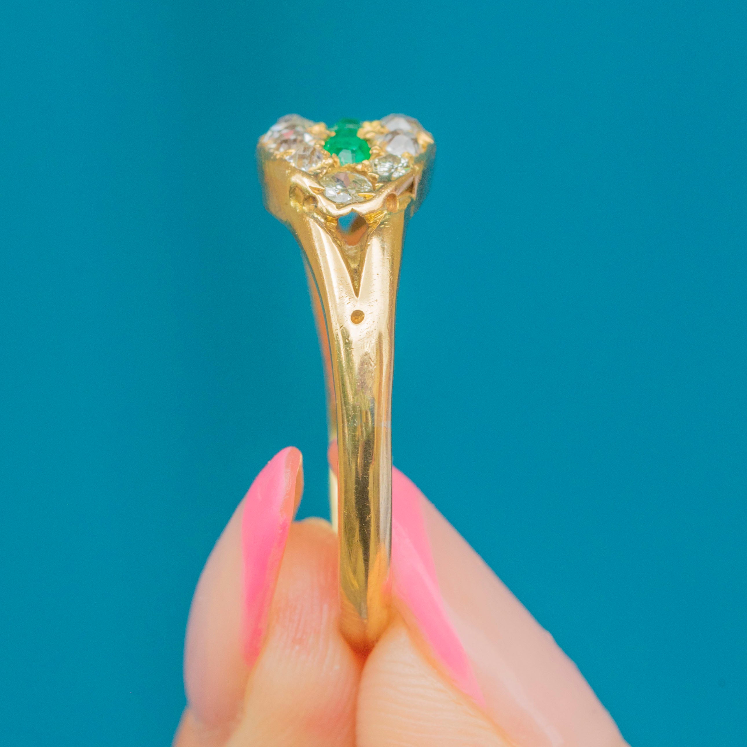 Victorian 18ct Gold Emerald Diamond East to West Cluster Ring