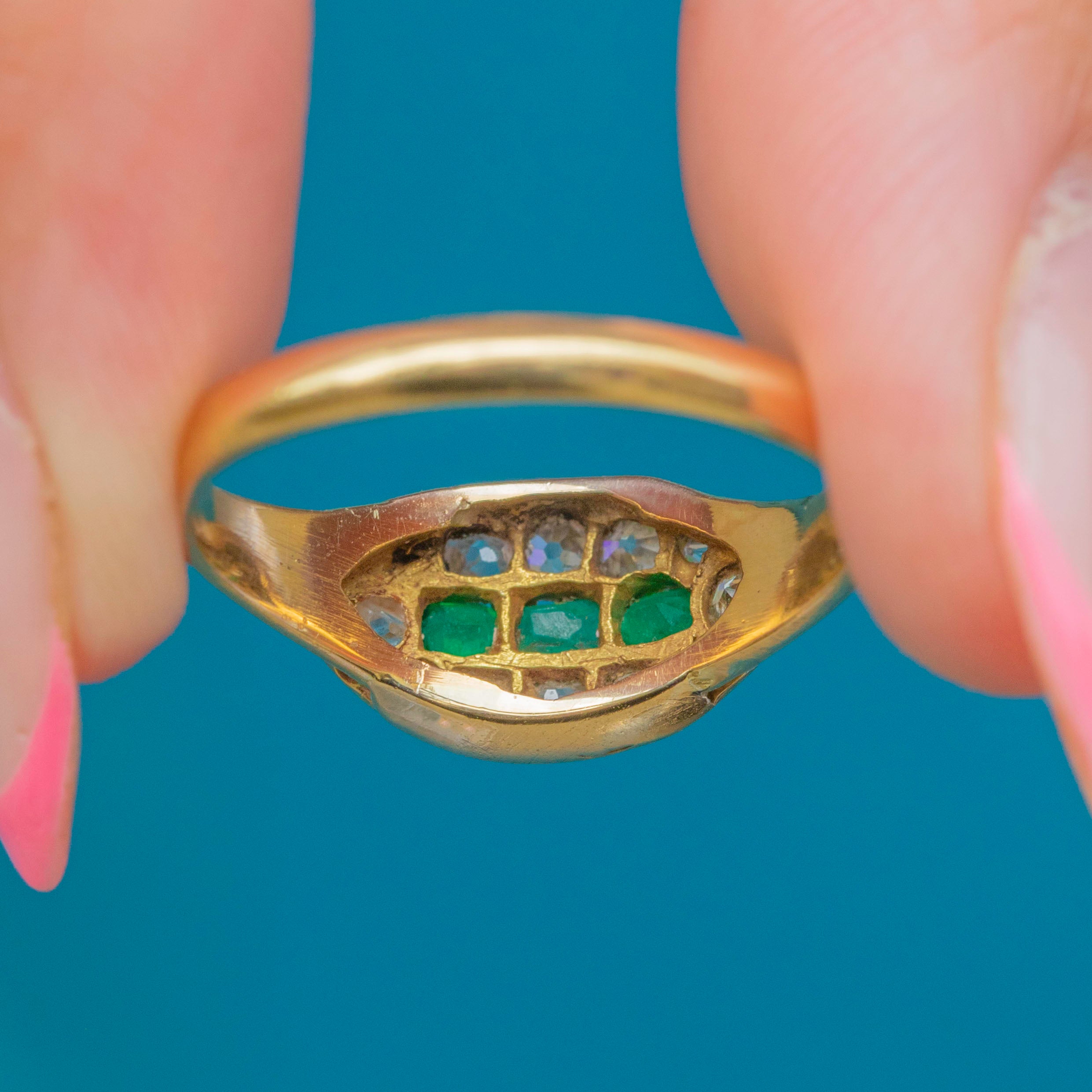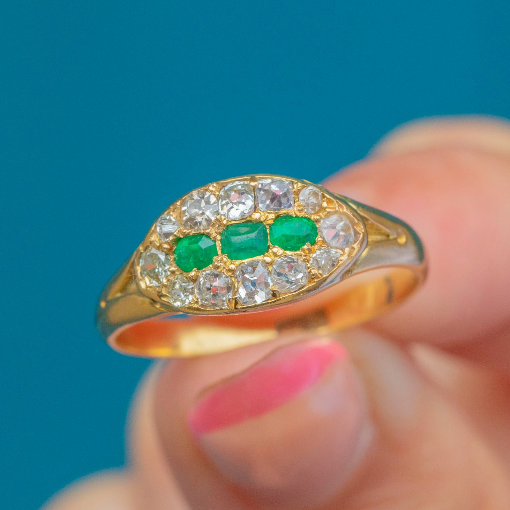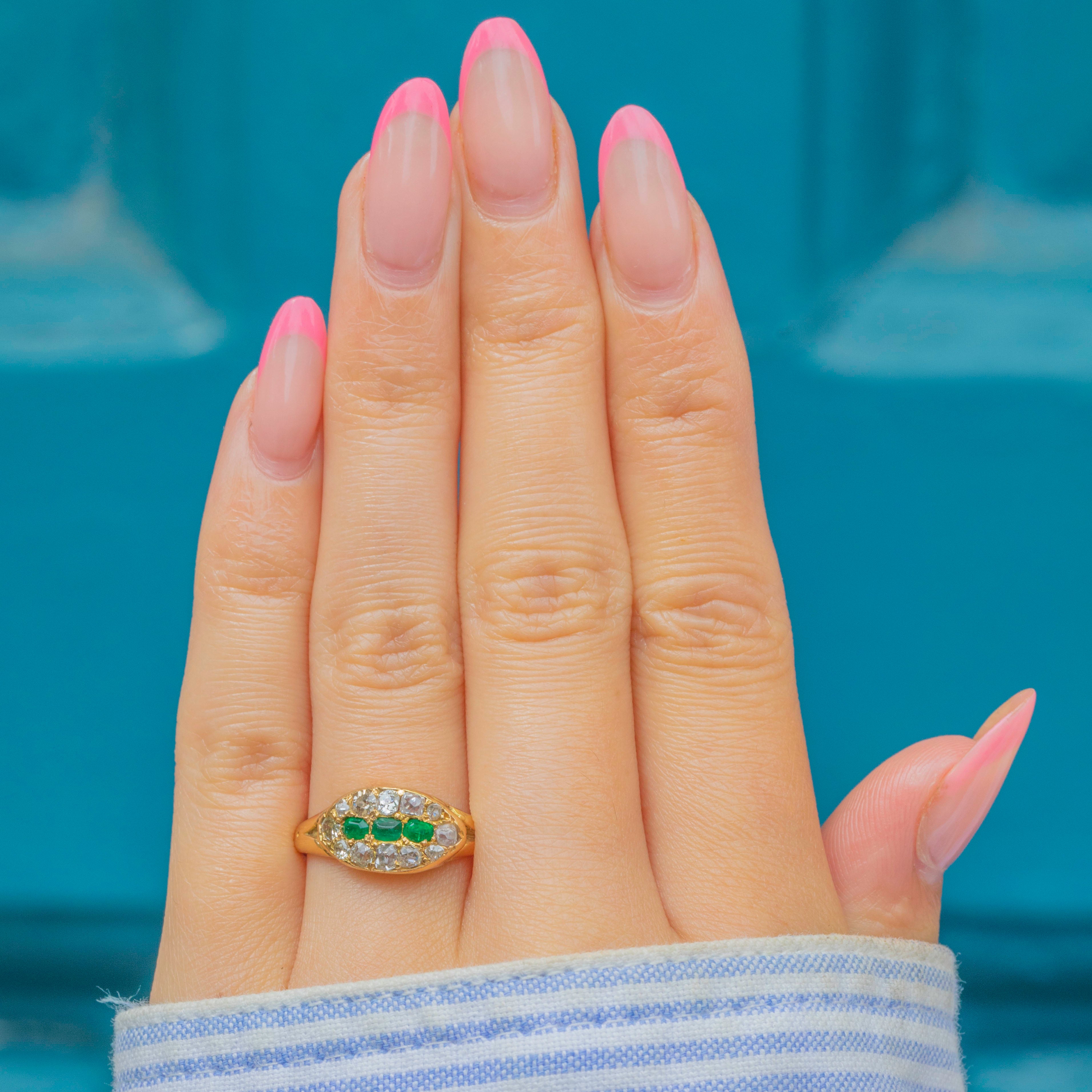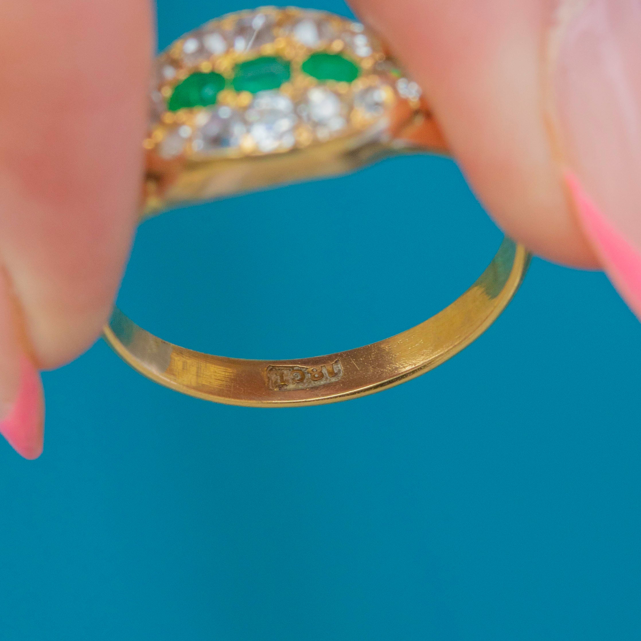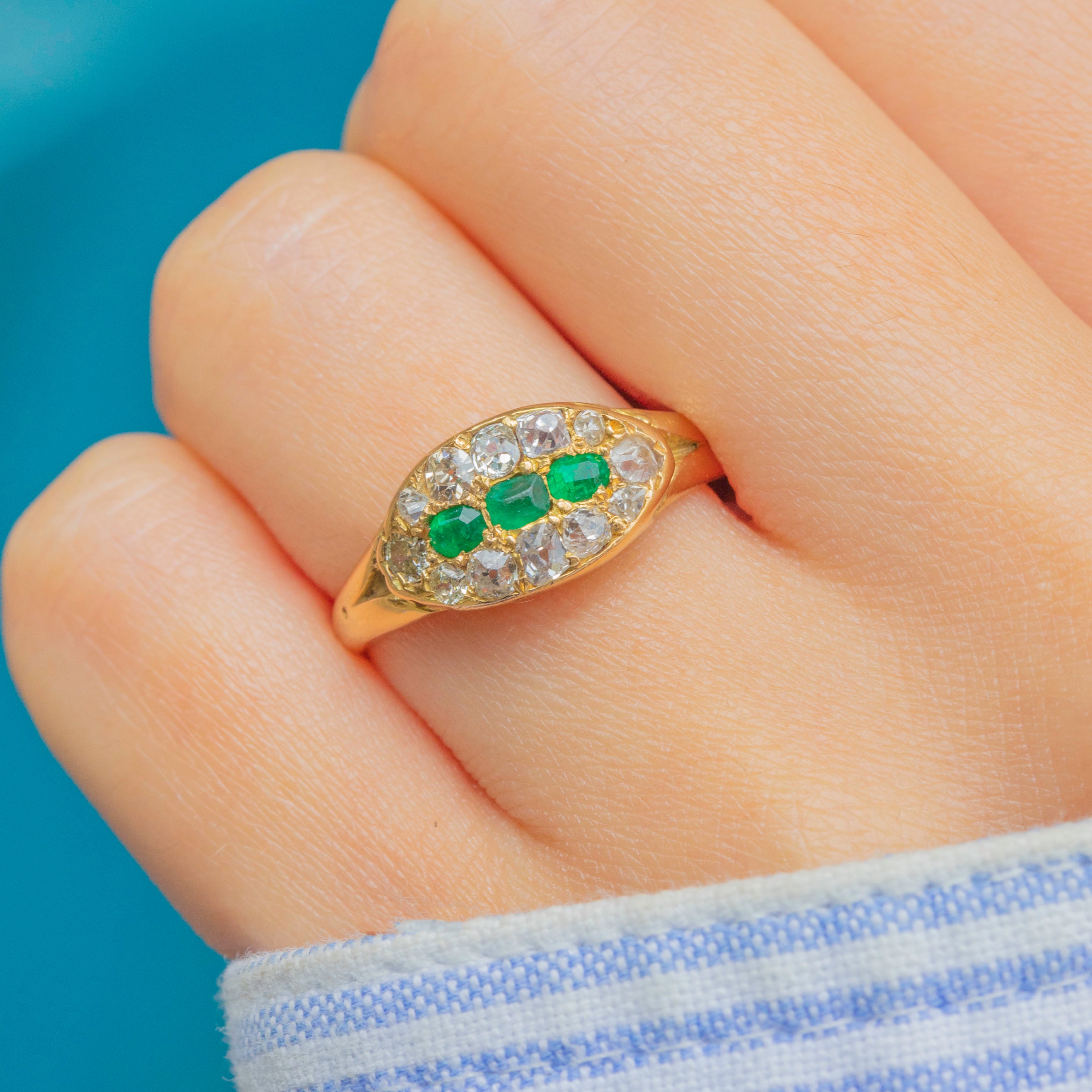 EXCELLENT: We are pleased to present this Victorian 18ct Gold Emerald Diamond east to west cluster ring in excellent condition. The gemstones are radiant and set securely within their buttery settings. There are some mild dings inside the band, though this cannot be seen when the ring is worn. The band is robust and feels comfortable to wear, promising many more years of enjoyment!