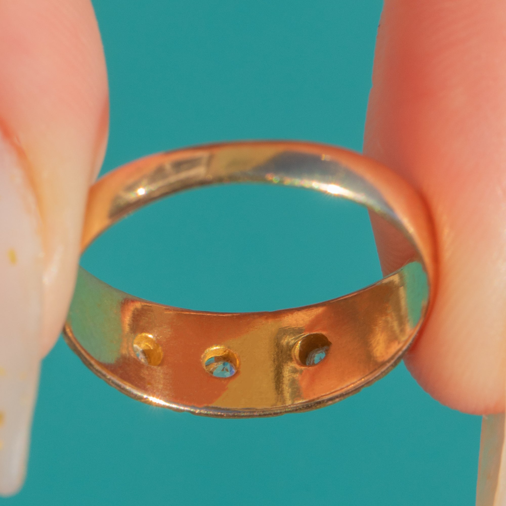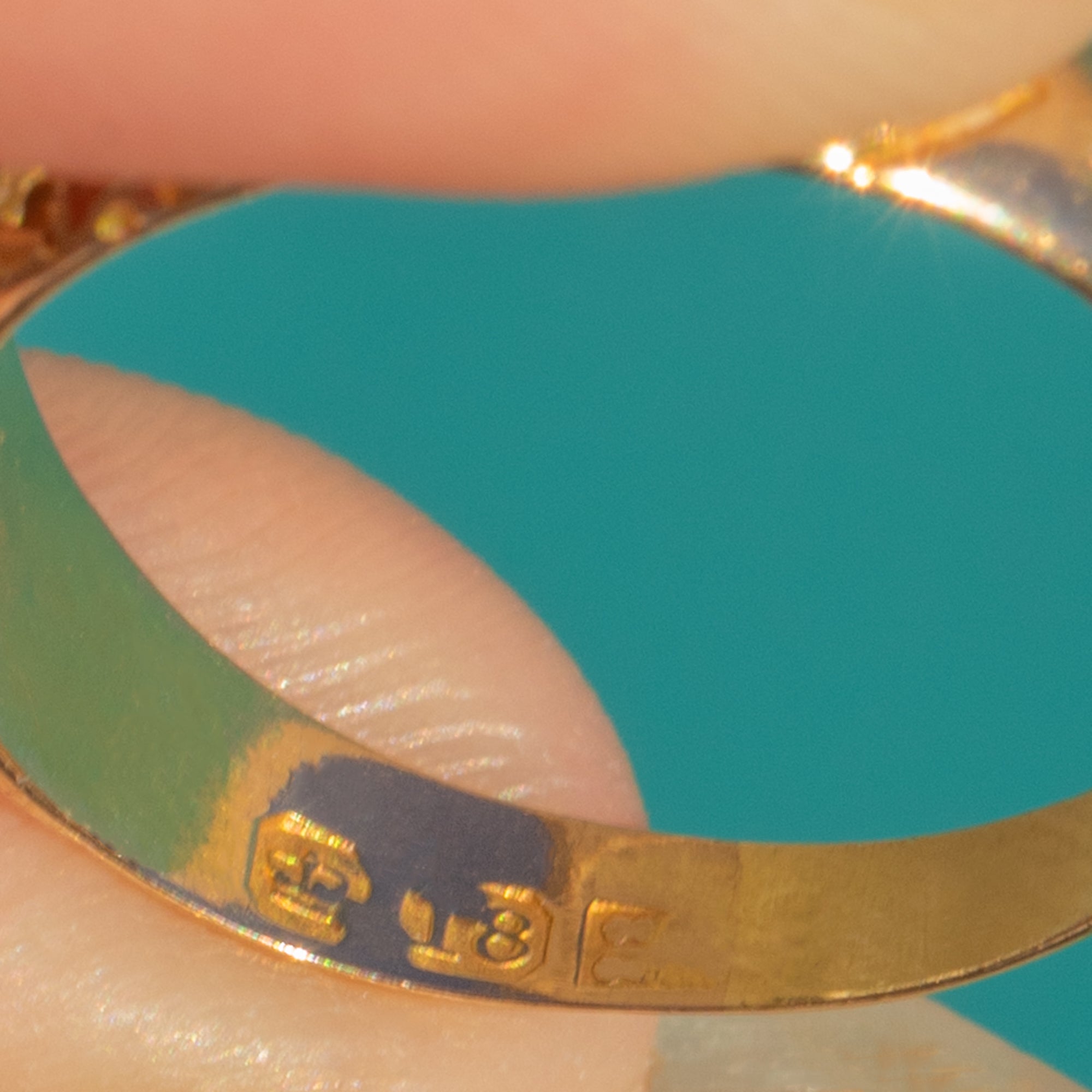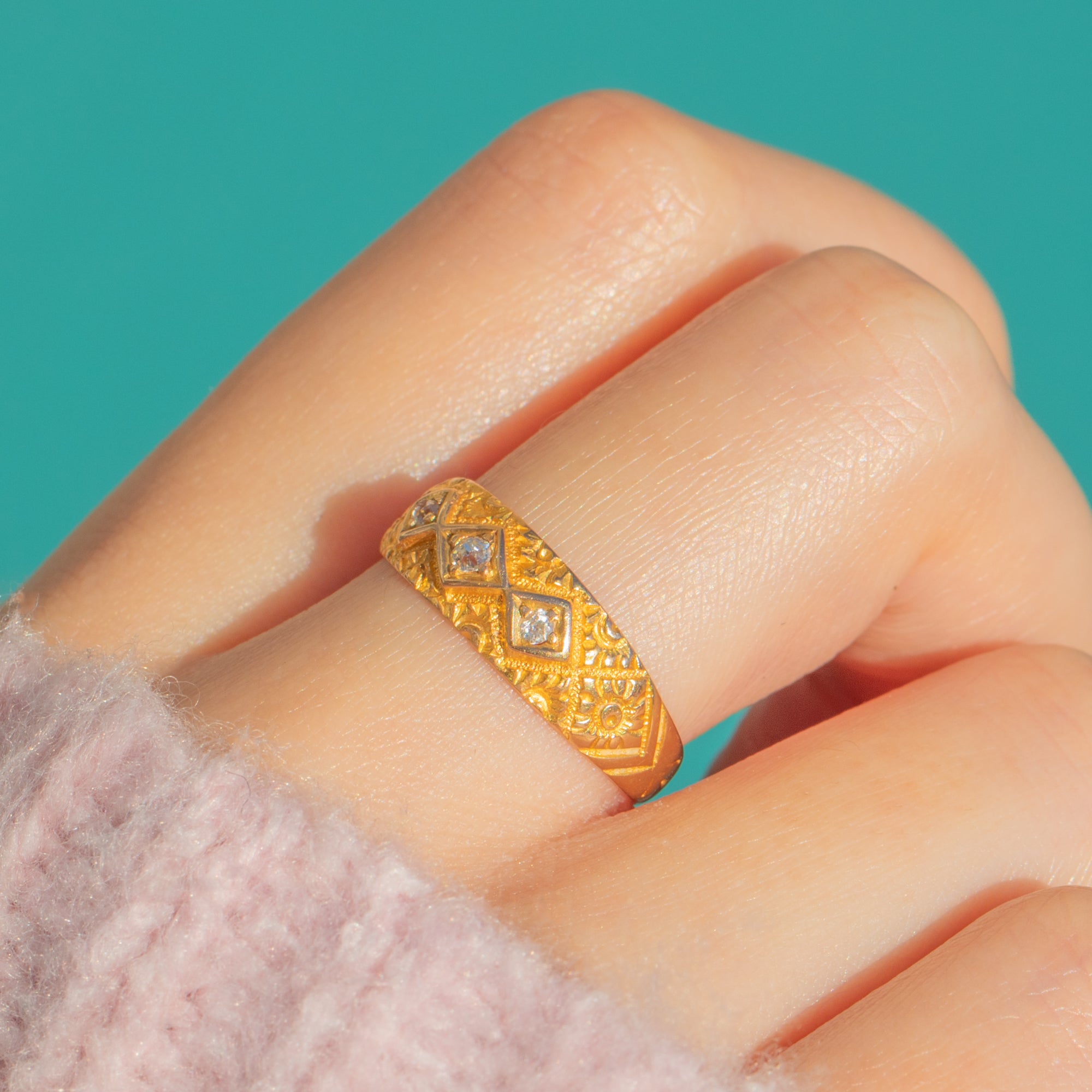 A richly engraved Victorian 18ct Gold band set with three lively Diamonds, this ring marries ornate detail with everyday ease. The surface is beautifully chased with foliate and scroll motifs, while the Diamonds are gypsy-set within geometric lozenge panels edged with delicate milgrain for a refined, antique finish. The low-profile silhouette sits smoothly on the finger—romantic, practical, and effortlessly wearable.