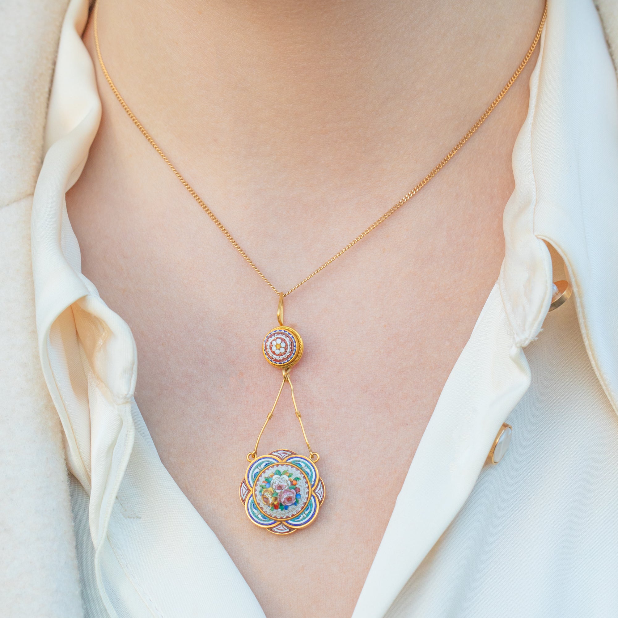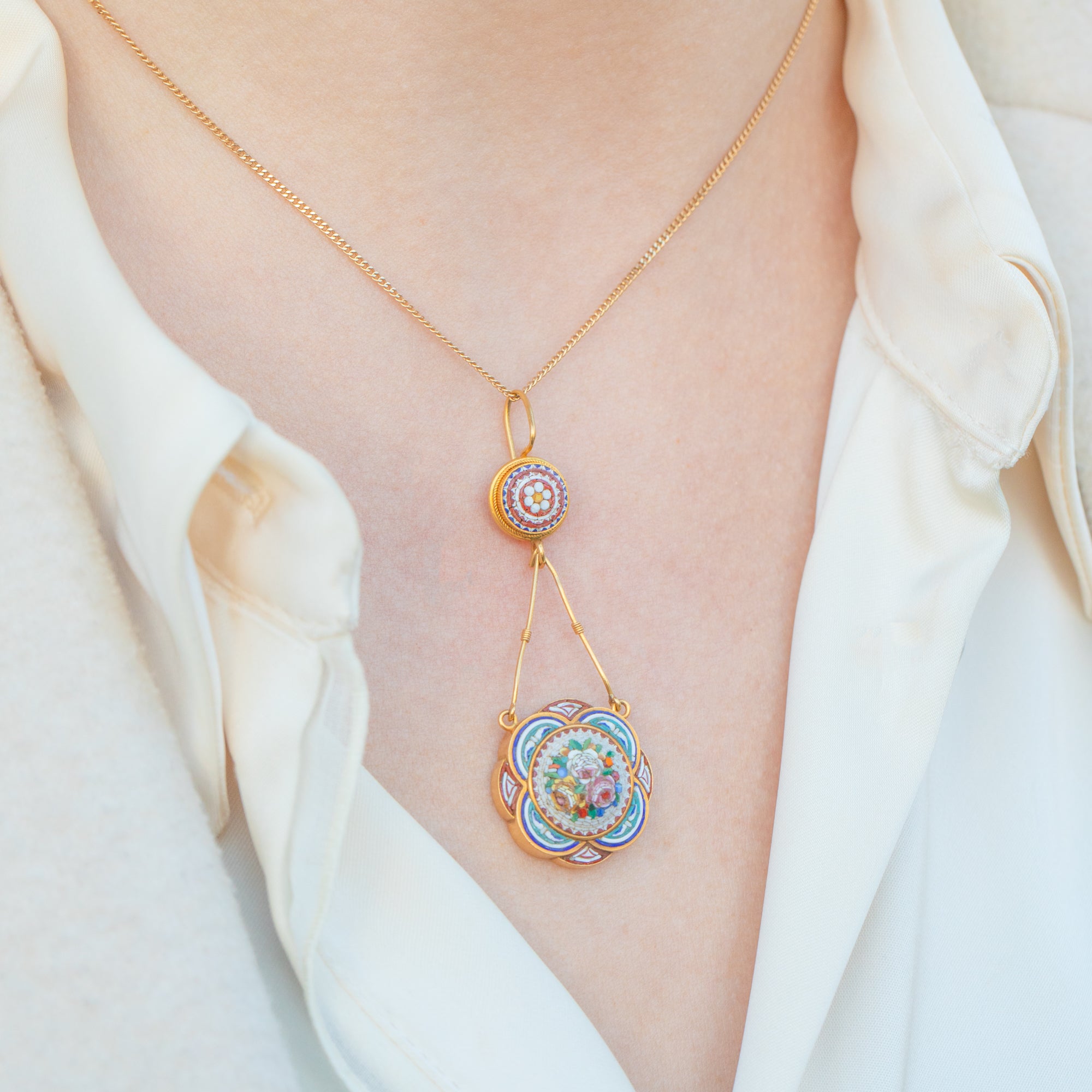 An impeccable Victorian 18ct Gold floral micro-mosaic drop pendant! This beautifully handcrafted, likely Italian, micro-mosaic pendant has been made from 18ct Gold and tiny pieces of tesserae to create a show-stopping floral design.