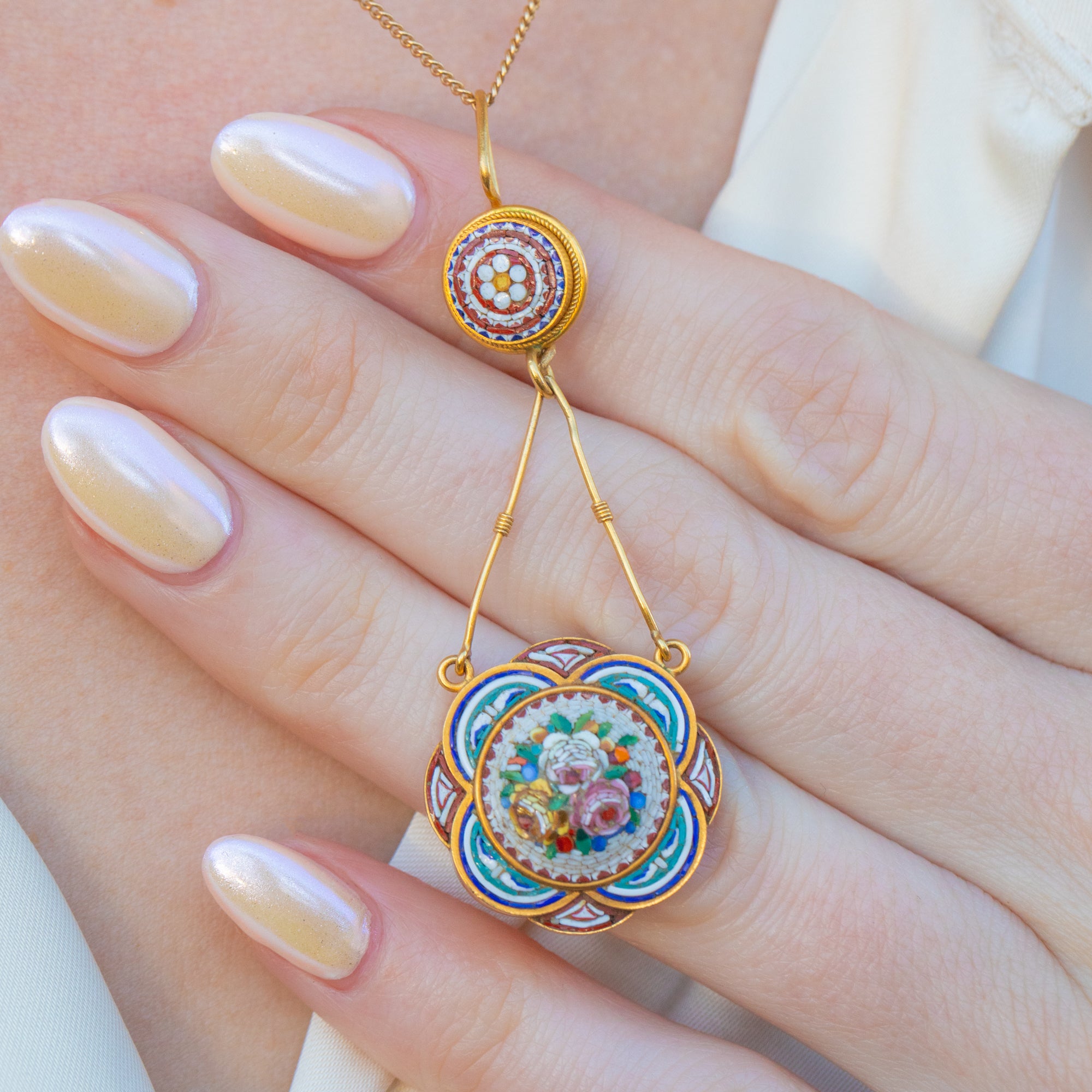 EXCELLENT. This Victorian 18ct Gold floral micro-mosaic drop pendant is in excellent condition. The pendant is smooth, and the micro mosaic pendants are all securely set into place. There is very little wear to note - this is a truly exquisite piece.