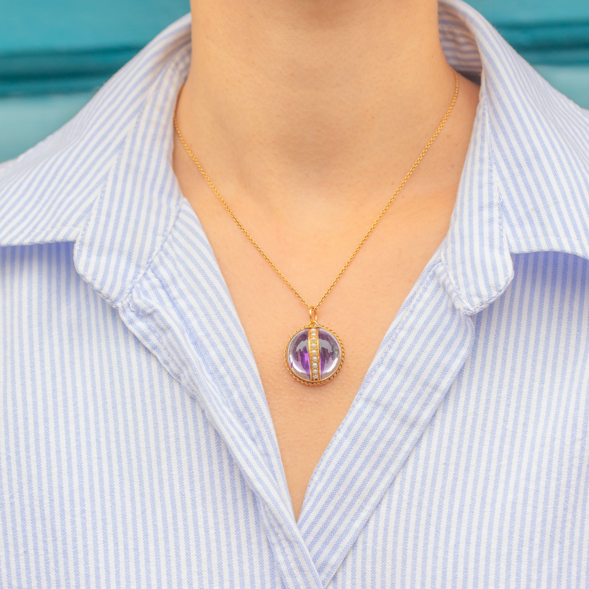 This striking Victorian pendant is crafted in rich 18ct Gold and set with a large foil-backed Quartz. The faceted stone gleams with a subtle depth and sparkle, enhanced by the traditional foil setting used throughout the 19th century to maximise brilliance.