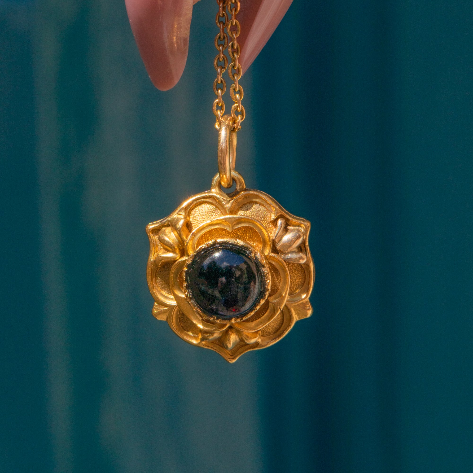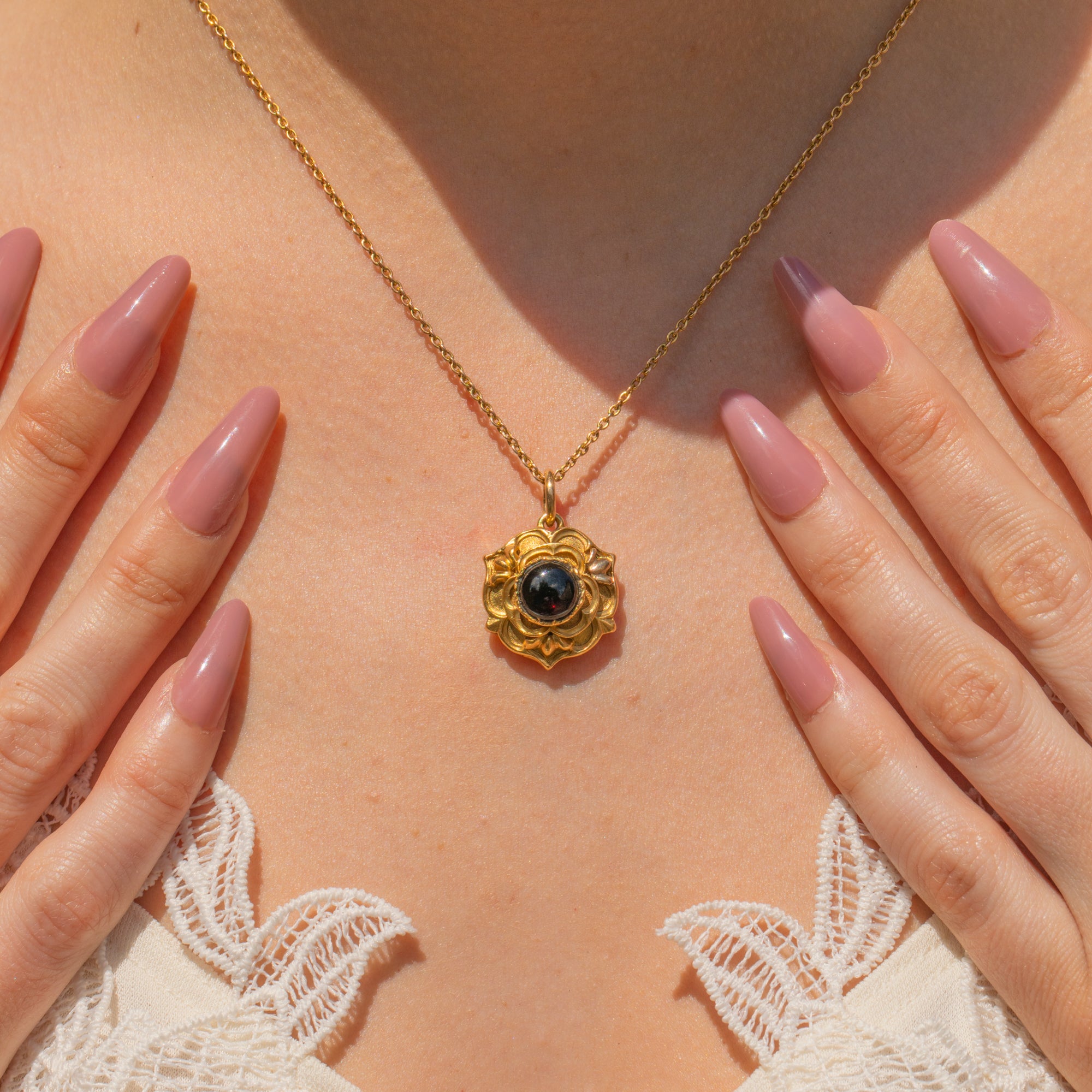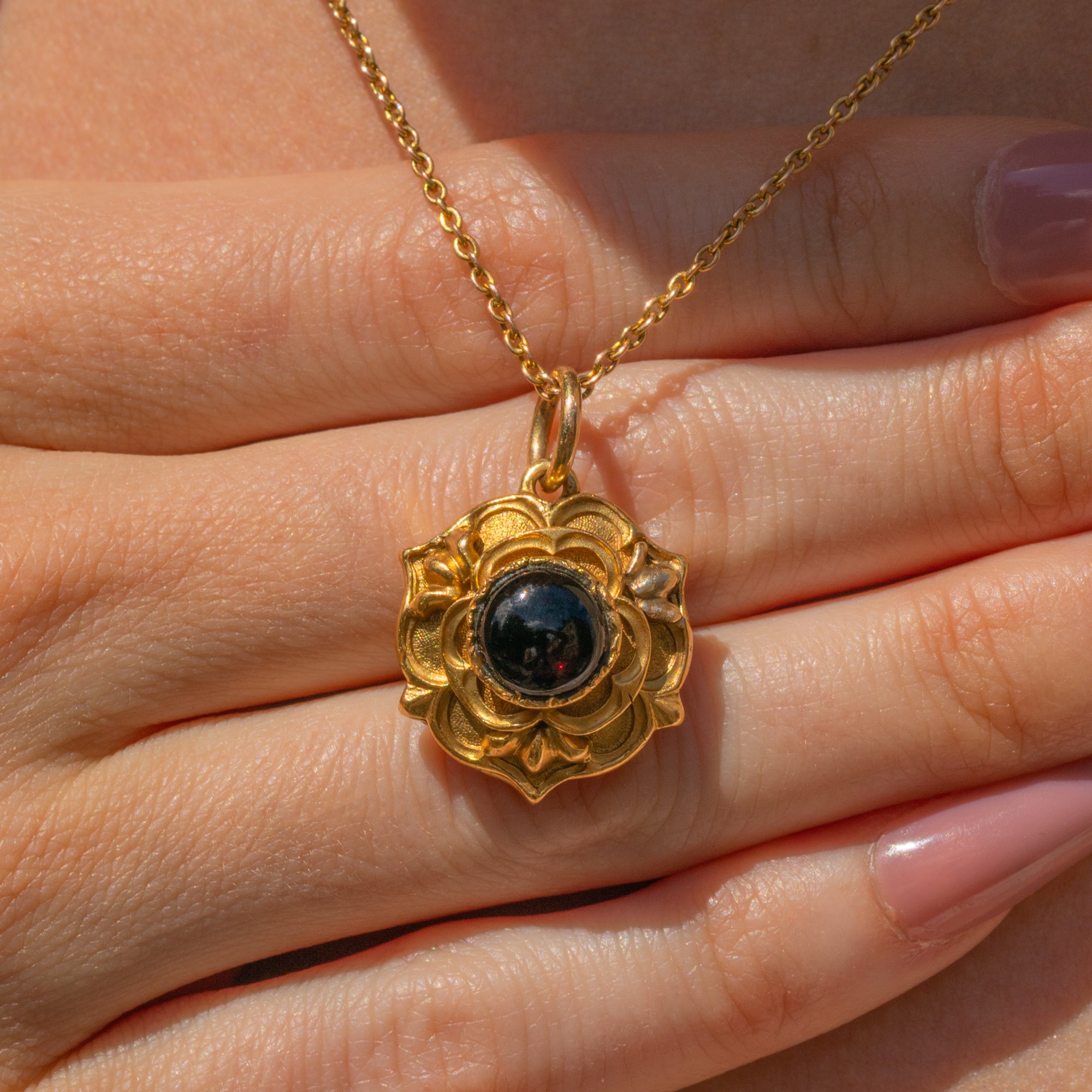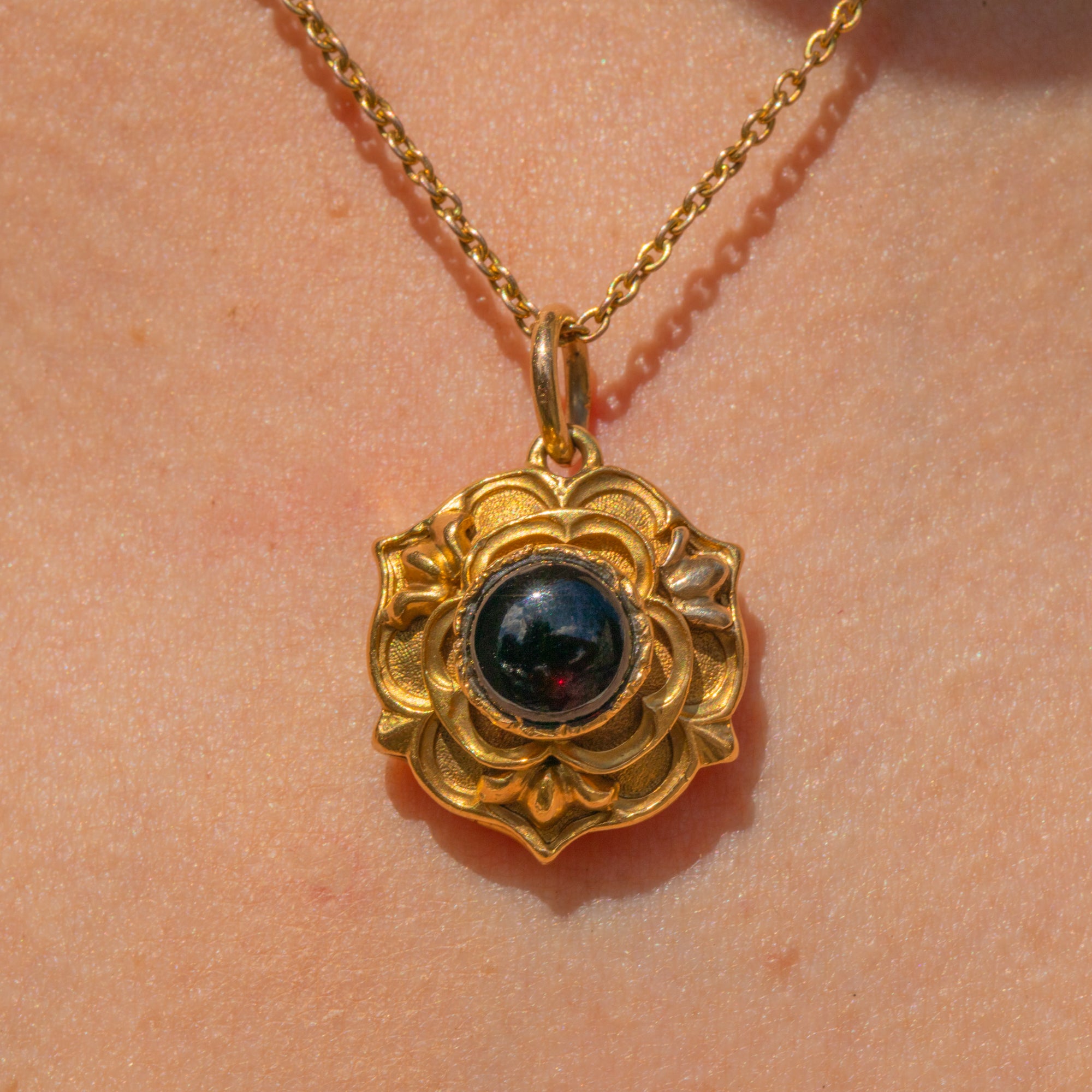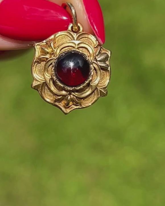 This Victorian 18ct Gold Garnet cabochon rose locket is a true beauty to behold! Inlaid with a wine hued cabochon-cut Garnet, this solid 18ct Gold locket is akin to the Tudor Rose, making this the perfect piece for history enthusiasts.