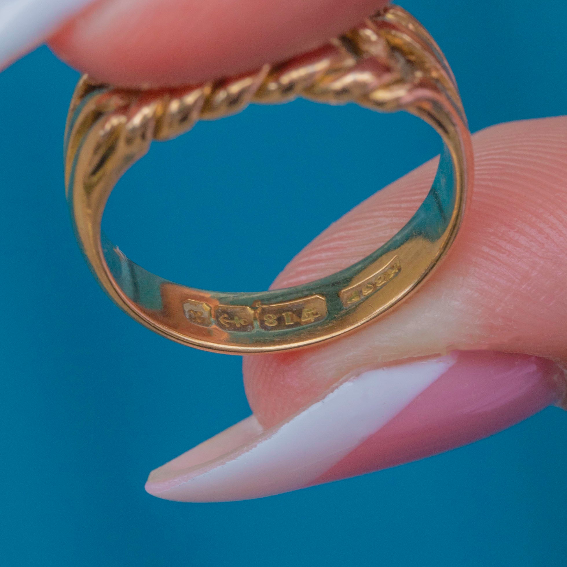 EXCELLENT: This keeper ring is in excellent condition. The chunky ring makes for comfortable wear and there is no damage to note! The hallmarks have worn down slightly over the years, but we're still able to accurately date her to 1897!