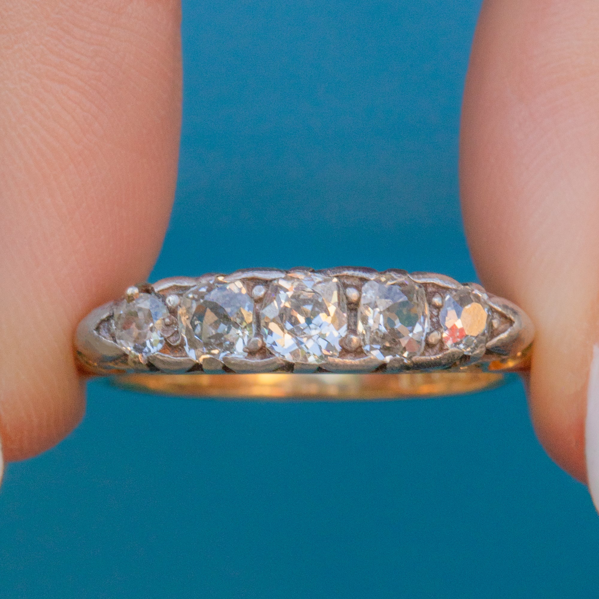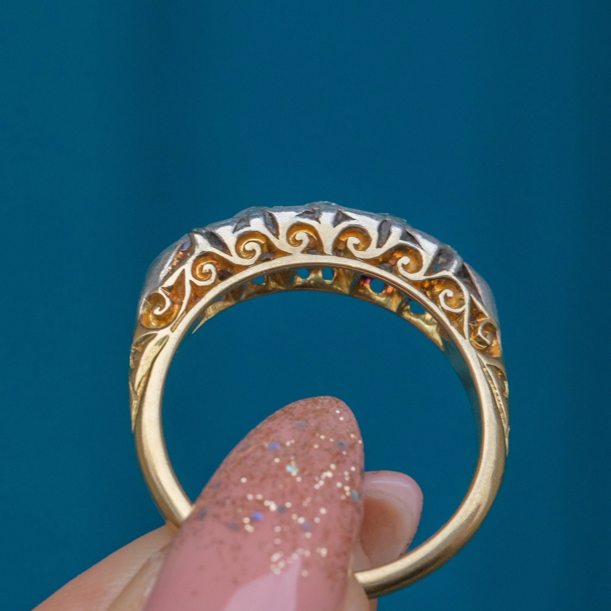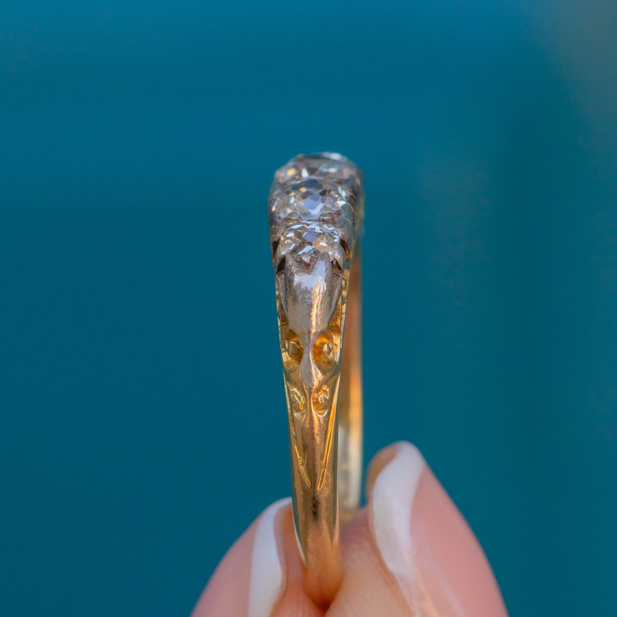 Captivate and enchant with this spellbinding Victorian 18ct Gold Old Mine-Cut Diamond five stone ring adorning your hand! Five sparkling old-mine cut Diamonds provide exceptional dazzle and coverage making this Victorian ring a compelling choice for an ultra-special engagement ring.