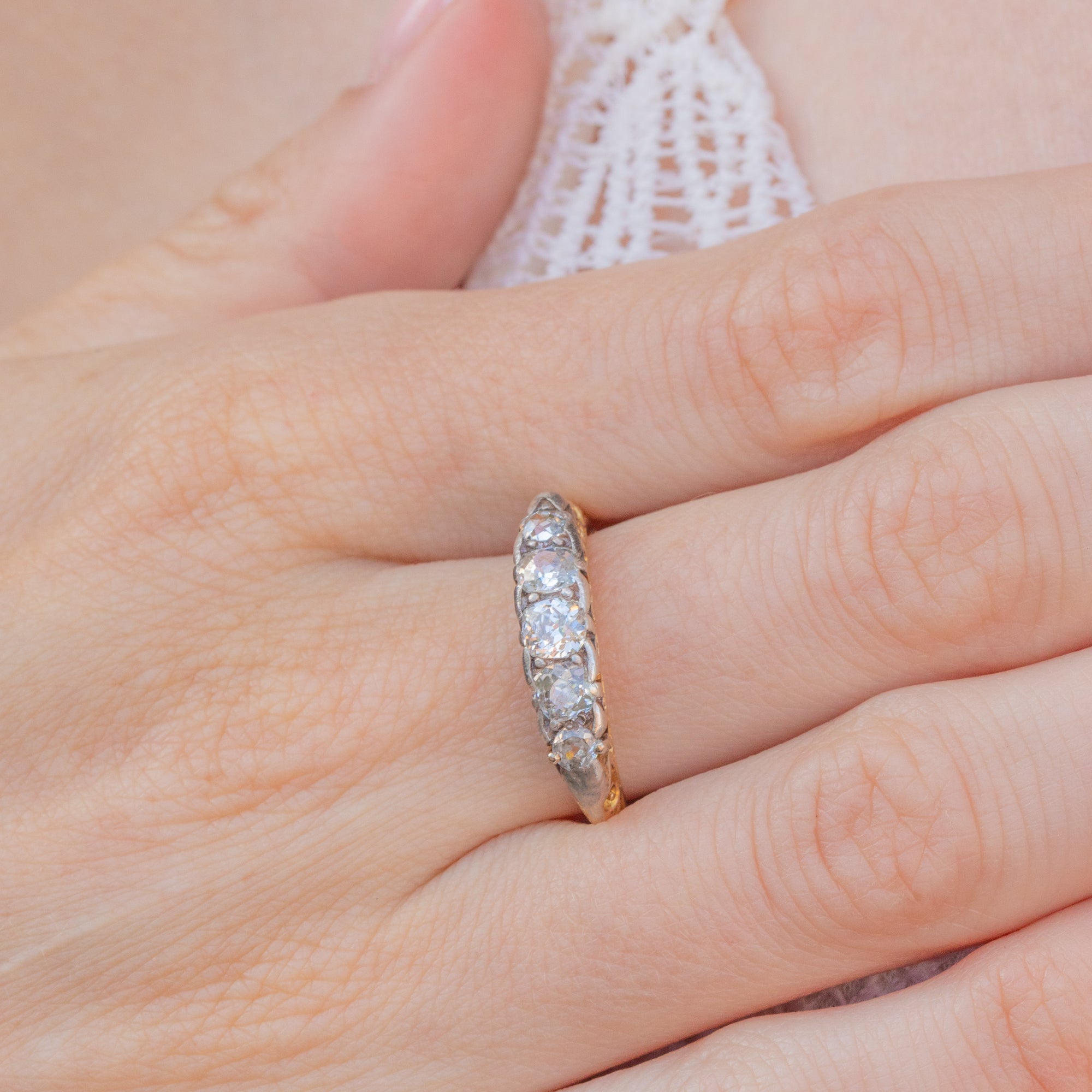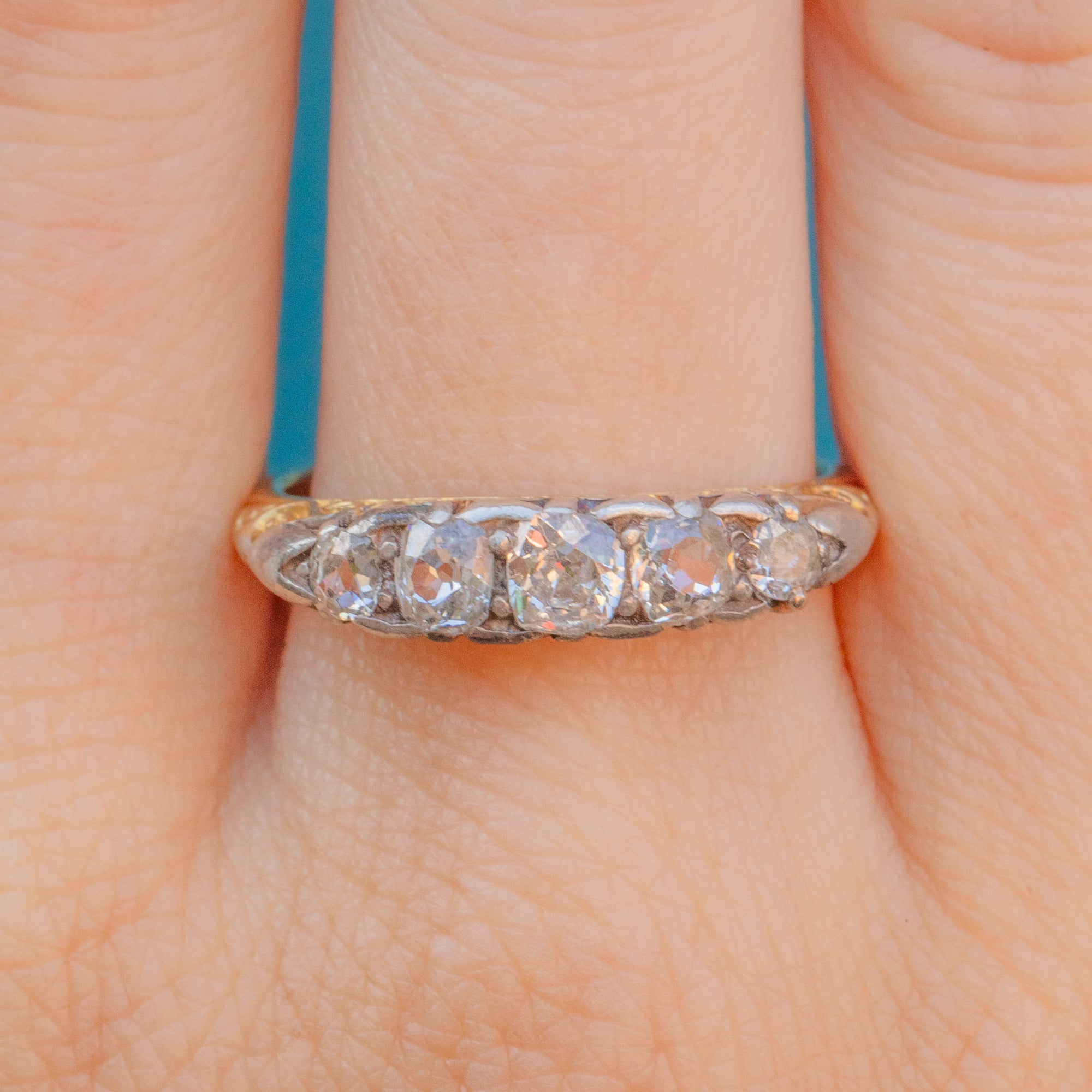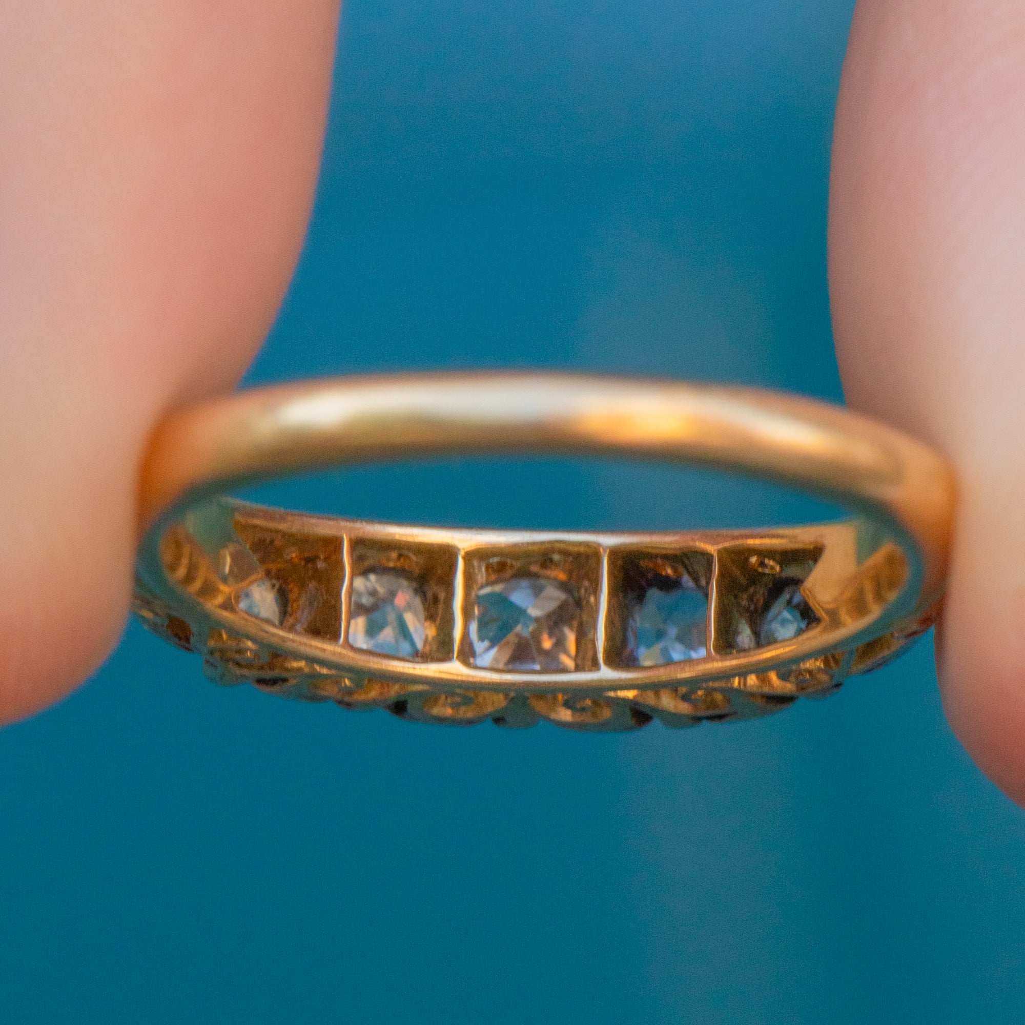 Captivate and enchant with this spellbinding Victorian 18ct Gold Old Mine-Cut Diamond five stone ring adorning your hand! Five sparkling old-mine cut Diamonds provide exceptional dazzle and coverage making this Victorian ring a compelling choice for an ultra-special engagement ring.