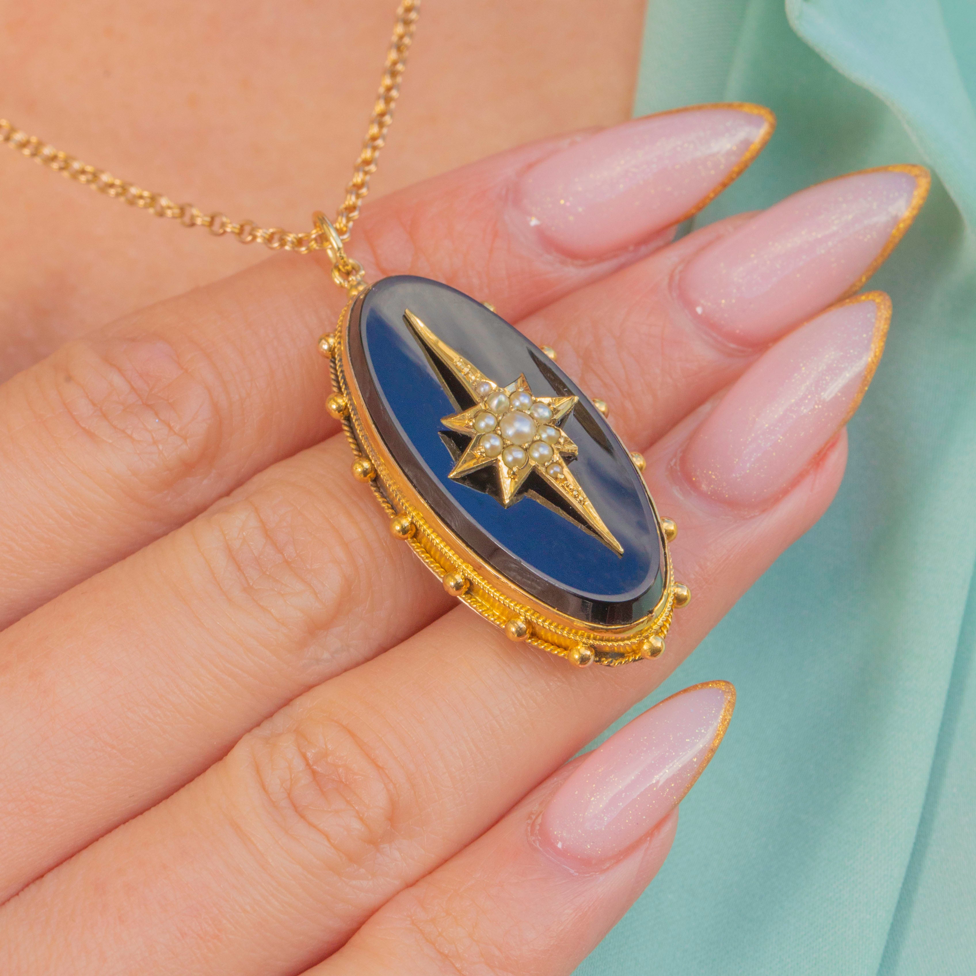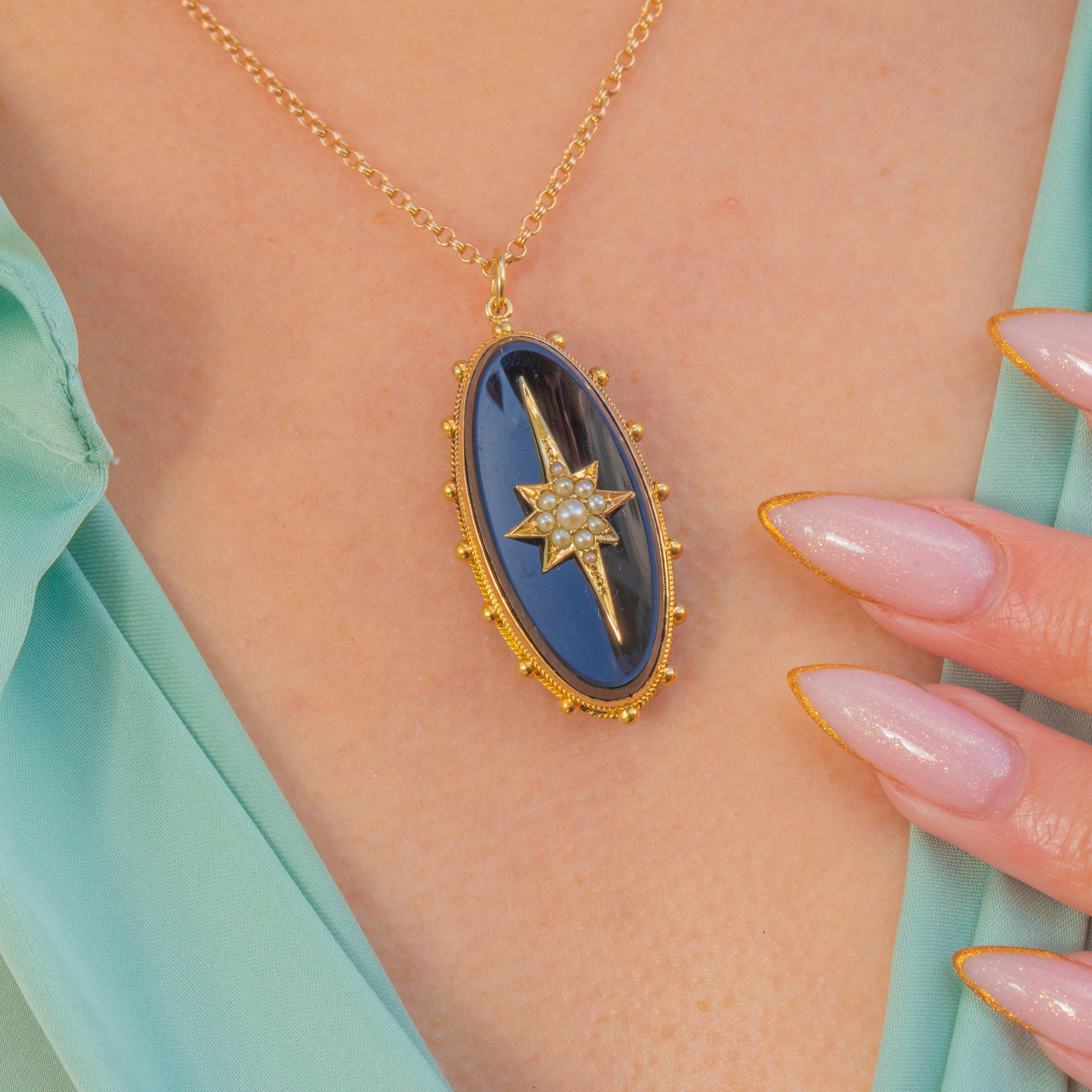 A spectacular Victorian starburst locket pendant crafted in rich 18ct Gold, glossy black Onyx and a halo of lustrous Natural Pearls. The dramatic contrast between midnight-black Onyx and the glowing buttery Gold gives this piece that unmistakable high-Victorian opulence, while the radiant Pearl starburst brings celestial charm to the design.