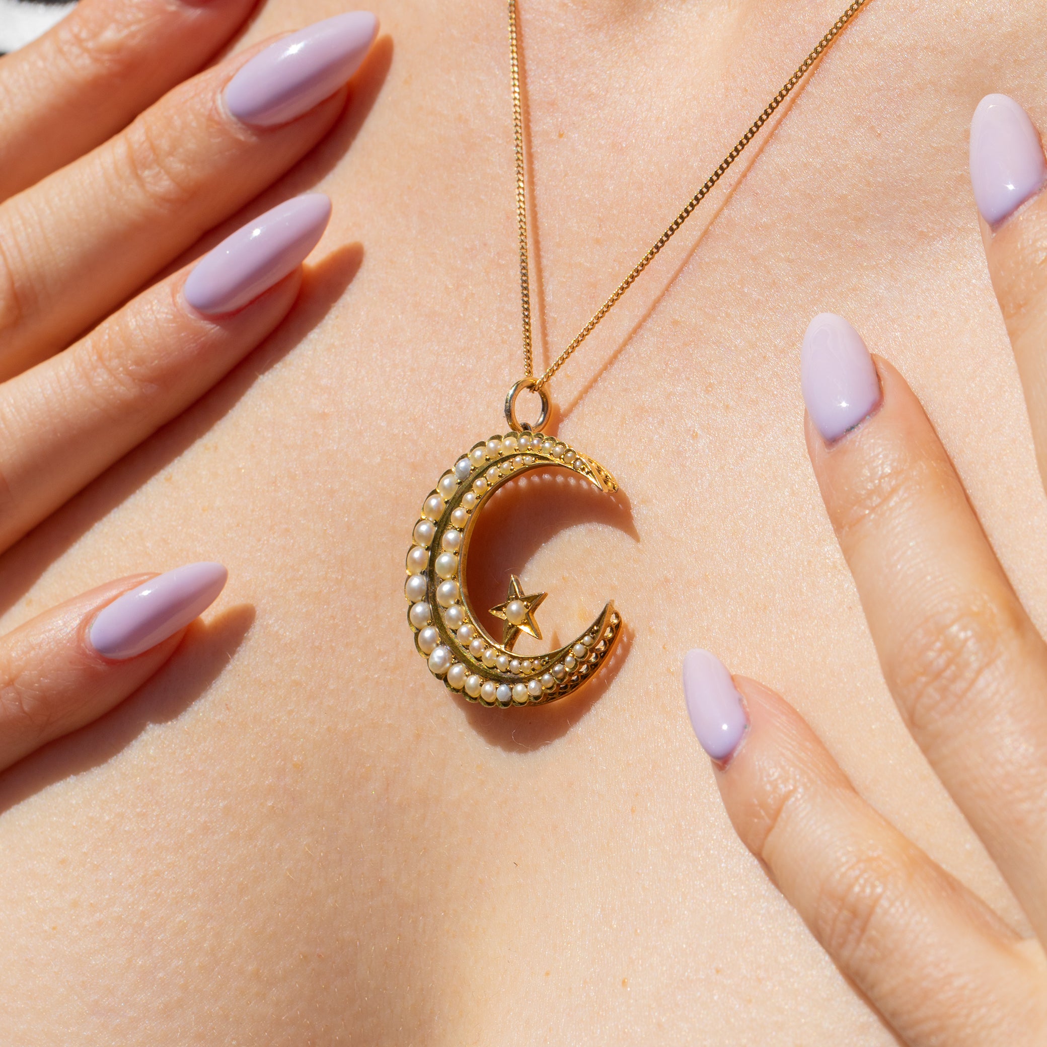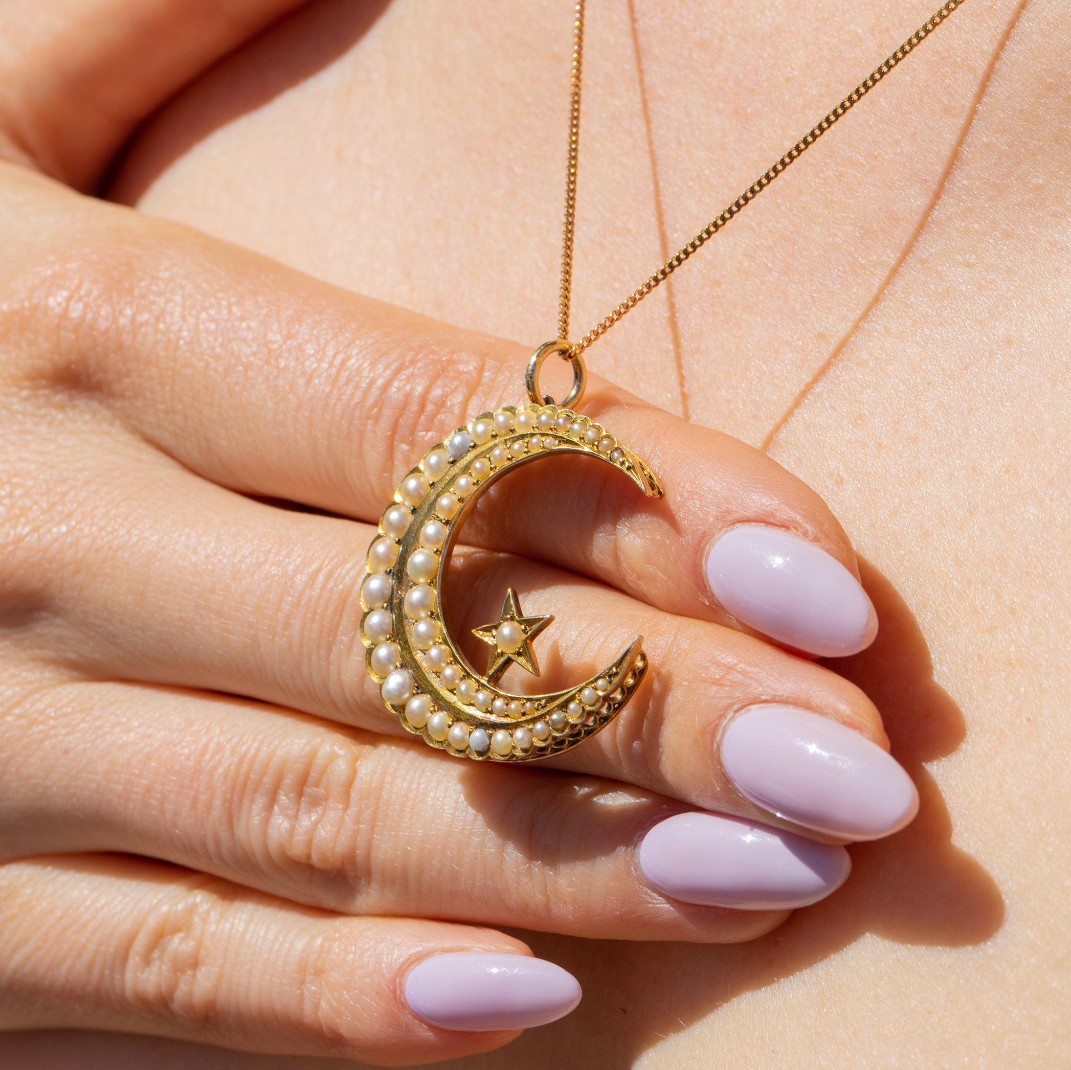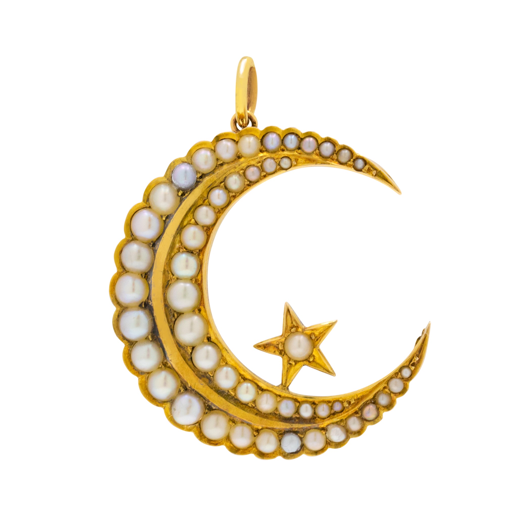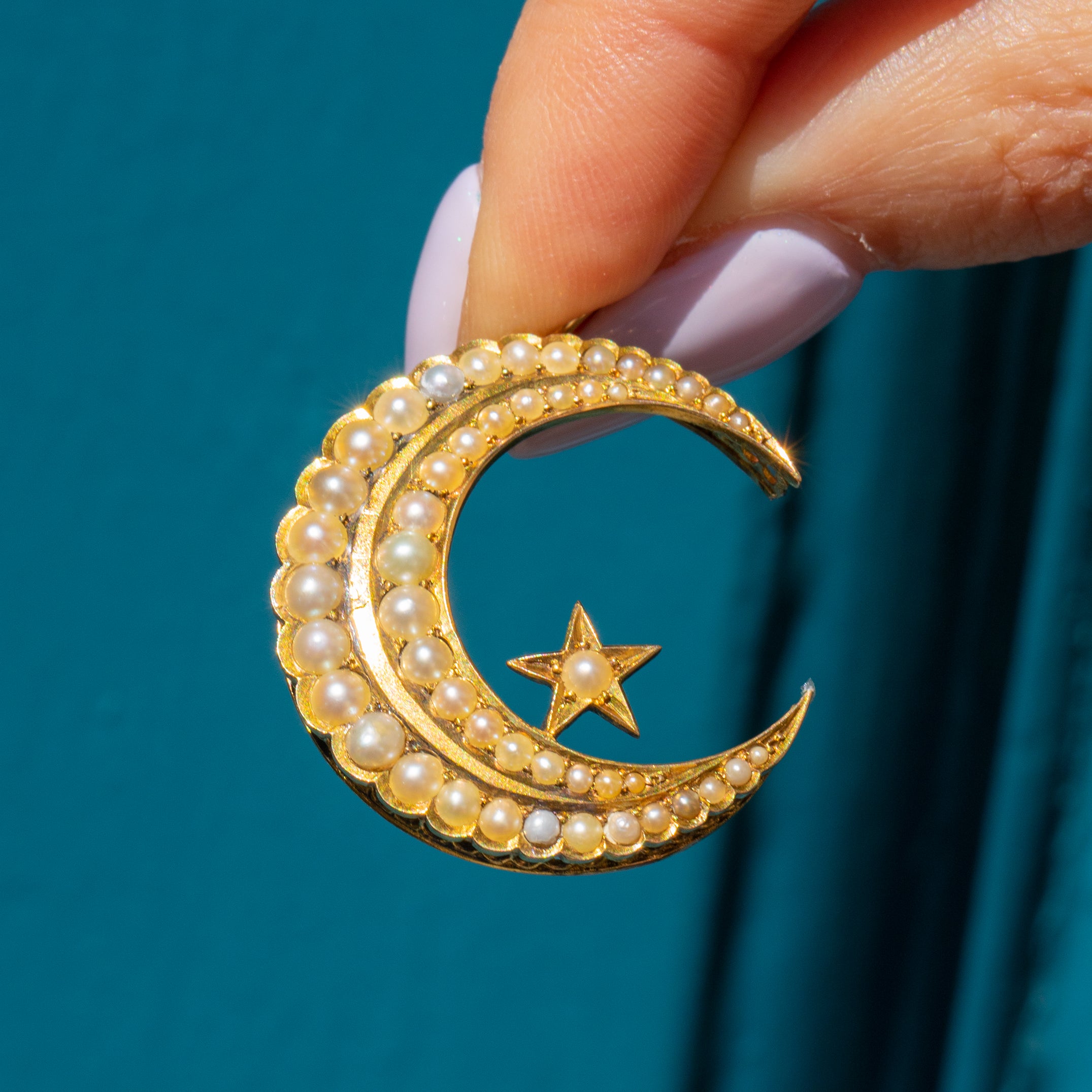 We have been left starstruck by this Victorian 18ct Gold Pearl crescent moon & star pendant. Sprinkled with a generous helping of lustrous Pearls, this luxurious treasure is also steeped in symbolism!