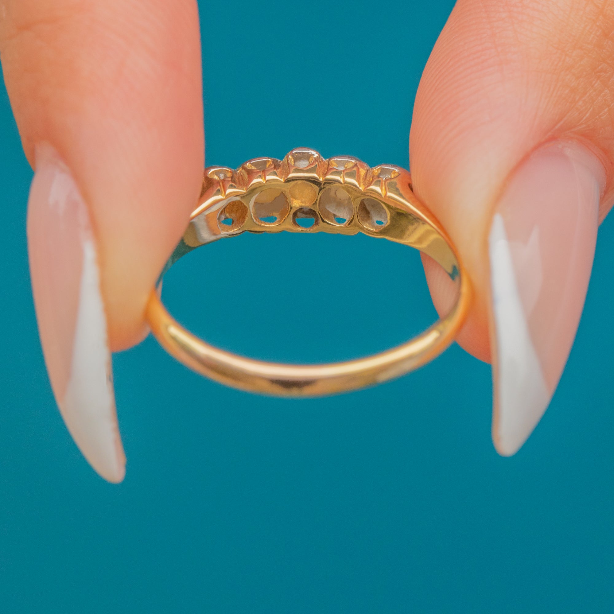 This Victorian ring is crafted in 18ct Gold and set with lustrous Pearls and twinkling rose-cut Diamonds.