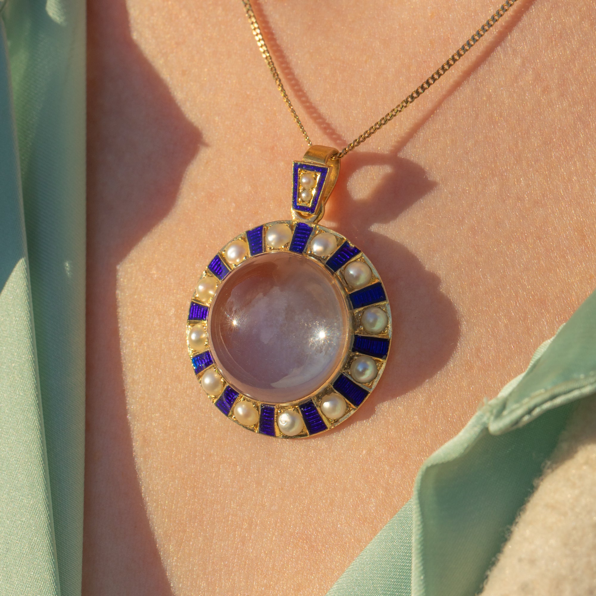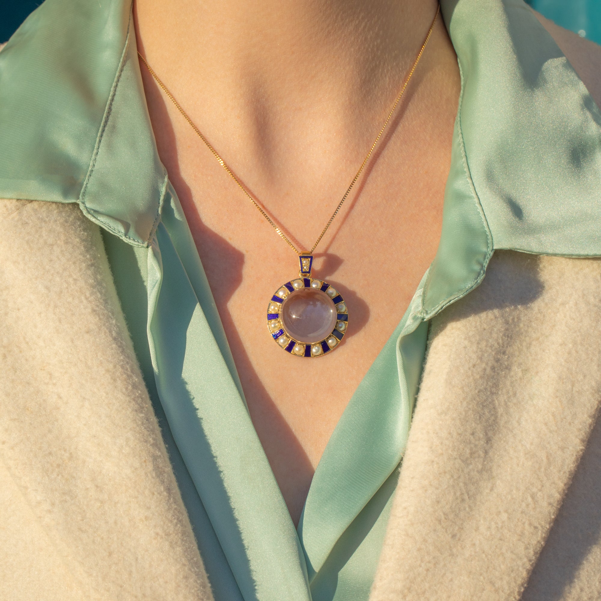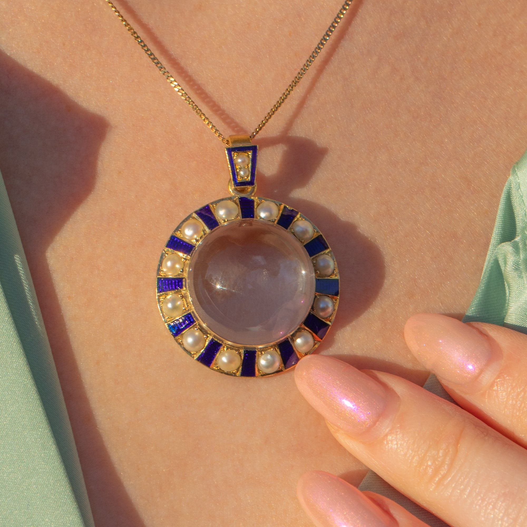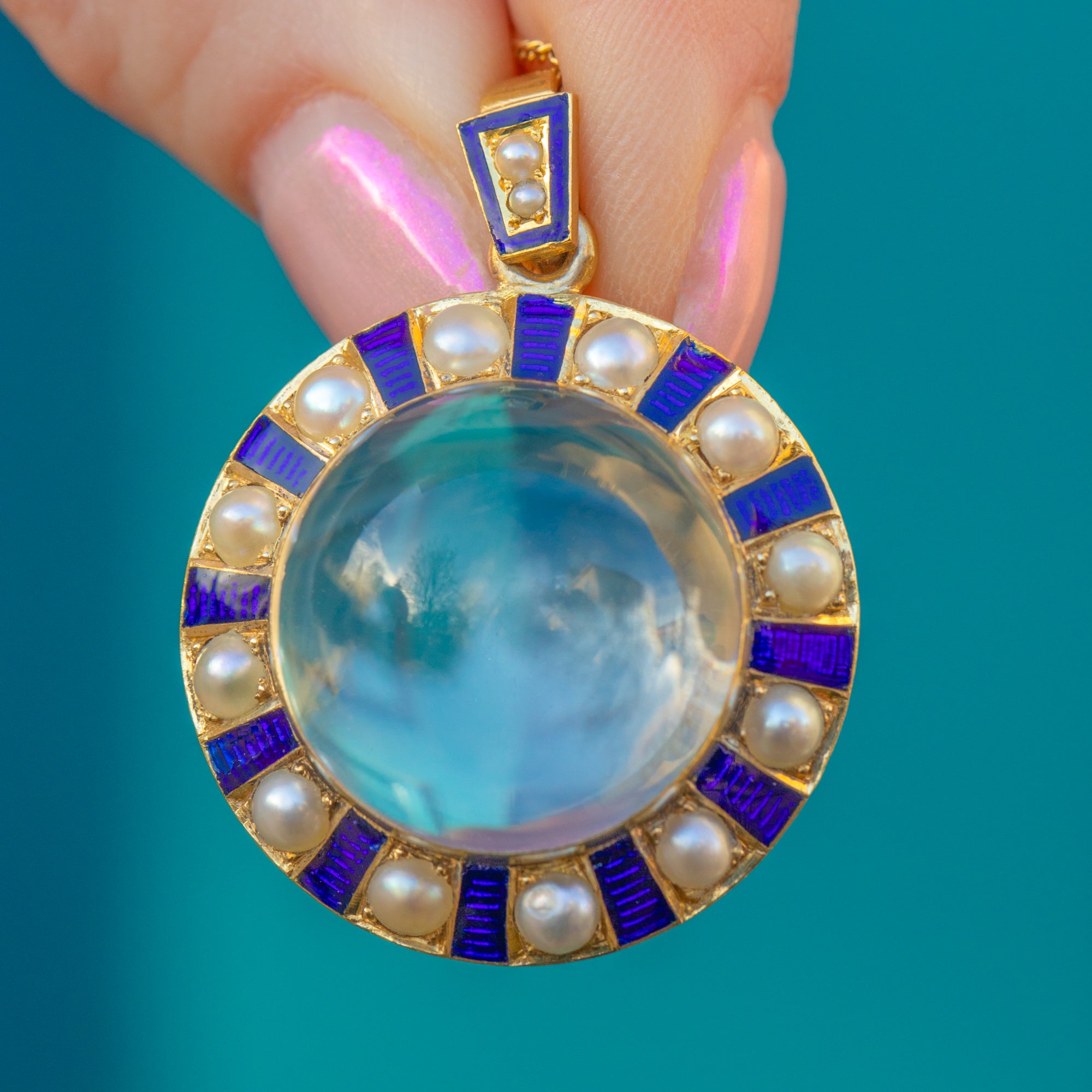 Crafted from lustrous 18ct Gold, this antique pendant features a plump Quartz at her centre. Her round Rock crystal is beautifully translucent, even functioning as a locket if you so desire. She is adorned by a halo of interchanging iridescent Pearls and blue Enamel, arranged in a wonderfully unique pattern, with each gemstone catching the light wonderfully.