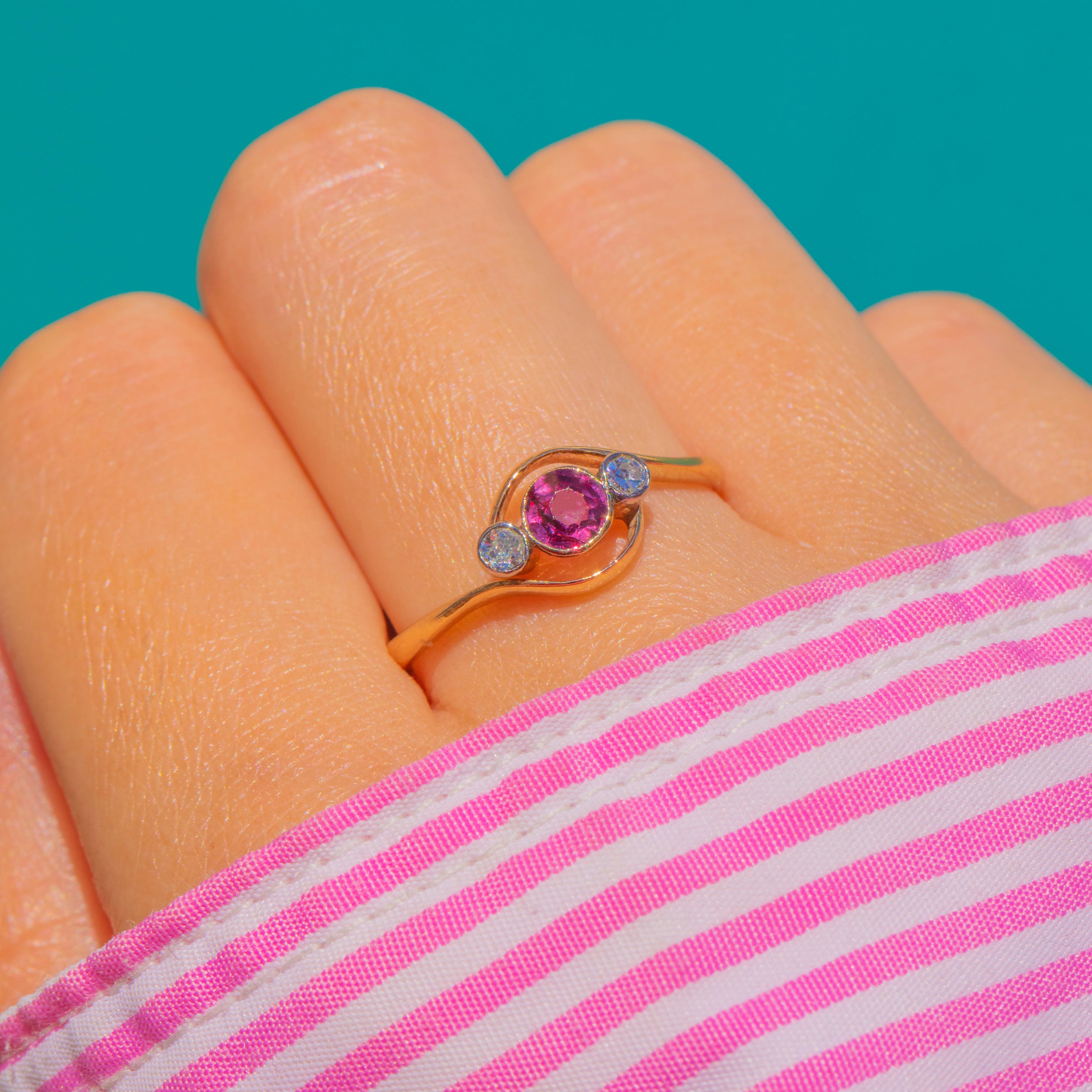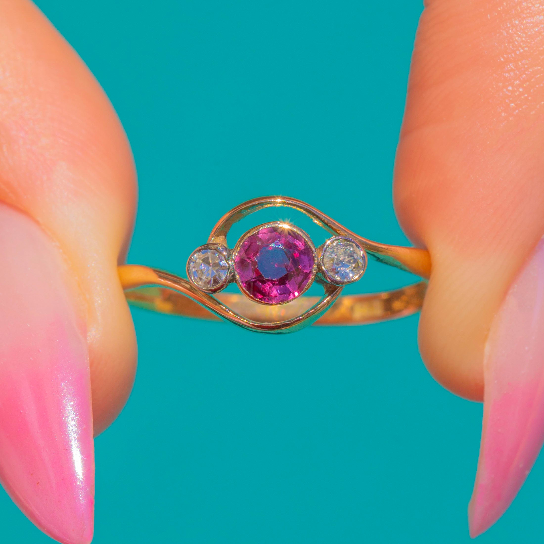 A refined Victorian twist ring in rich 18ct Gold, set with a glowing round Ruby embraced by two sparkling round Diamonds. The trio is secured in smooth collet settings that flow seamlessly into elegant, scrolling shoulders for a beautifully fluid, romantic silhouette.