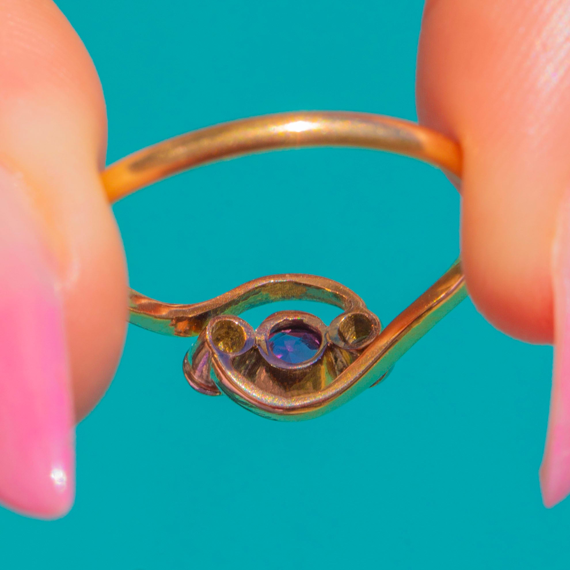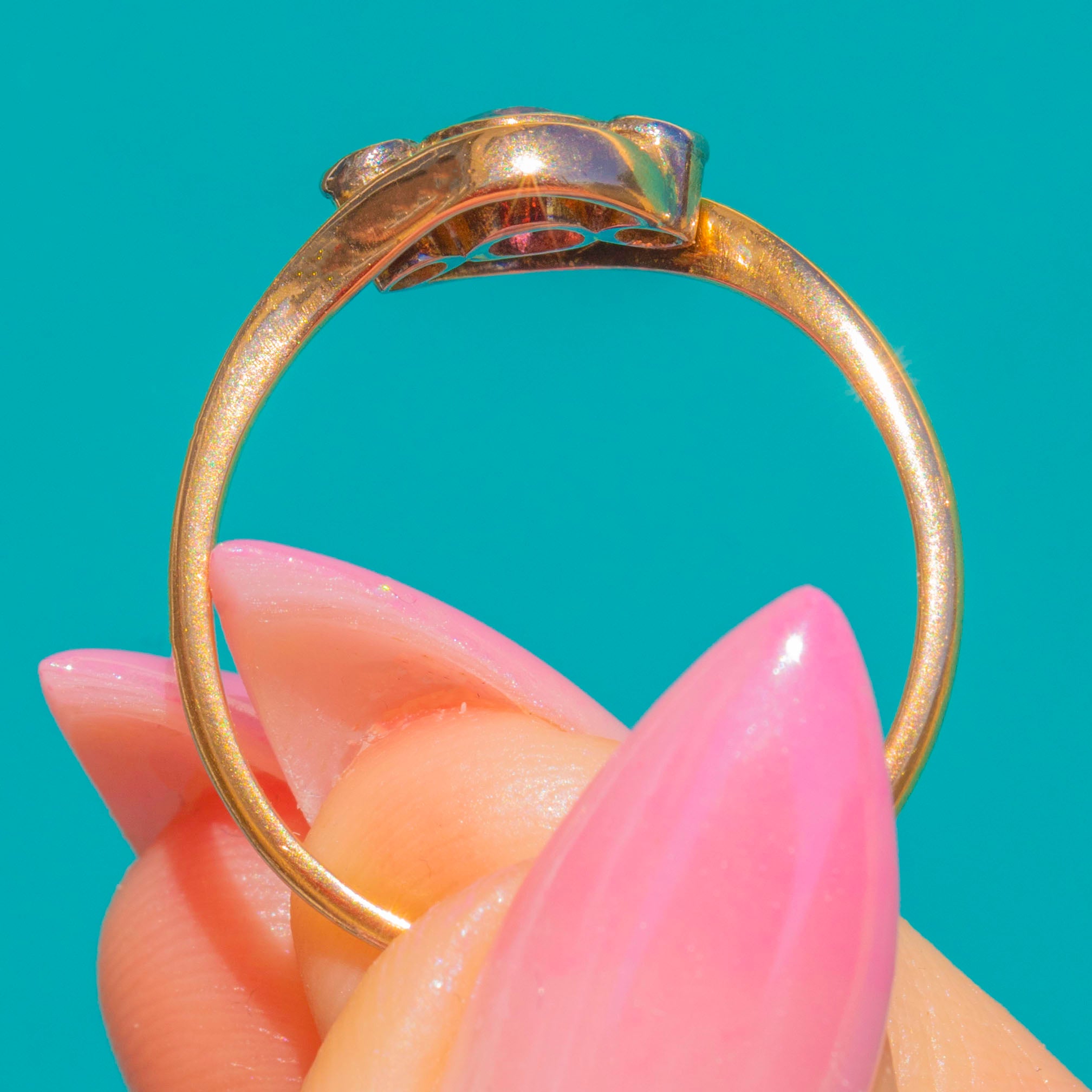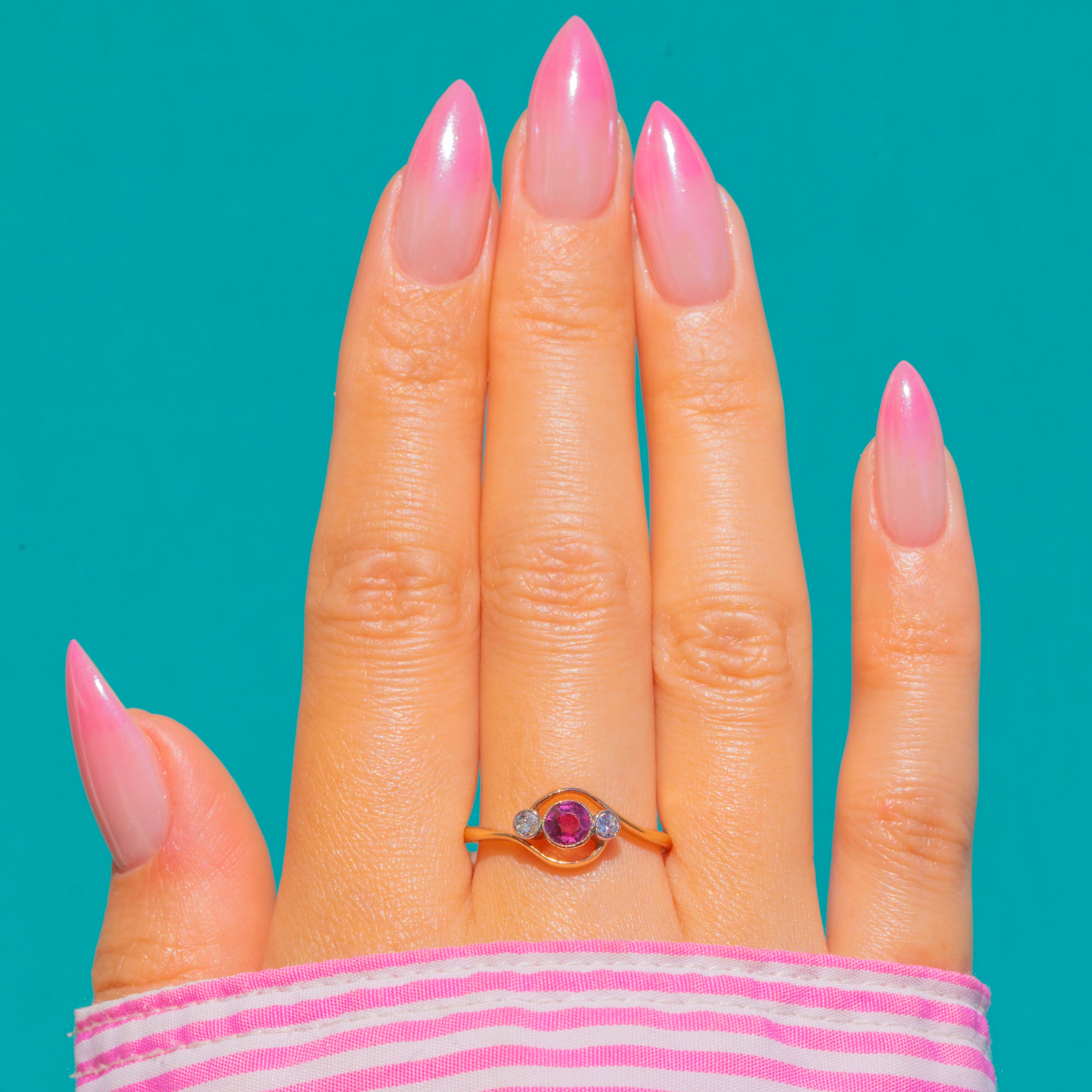 The warm Yellow Gold amplifies the Ruby’s vivid hue while the Diamonds add a delicate kiss of brightness at each side. Stamped 18CT and testing as 18ct Gold, this charming three-stone ring is an effortlessly wearable antique treasure with timeless appeal.