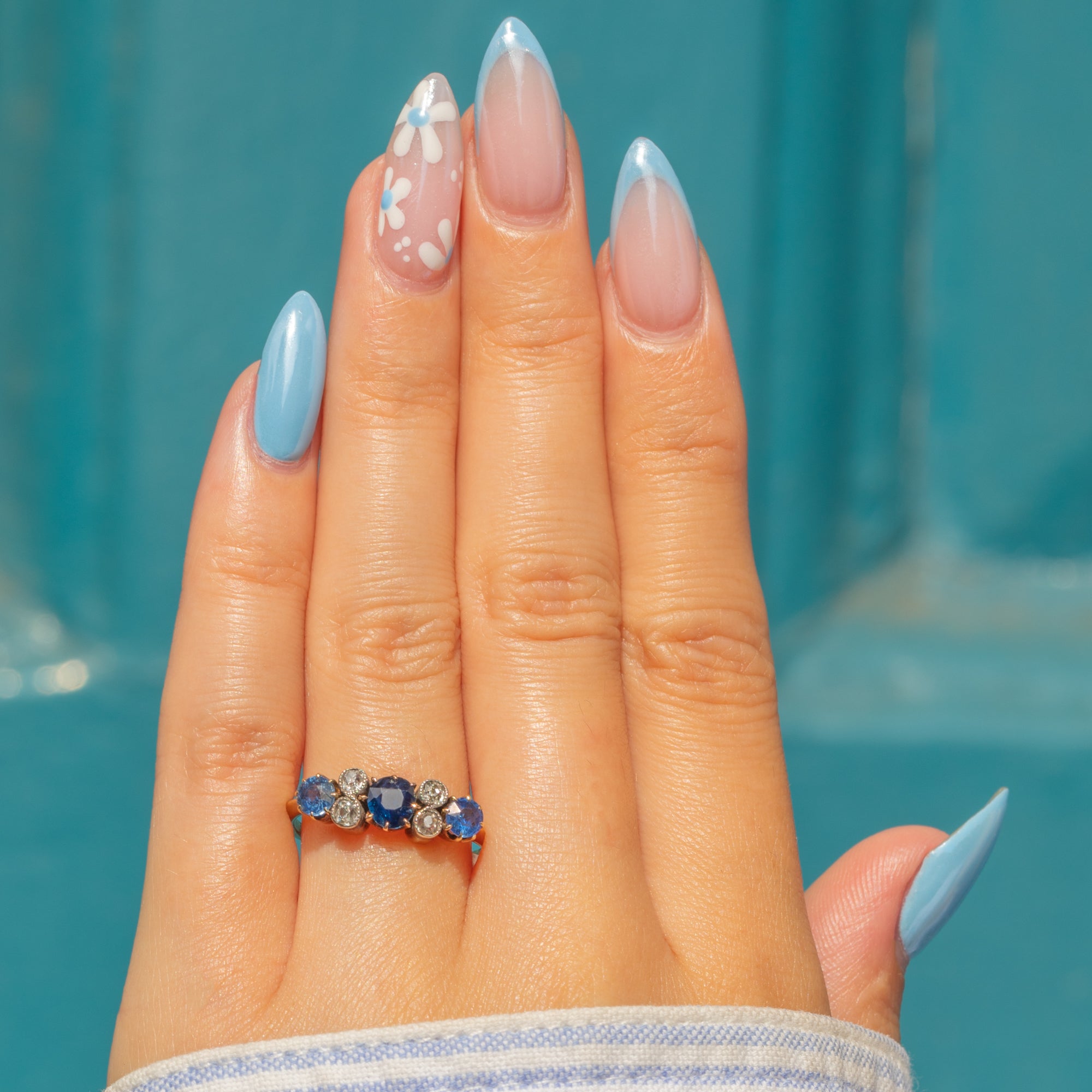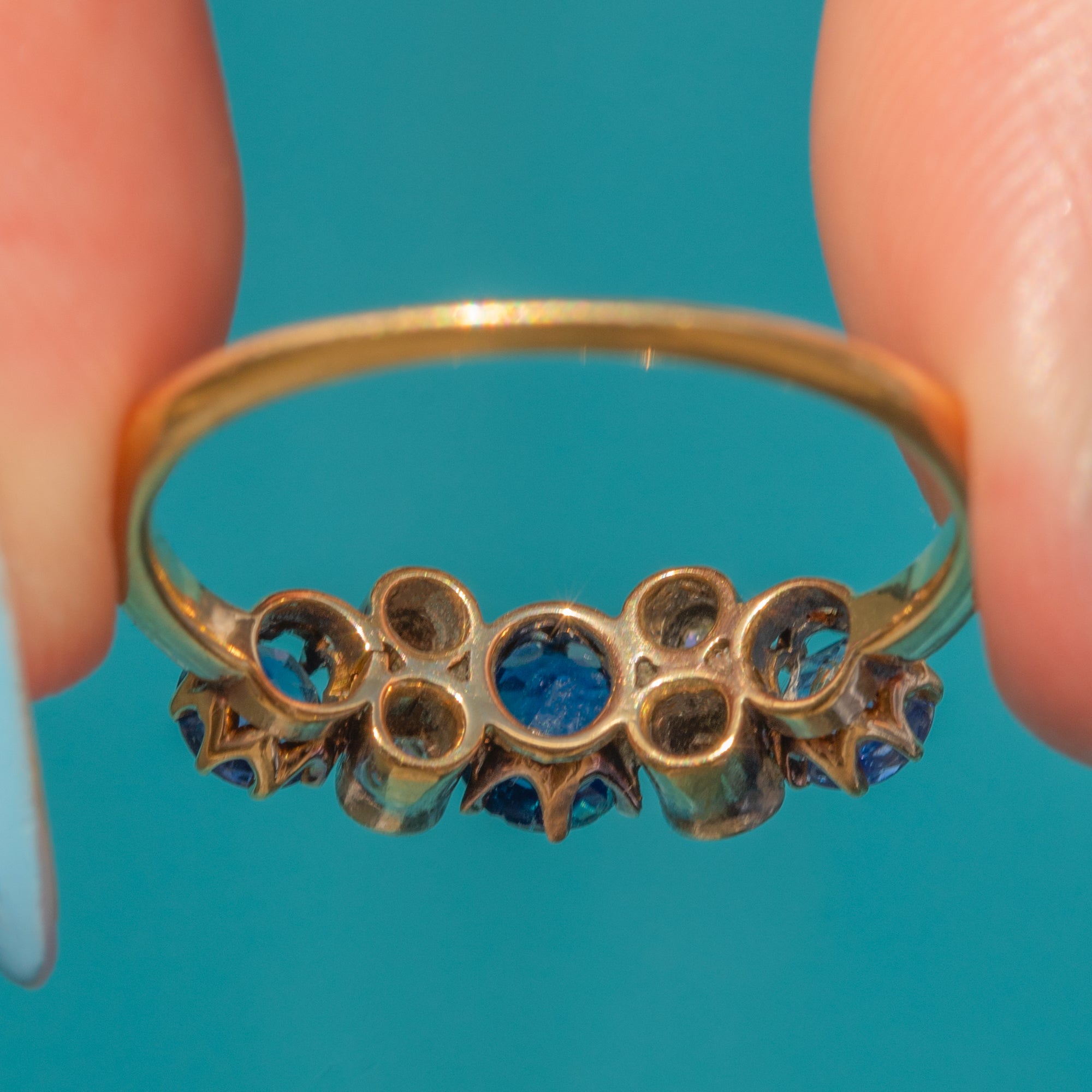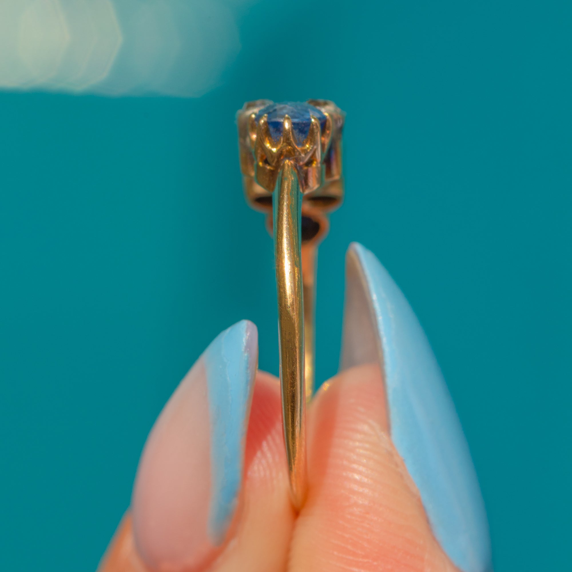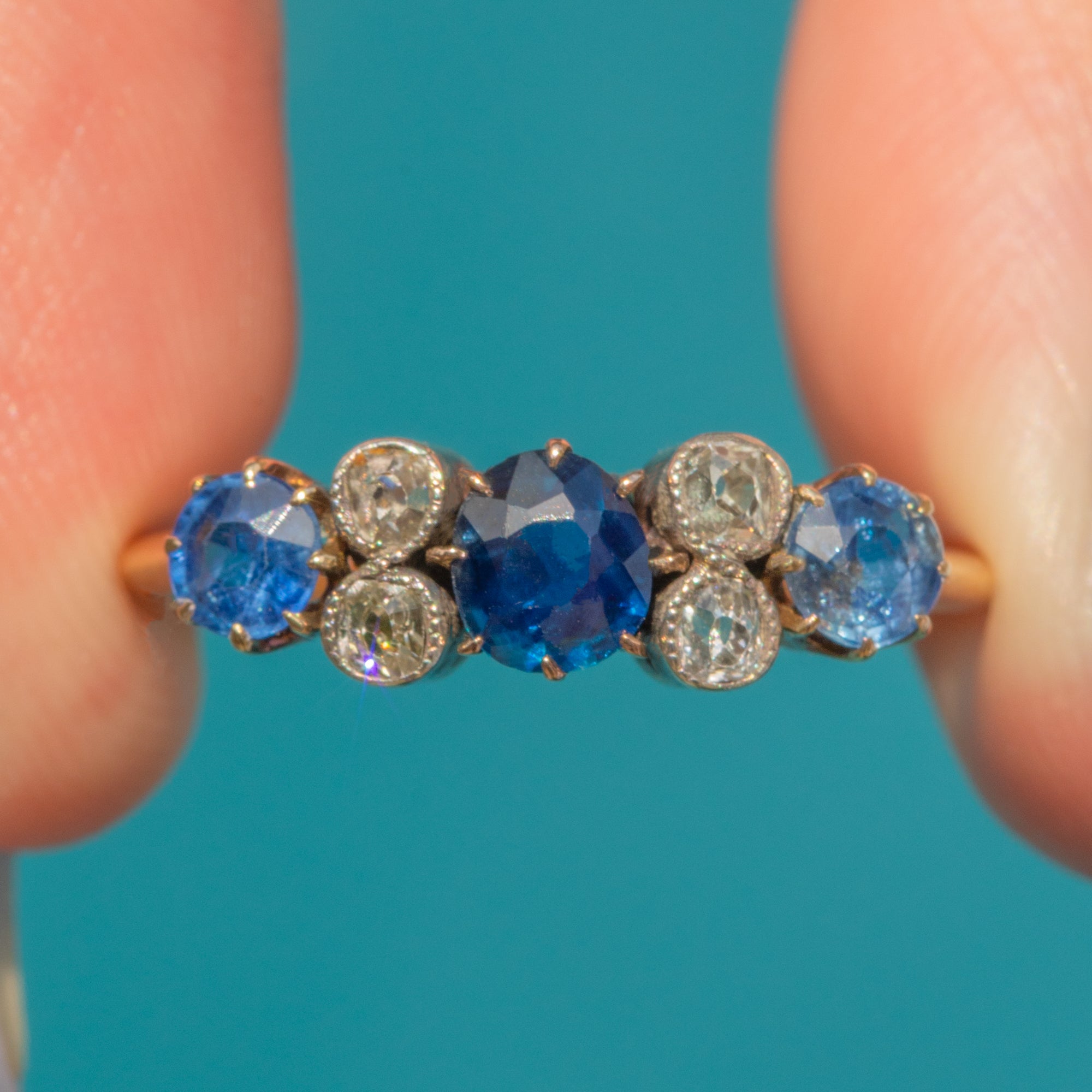 The central Sapphire projects a deep saturated blue hue, flanked by lighter, cornflower blue Sapphires, each displayed within elegant 18ct Gold claws and weighing 0.86cts combined. In typical Victorian fashion, the Diamonds are set within Silver bezels to enhance their bright sparkle.