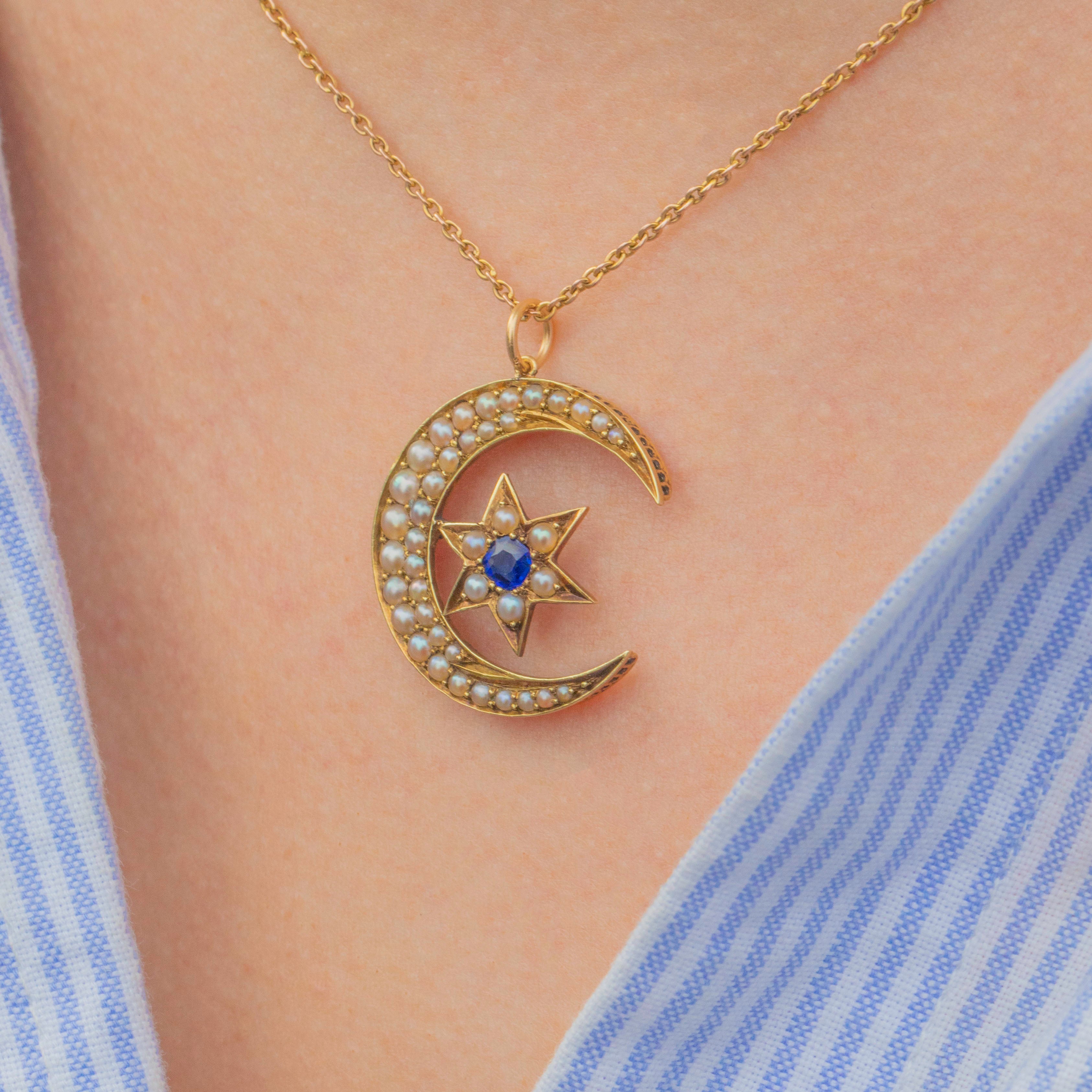 We adore this enchanting Victorian 18ct Gold Sapphire Pearl crescent moon and star pendant!