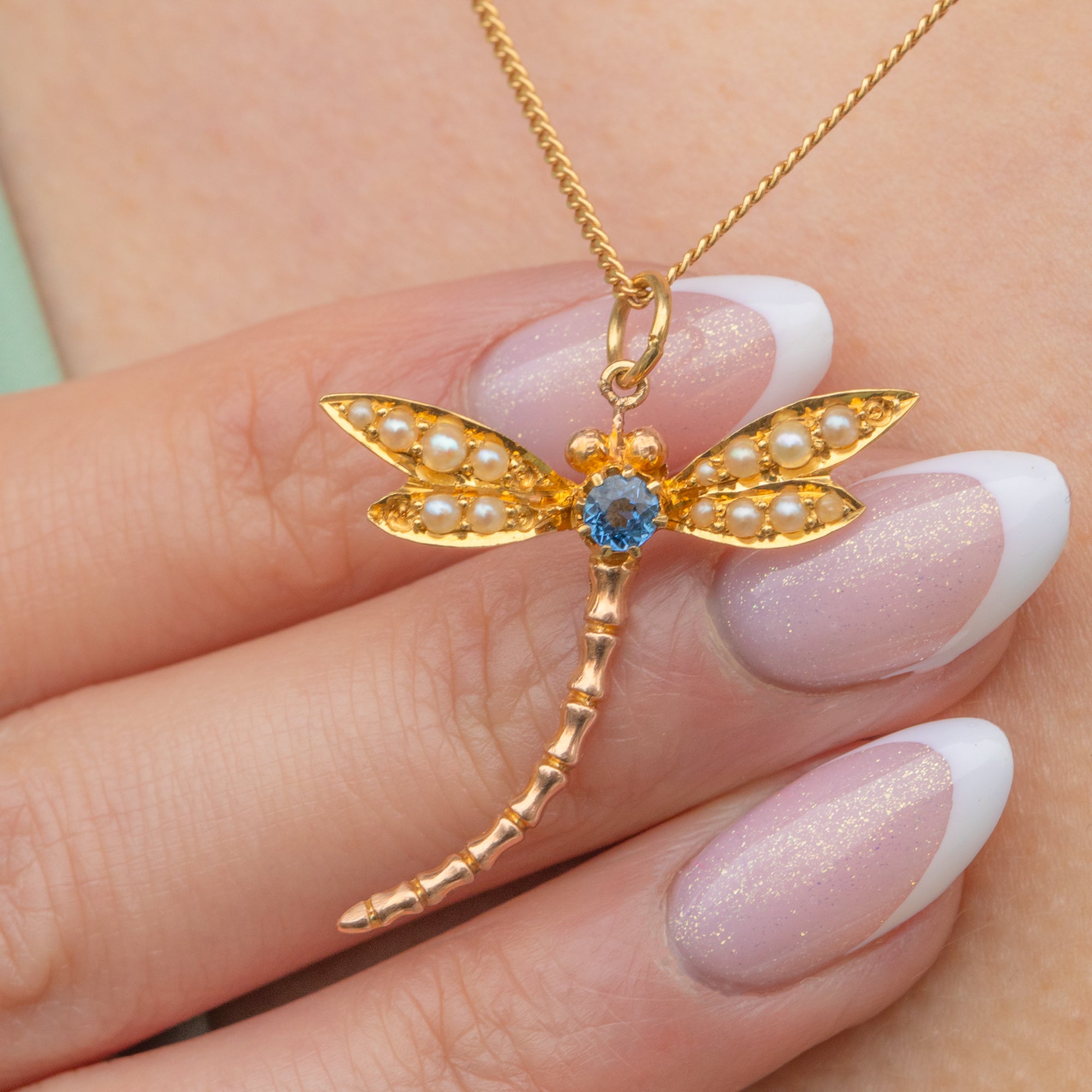 Crafted from glossy 18ct Gold, this antique pendant has a gorgeous buttery hue, enhanced by her meticulous craftsmanship. In her centre sits an bright blue Sapphire, flanked by an array of iridescent Seed Pearls adorning her wings.