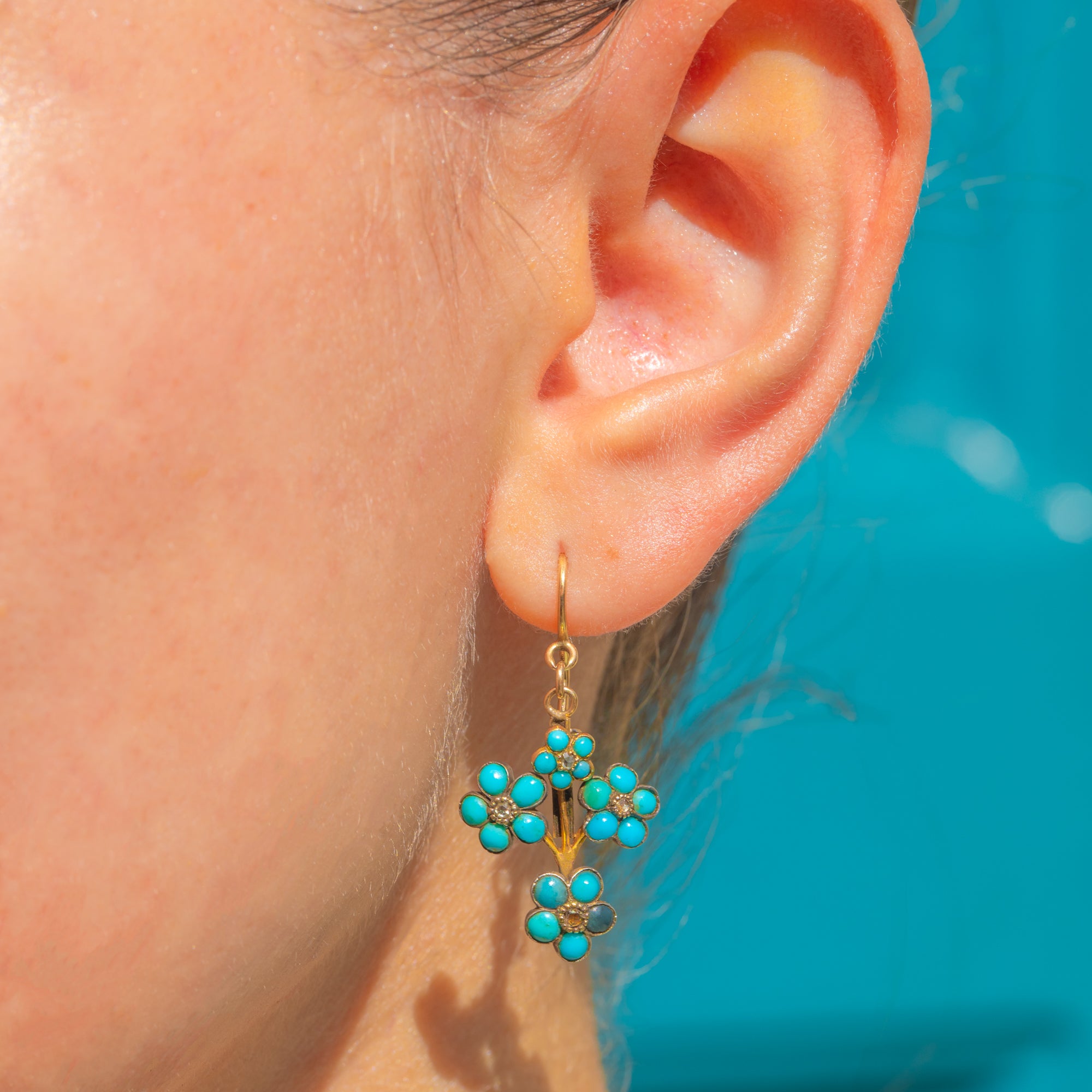 Victorian 18ct Gold Turquoise & Diamond Forget-Me-Not Earrings c.1880
