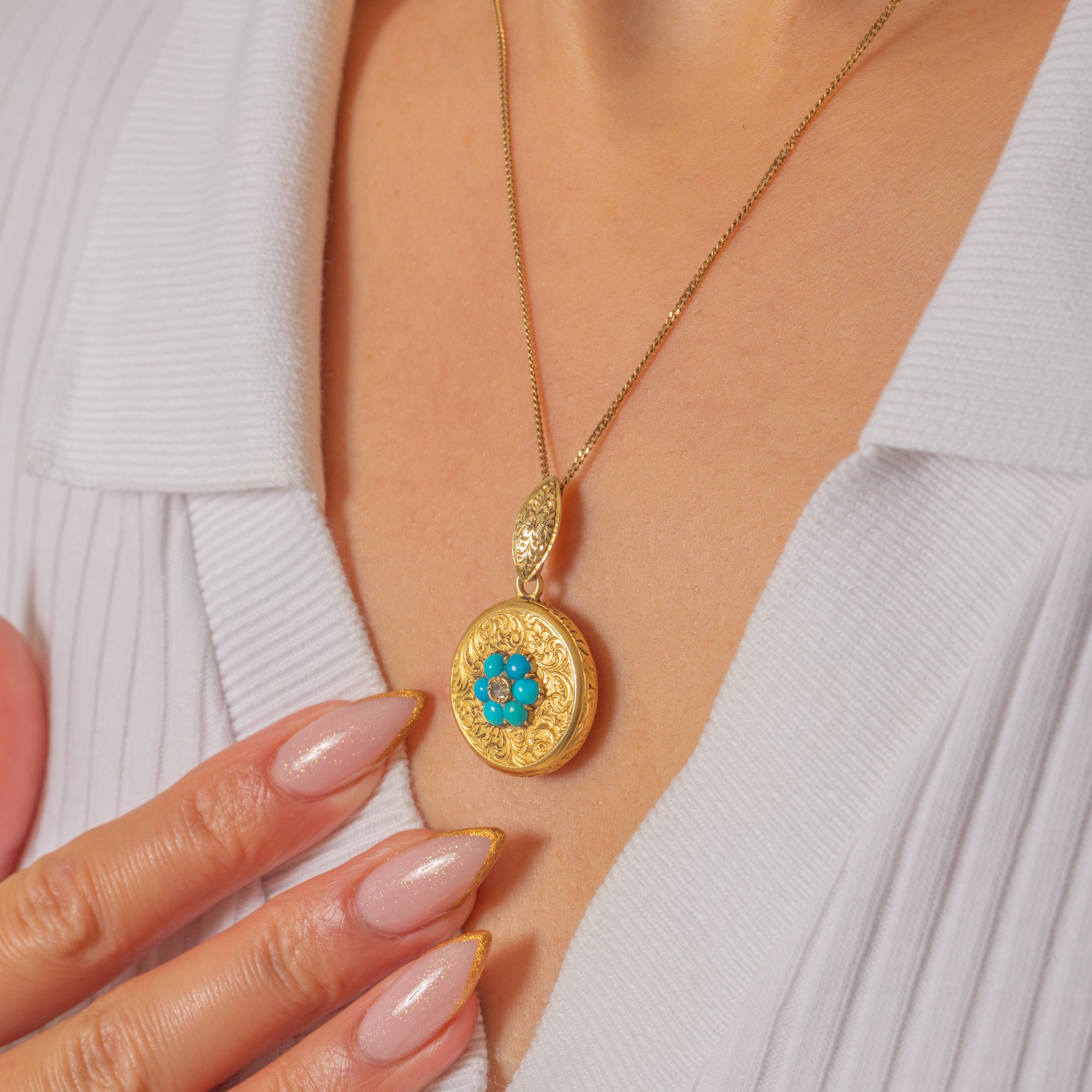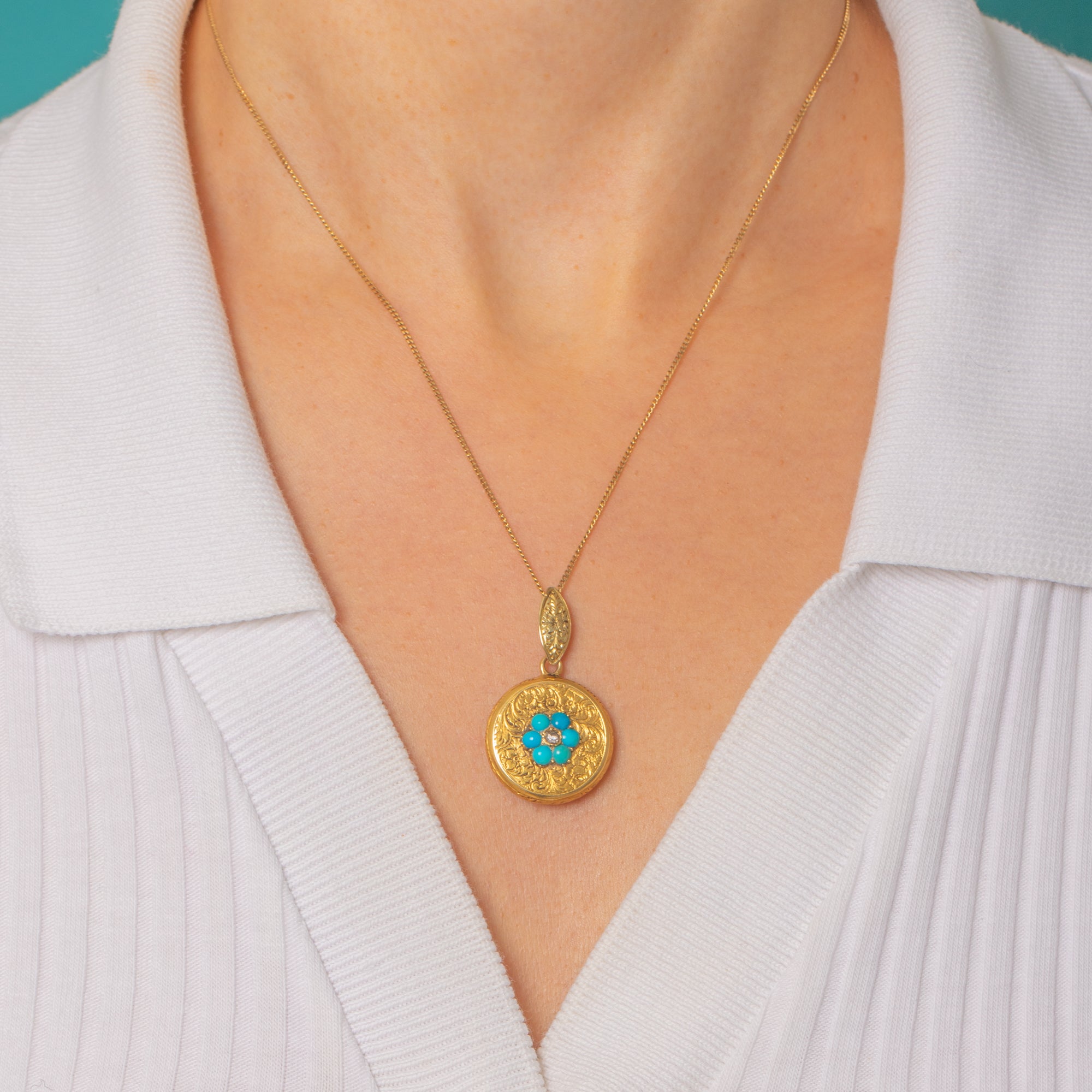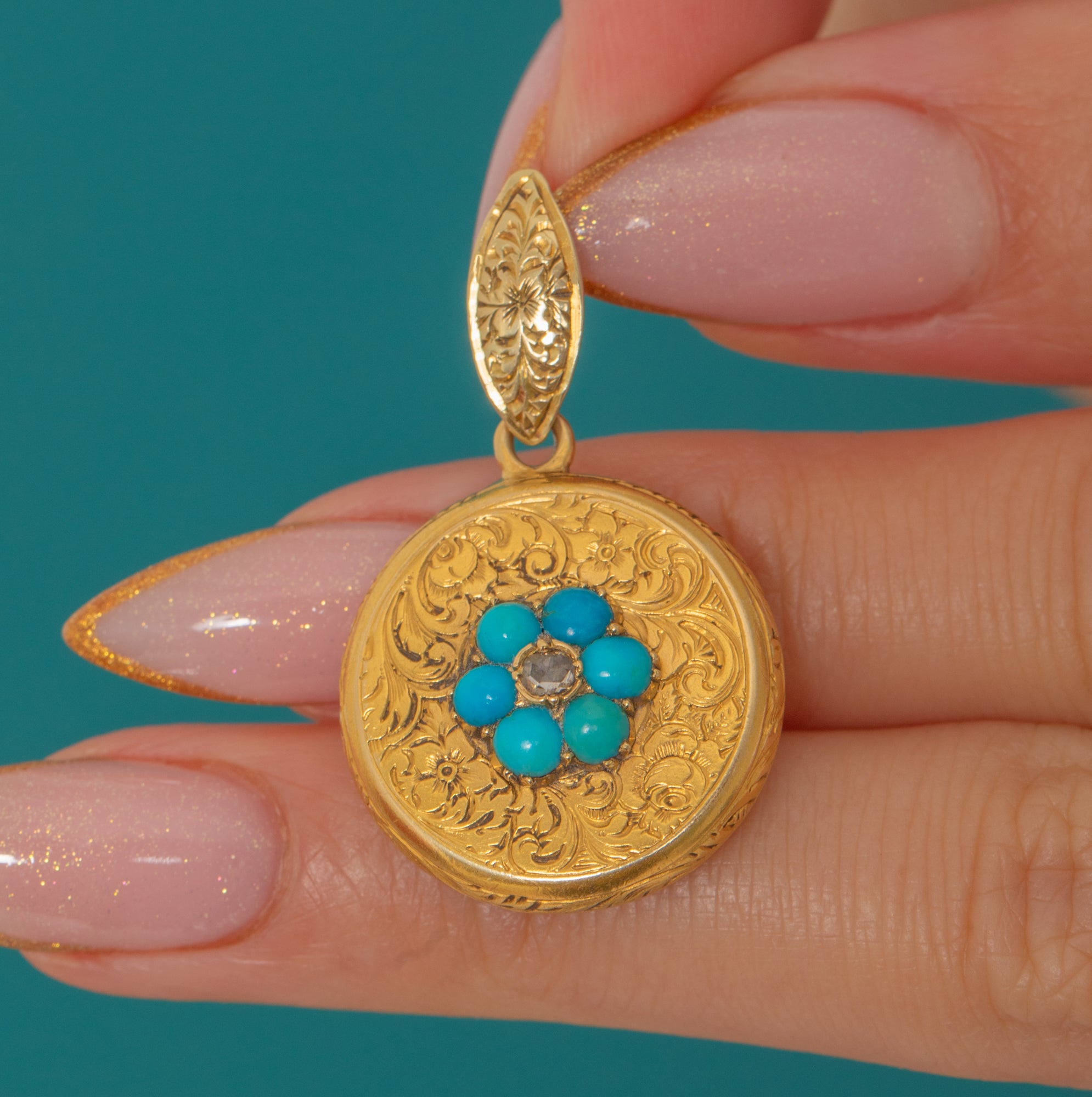 This exquisite Victorian locket is a true sentimental treasure, designed as a delicate Forget-Me-Not flower set with bright Persian Turquoise petals surrounding a central antique Diamond. Crafted in rich 18ct Gold with a beautifully engraved 15ct Gold bale, it features swirling acanthus leaves and intricate floral detailing that catch the light beautifully.