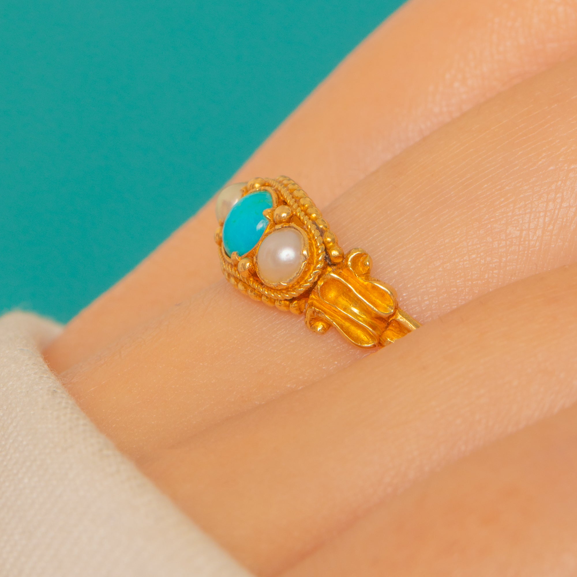 A delicate Victorian three-stone ring, gleaming in rich 18ct Gold with a bright sky blue Turquoise cabochon at the centre and creamy Pearls to each side. The trio is framed by a pretty rope border, with softly foliate, lightly ribbed shoulders lending an ornate, romantic finish.