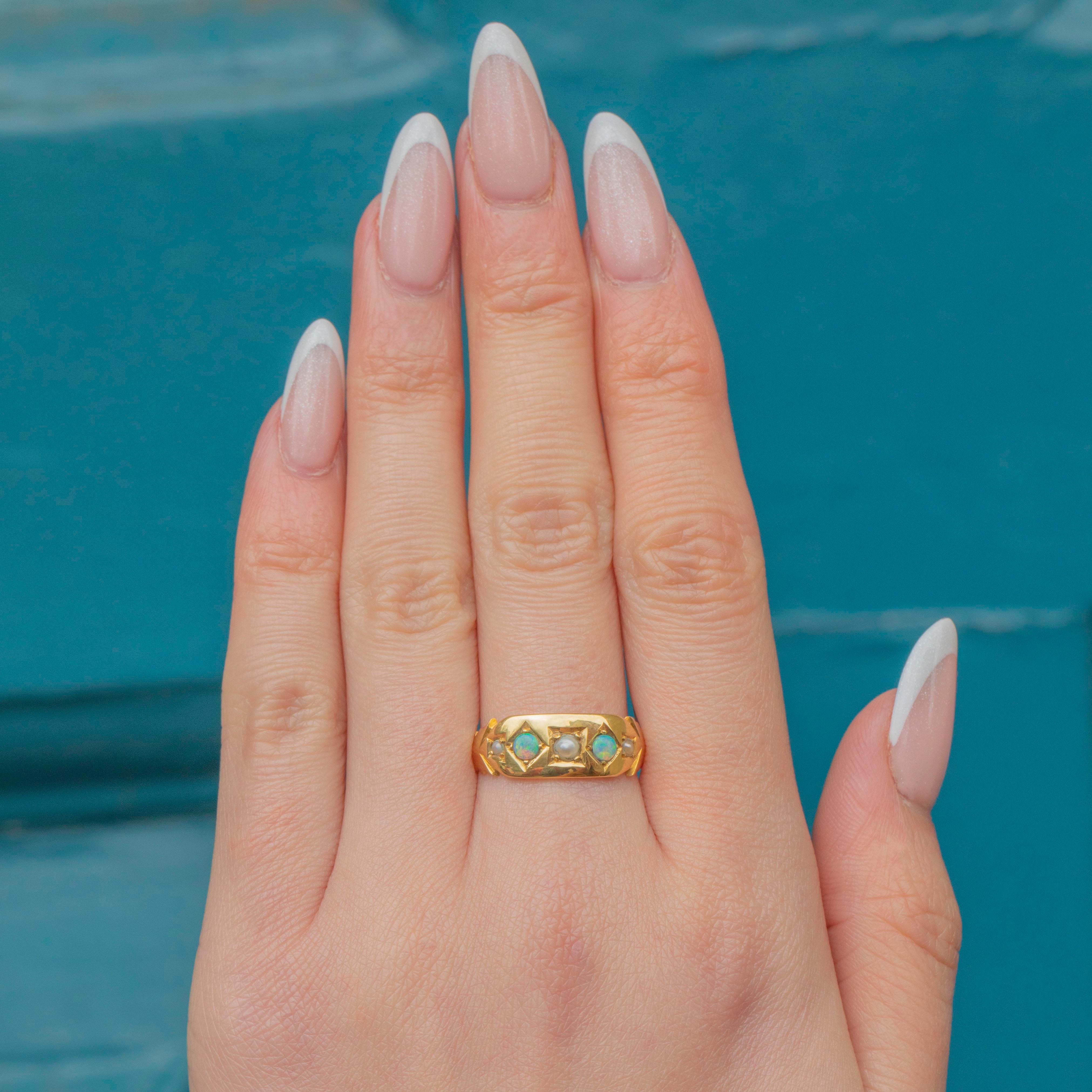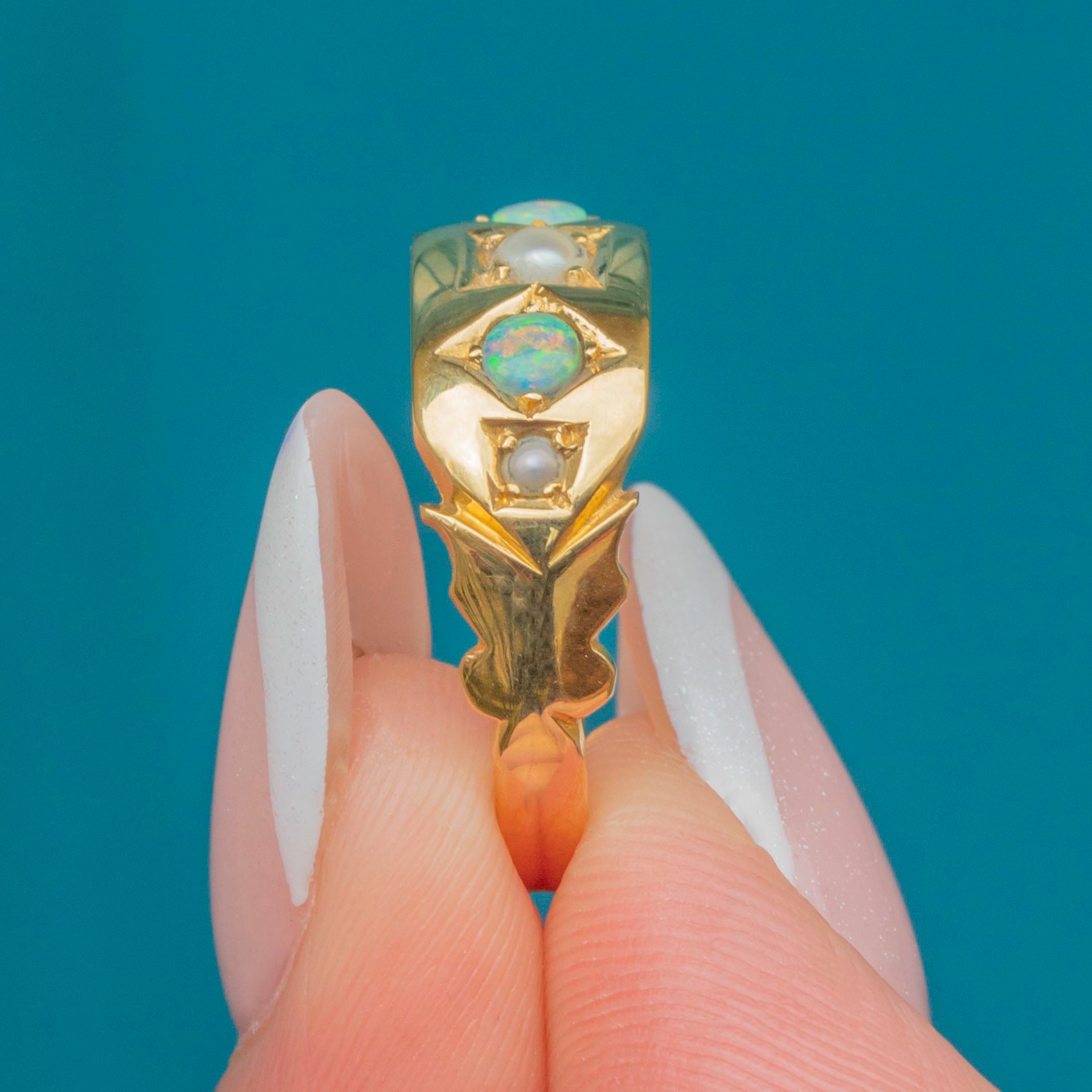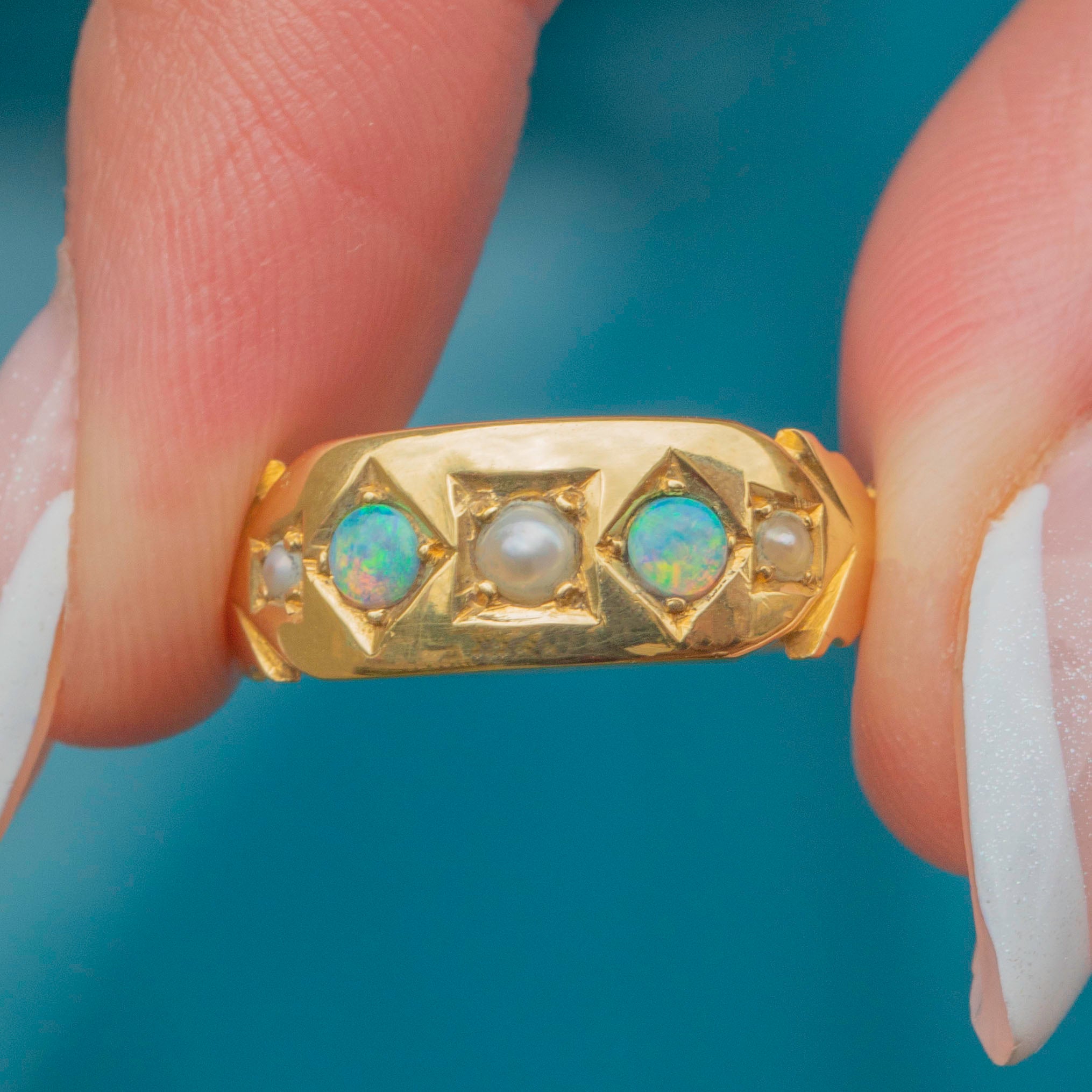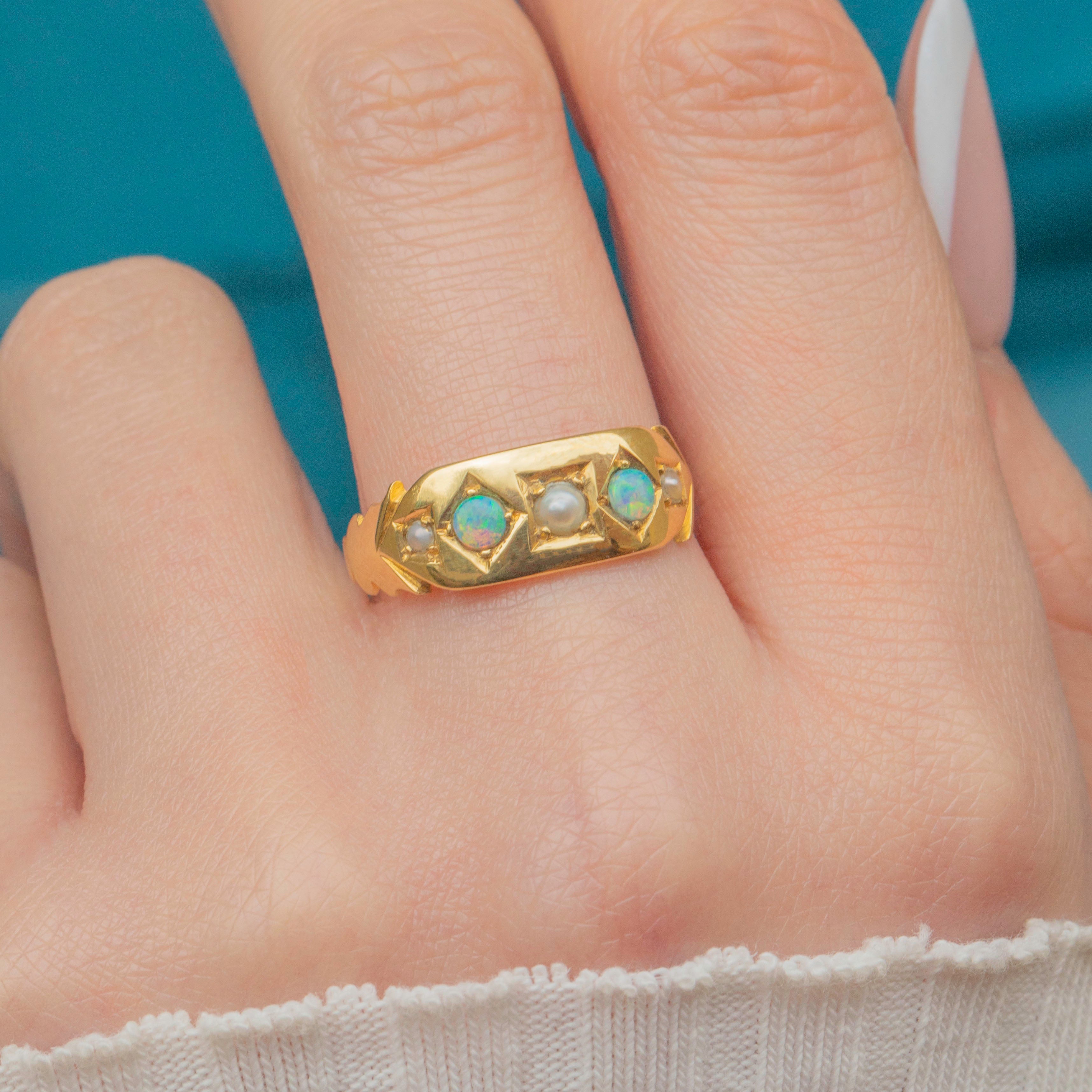 VERY GOOD-EXCELLENT: This Victorian 22ct Gold Opal Pearl gypsy ring is in wonderful condition. The Gold has a sumptuous glow with wonderful reflective qualities, and the band is smooth providing comfortable wear. There is some mild wear around the gemstone settings, noticeable under close inspection, but they all remain securely set and free from surface wear. The hallmarks are fully legible, allowing us to date this authentic piece of Victorian jewellery to 1872!