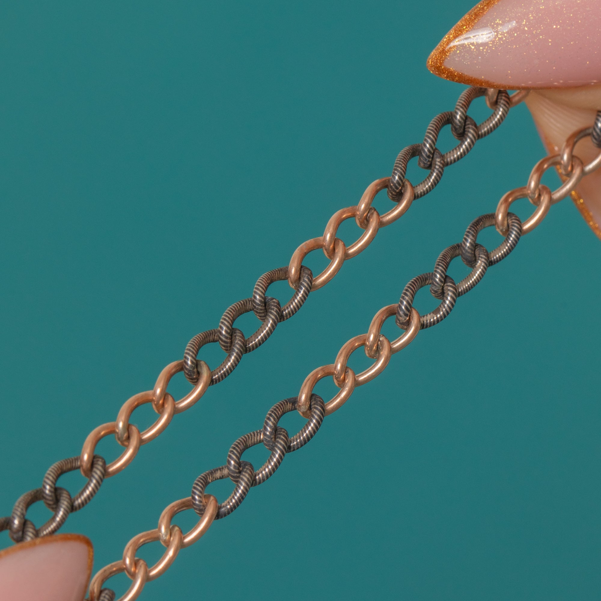This striking Victorian Niello chain is a wonderful example of continental craftsmanship, with alternating Silver Niello Enamel and 9ct Rose Gold-plated links. The pin-striped pattern gives a subtle shimmer and contrast, creating a bold yet refined aesthetic typical of late 19th-century jewellery.