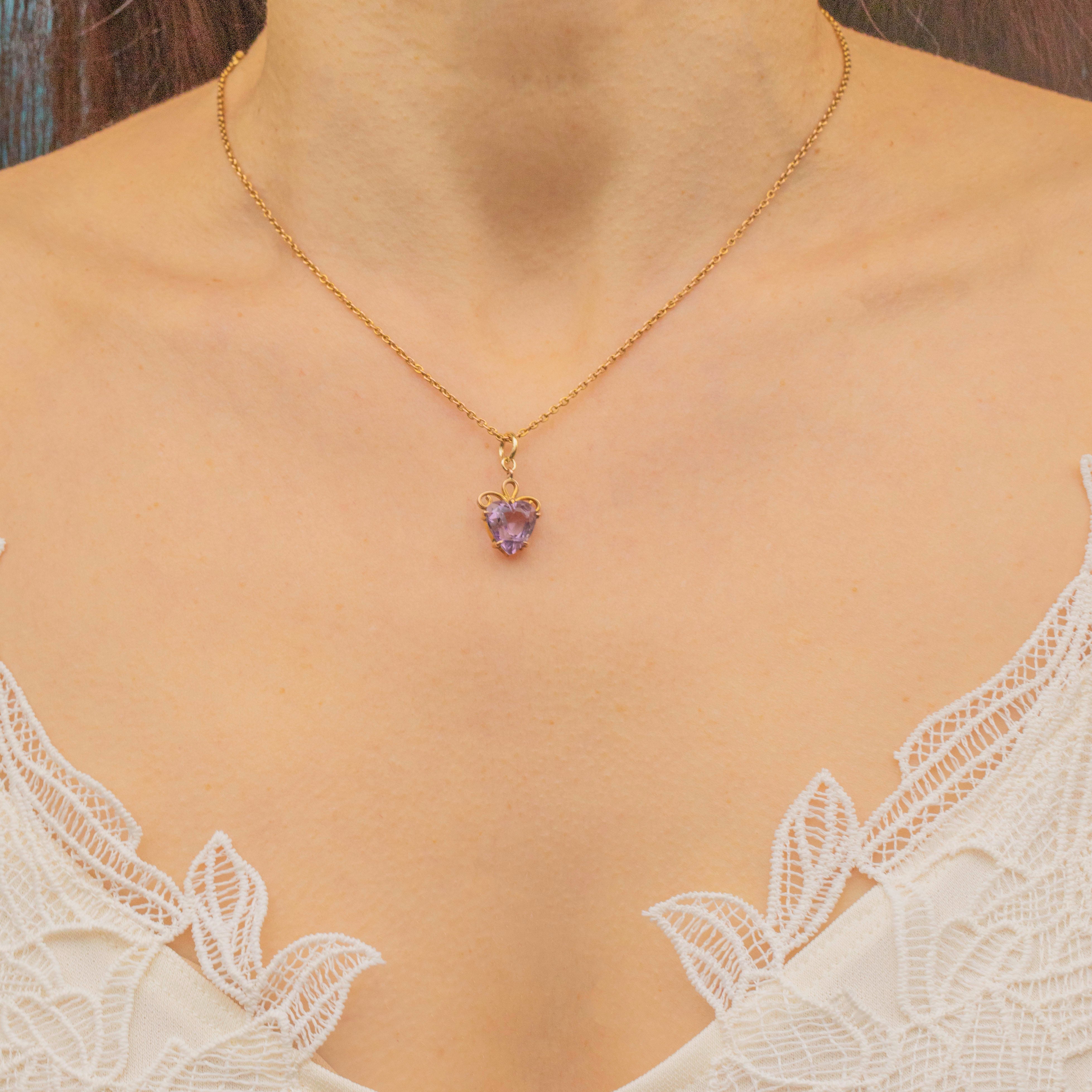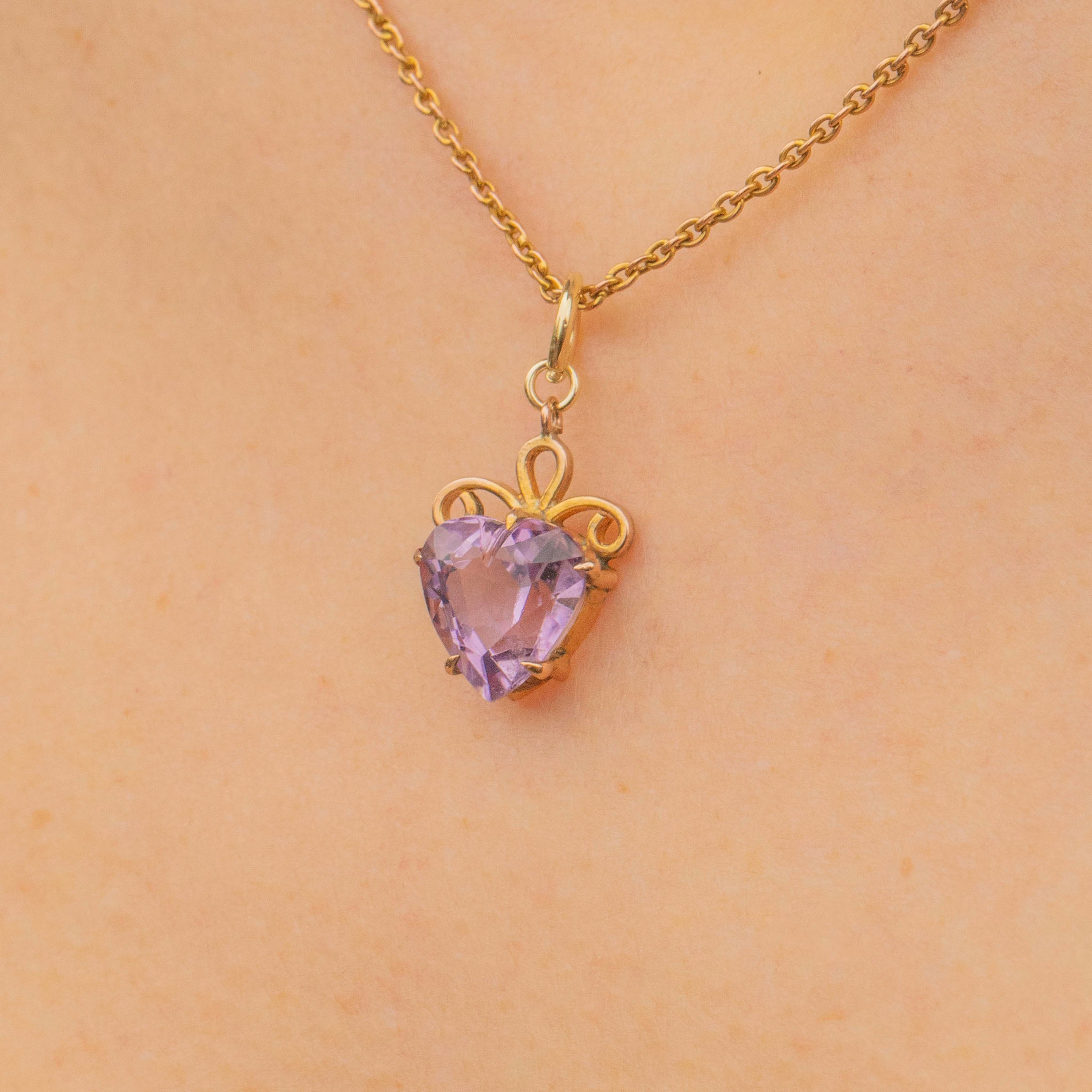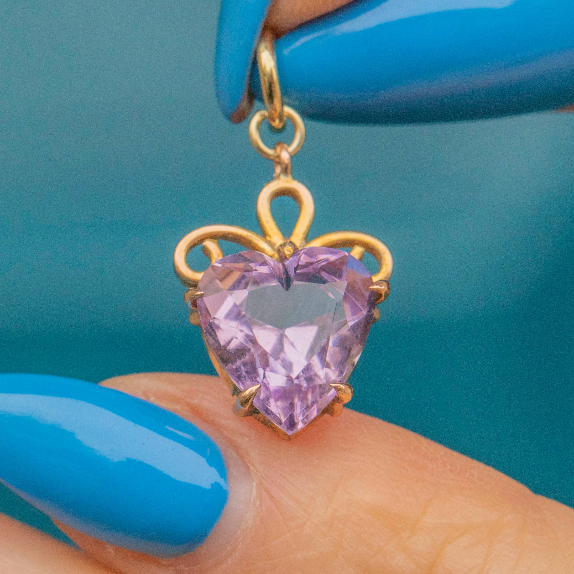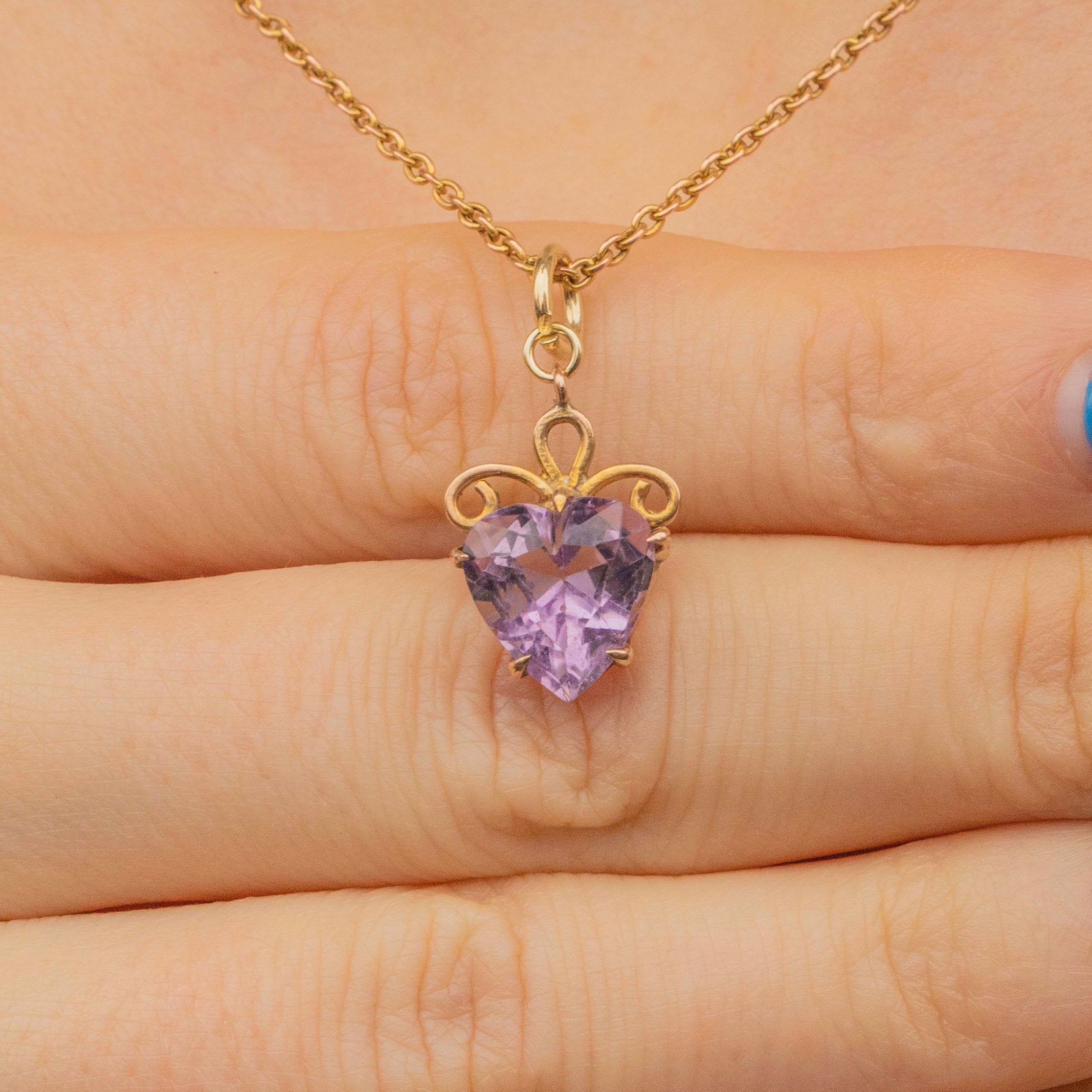 EXCELLENT: This is a gorgeous antique 9ct Gold Amethyst heart pendant in excellent condition. This treasure has very little wear to note, the Amethyst is practically perfect and secure in her 9ct Gold claw settings. Complete with a secure jump ring, you can wear this antique heart pendant with the utmost confidence all day long.