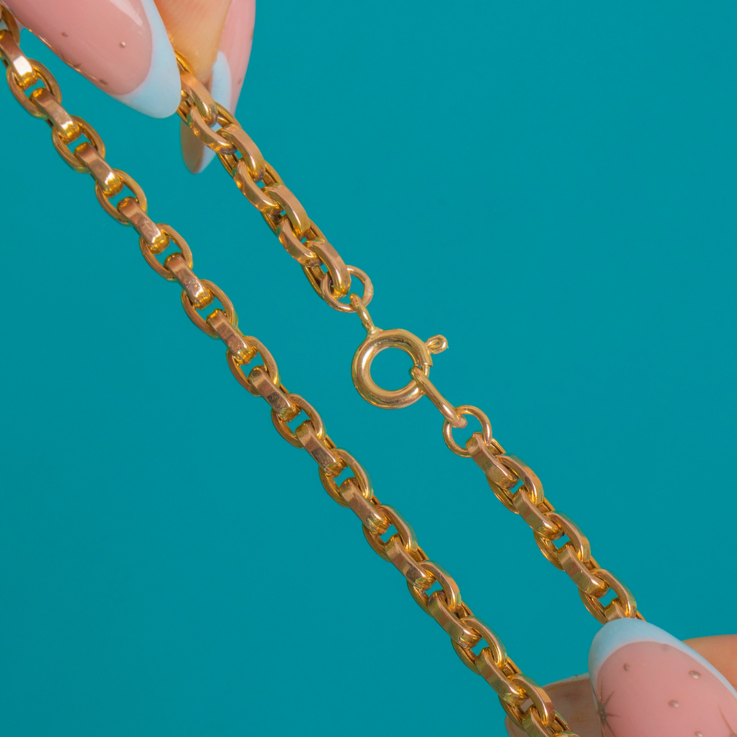 EXCELLENT: The links are bright and well-shaped with only light hairline abrasions commensurate with age and wear. The later added bolt ring clasp closes securely and the chain lies smoothly with no distortions to the links.