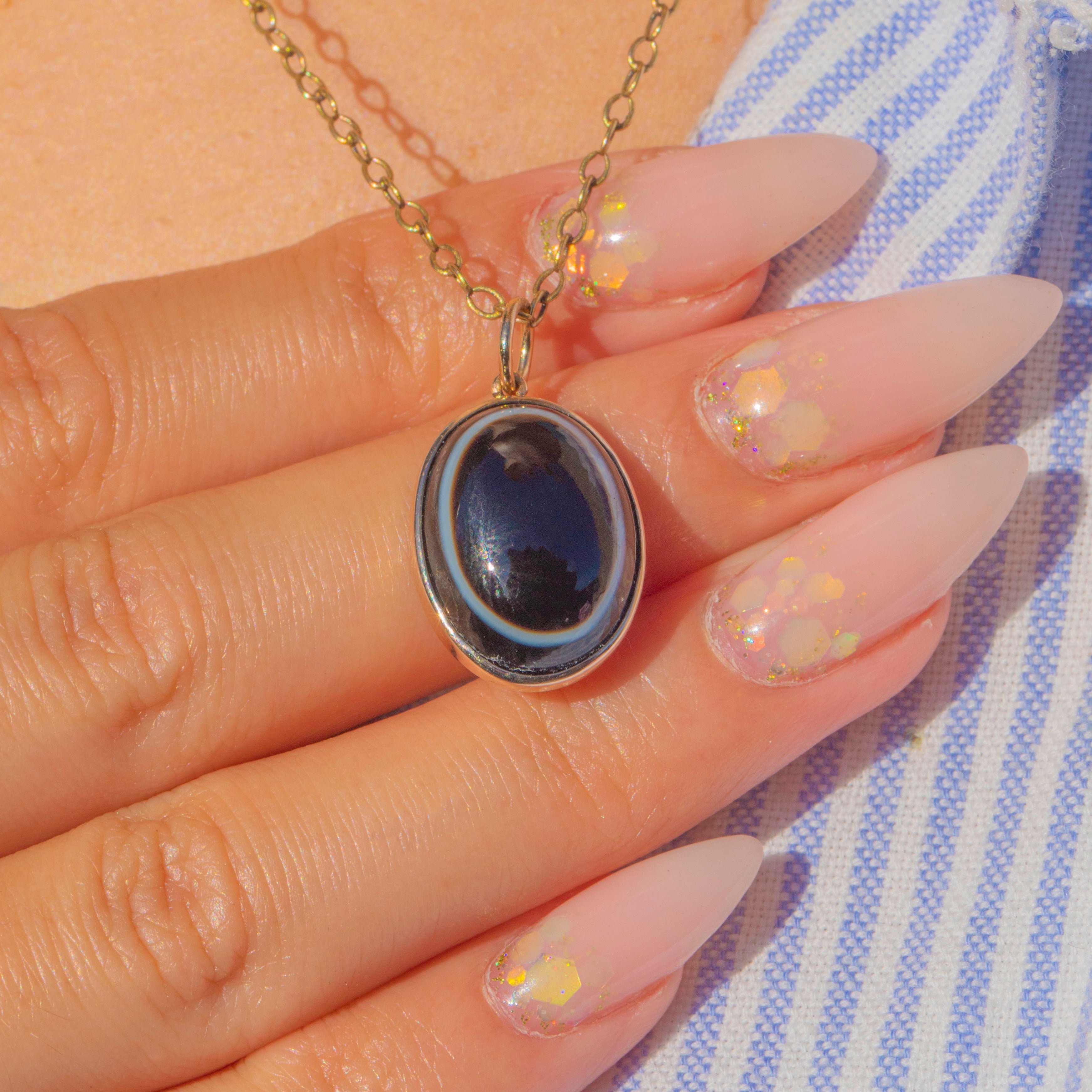 This antique pendant is crafted in 9ct Gold and set with a striking oval cabochon of Banded Agate. The natural layers of black, brown and white create a bold contrast, highlighting the beautiful concentric rings of the gemstone.