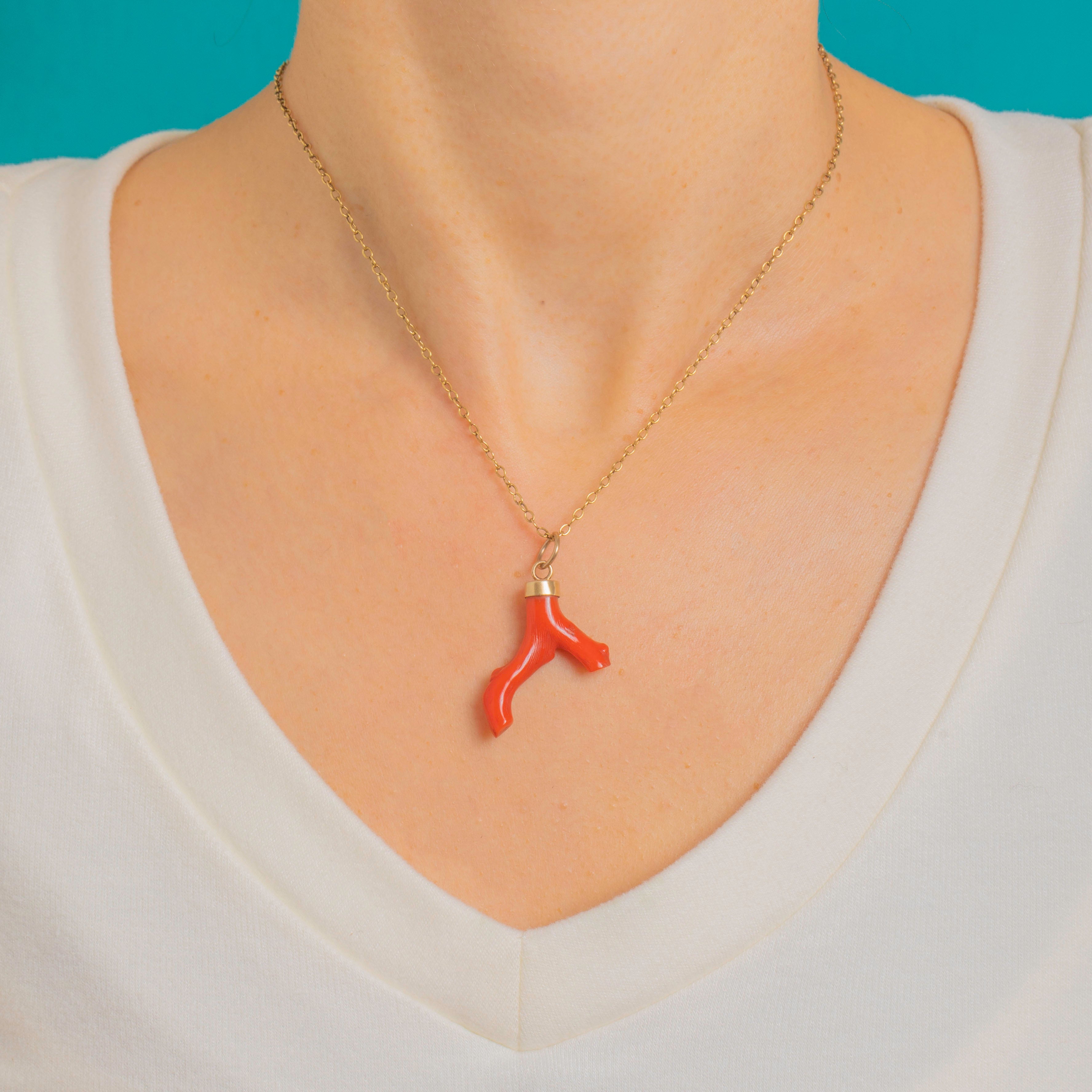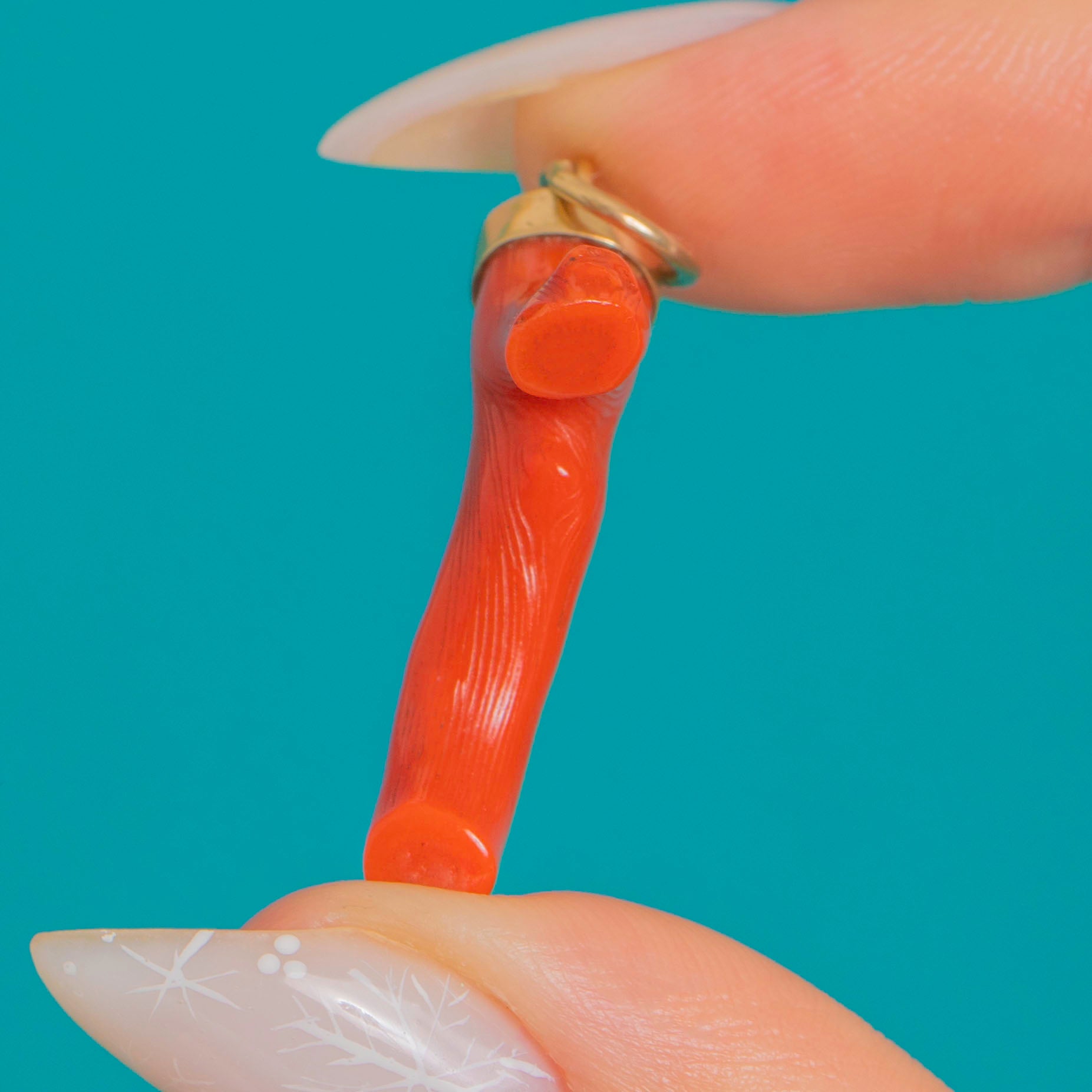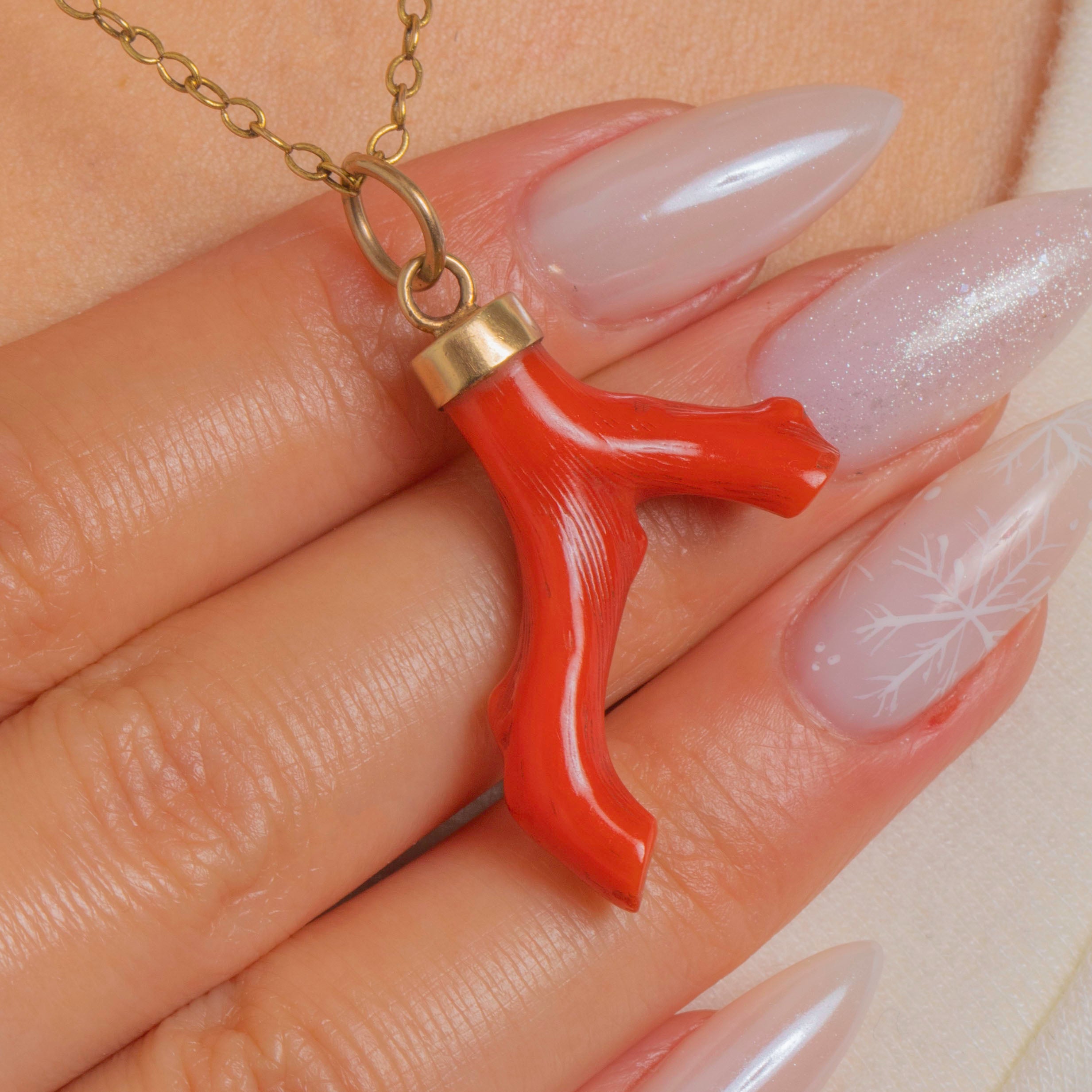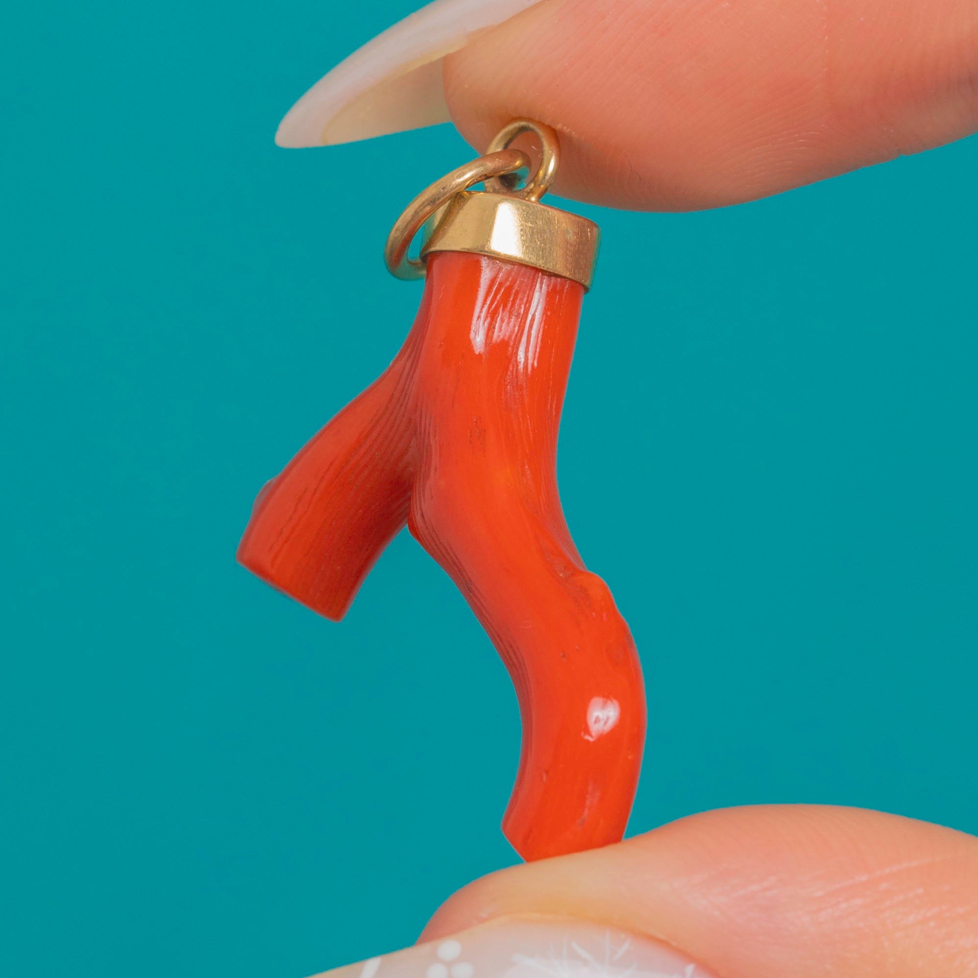 Alive with vivid red-orange colour and organic charm, this Victorian Coral branch pendant is a petite yet striking touch of natural beauty. The glossy branch shows attractive longitudinal striations and a softly curving silhouette, secured in a smooth 9ct Gold cap with a neat jump ring for effortless wear.