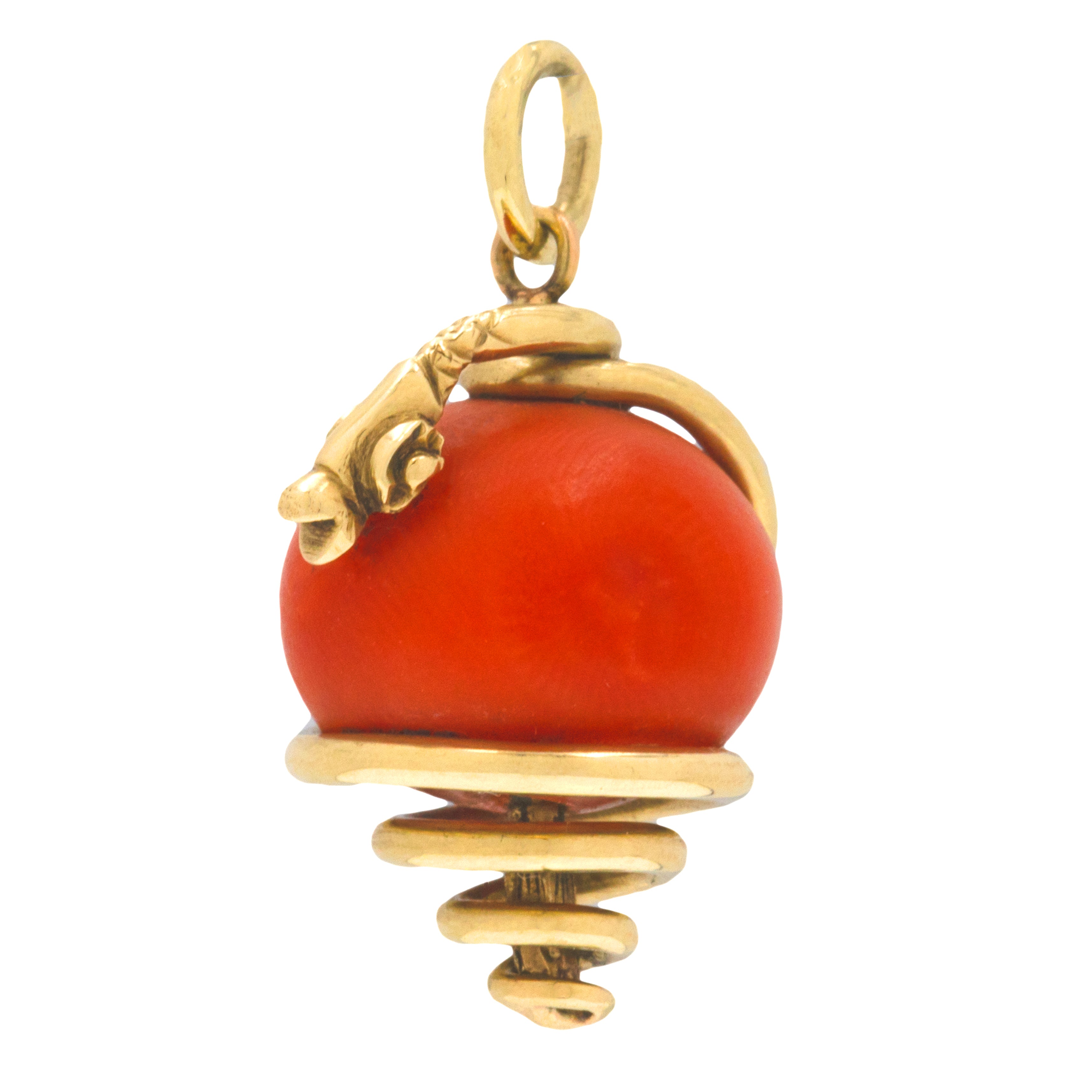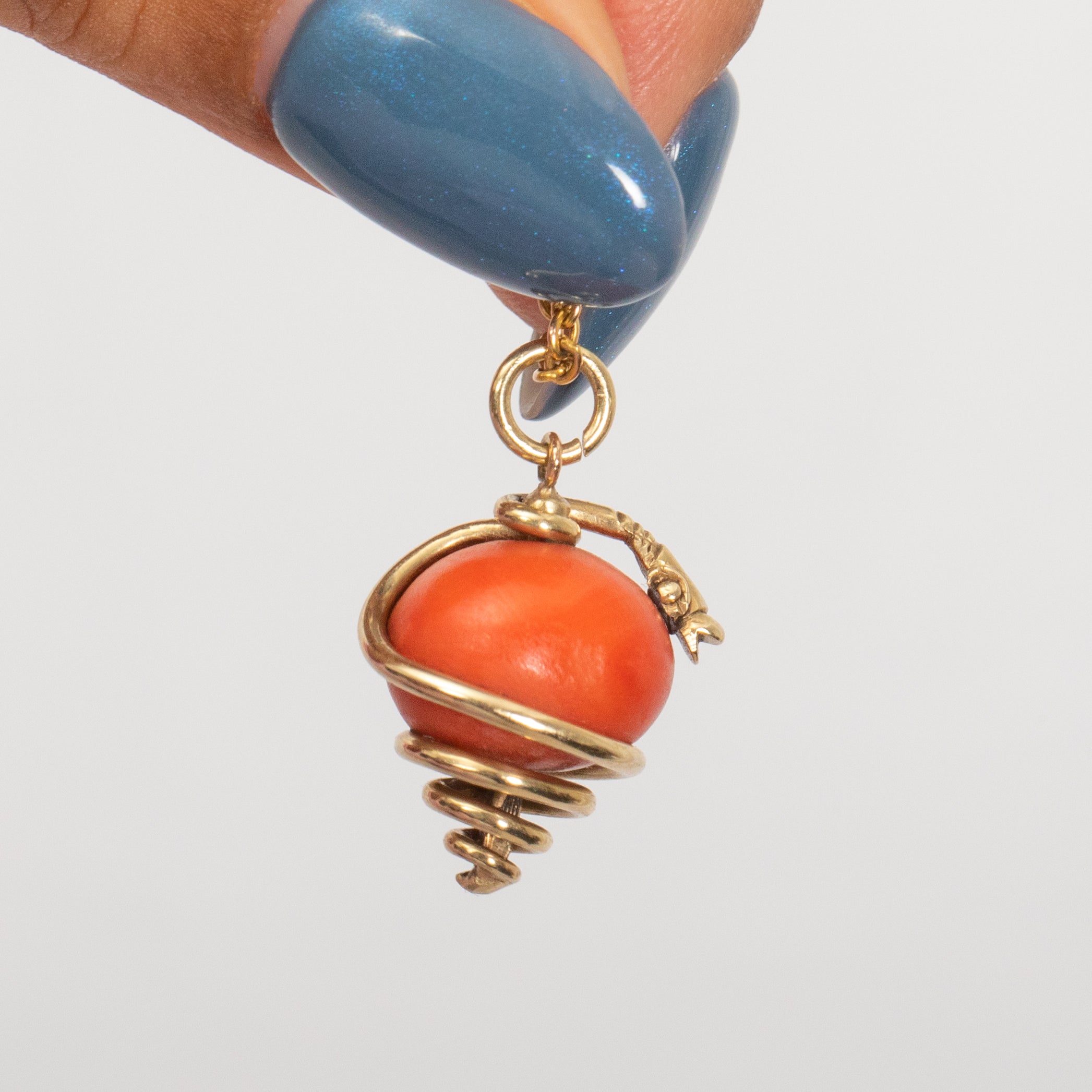 VERY GOOD TO EXCELLENT: This Victorian 9ct Gold Coral snake charm is offered in fabulous condition. The natural Coral has a striking hue and is securely held in place. Under close inspection, there is a minor ding on the surface of the Coral but other than this it has remained smooth. The Gold is buttery, the structure of the snake is sturdy, and its engraved details have remained crisp. With proper care and maintenance, this Victorian charm will last for generations to come.