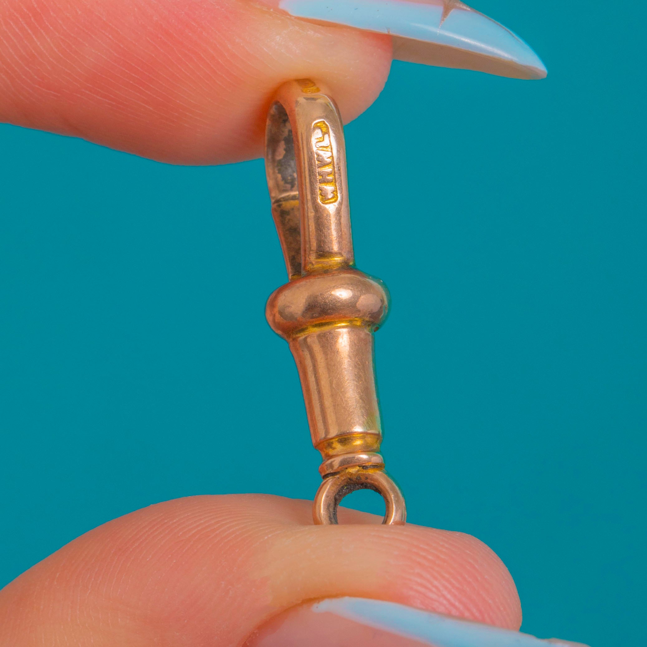 A quintessential Victorian 9ct Gold dog-clip clasp with that timeless blend of elegance and utility. Beautifully engineered, it features a lathe-turned, tapered barrel with a collar, a classic teardrop clip with a spring gate for effortless styling. The warm glow of 9ct Gold and smooth, polished surfaces make it a chic standalone pendant or the perfect charm holder.
