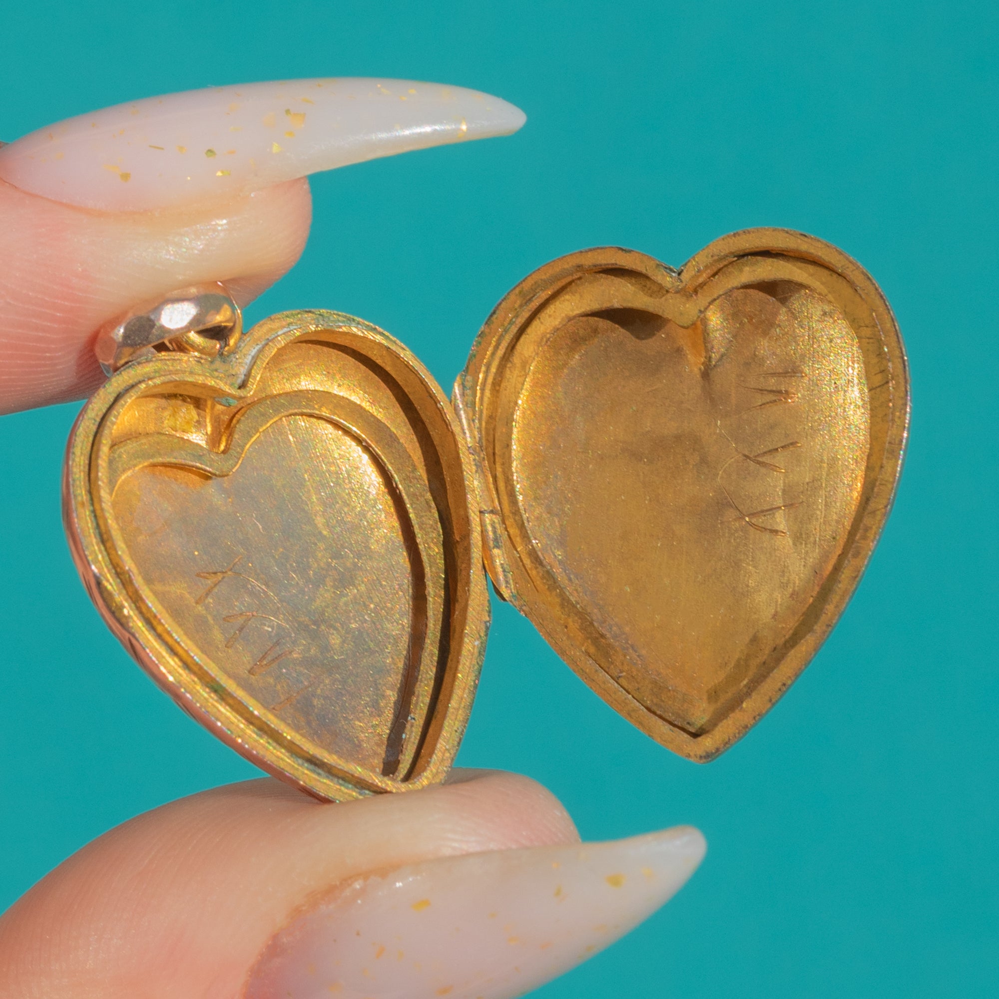 A romantic Victorian heart locket with a charming rosy hue. The warm 9ct Gold back and front are decorated with beautifully bright-cut foliate scrolls and chevron accents that dance in the light. Its softly domed “puffy” profile and petite scale make it a sweet, wearable keepsake.