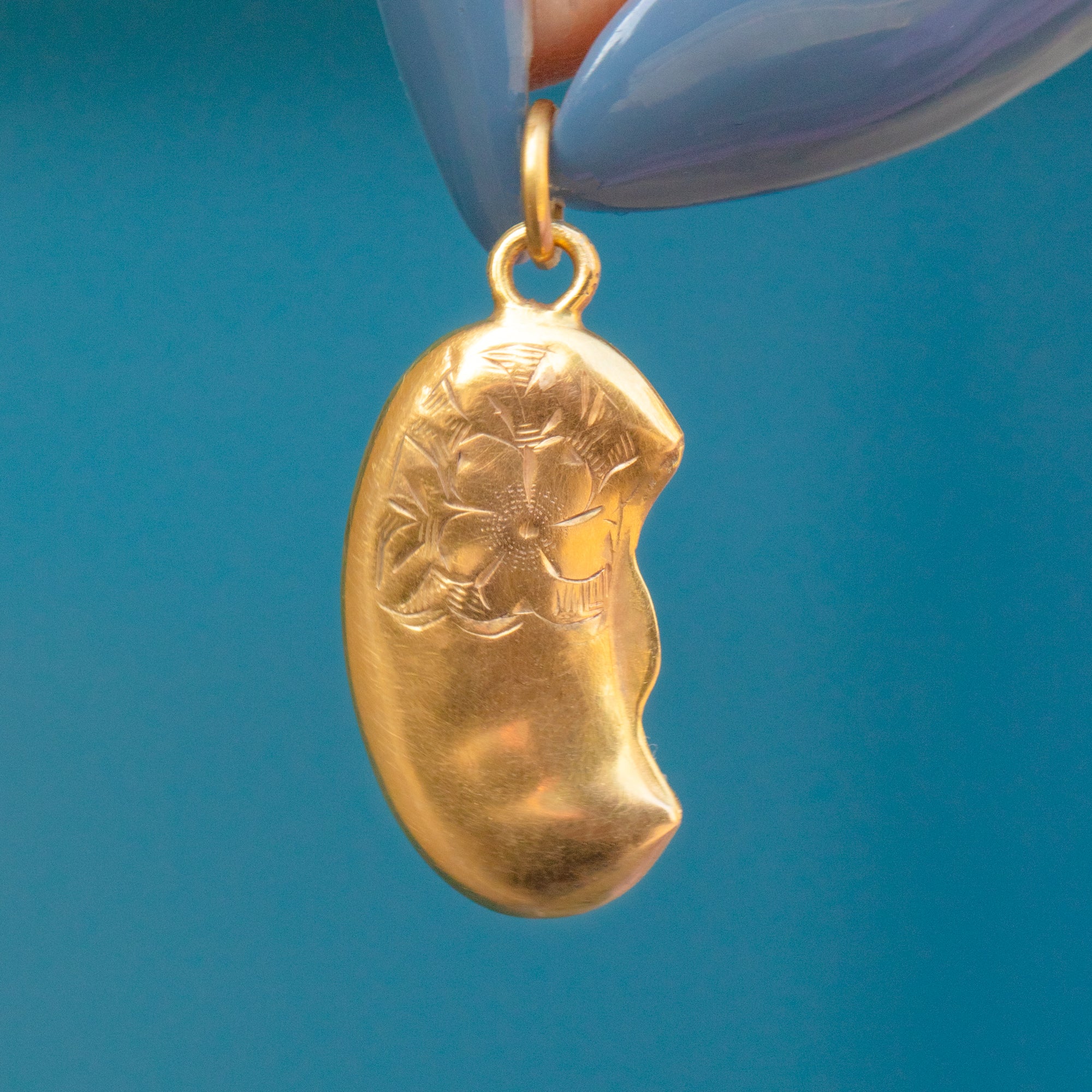 We are excited to bring you this highly sought-after Victorian 9ct Gold engraved lucky bean pendant! Fuel your adventurous spirit with this must-have antique lucky bean pendant, steeped in symbolism.