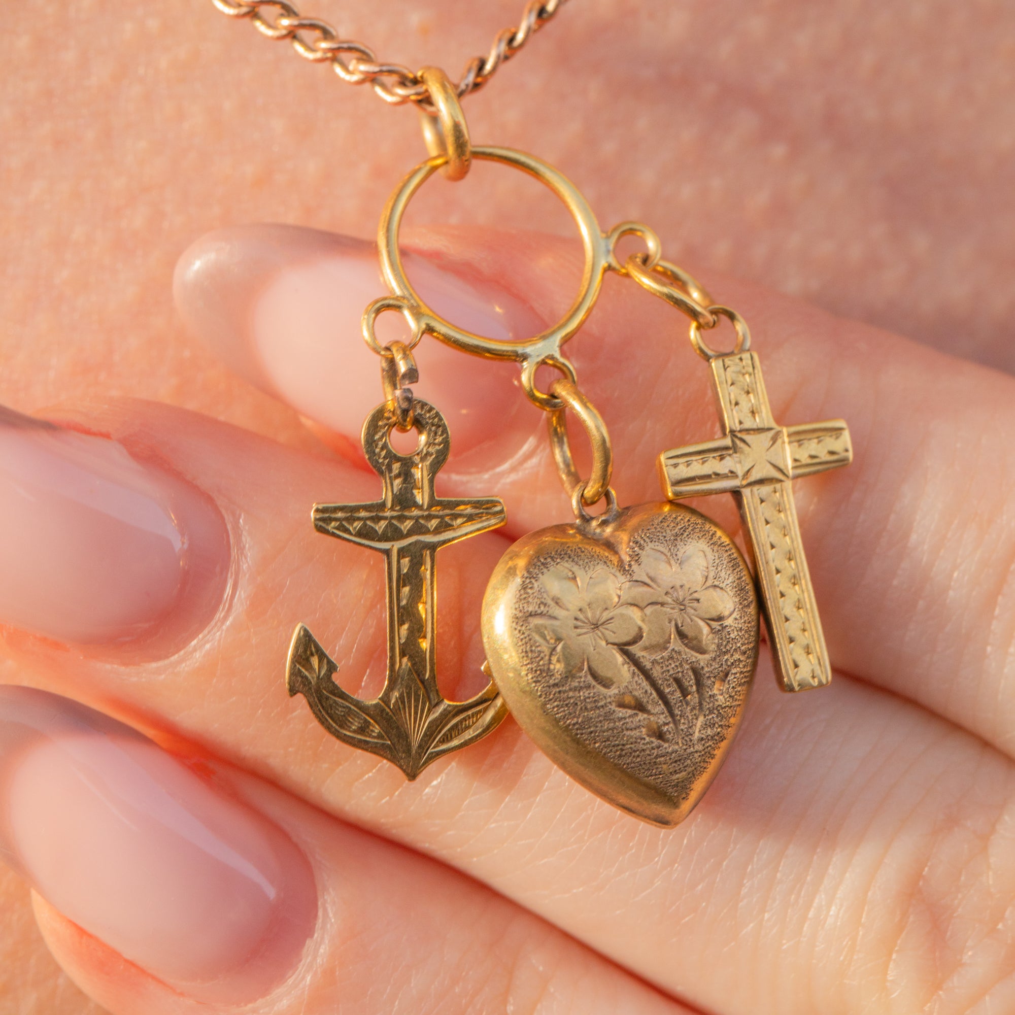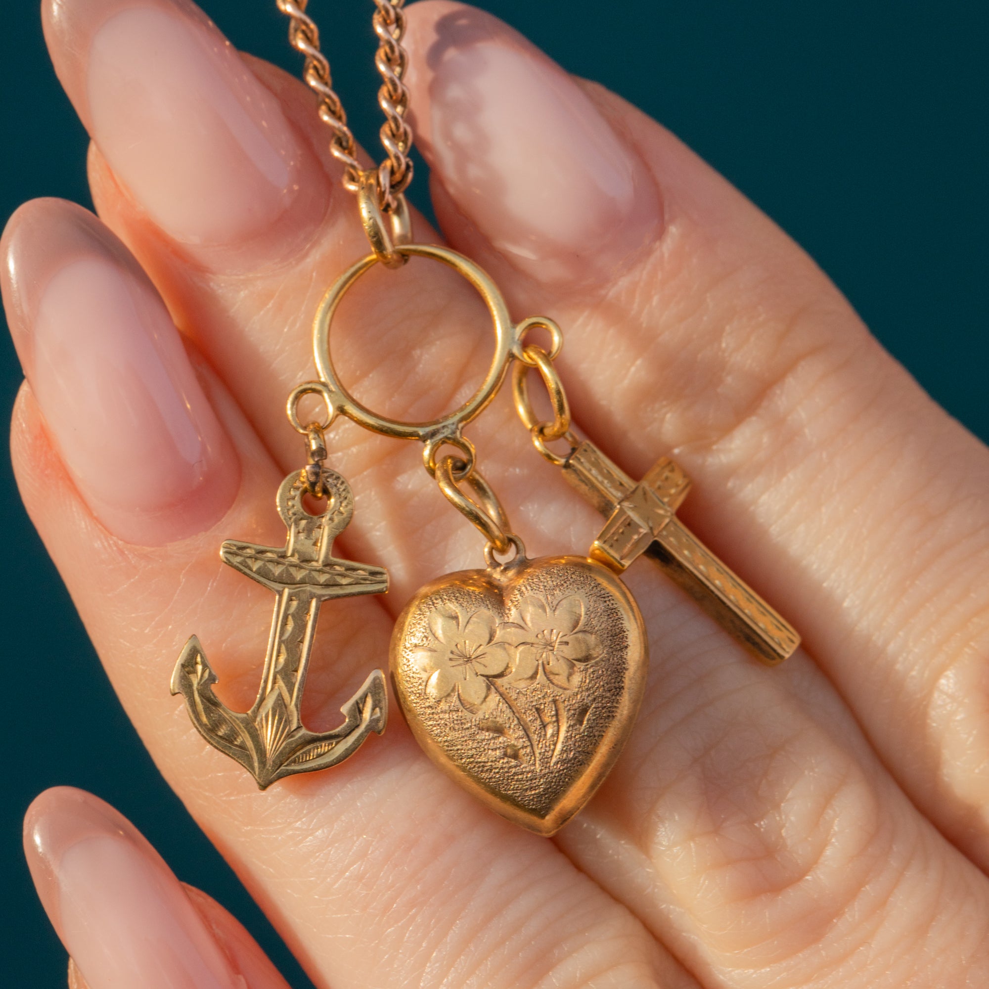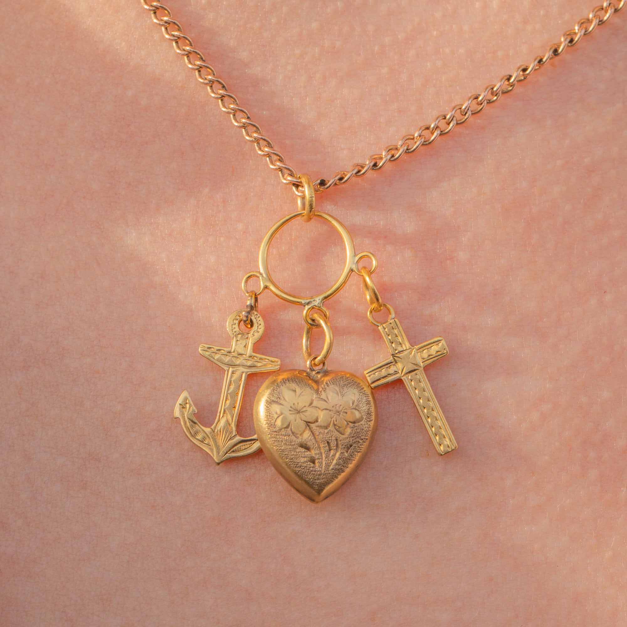 Featuring a floral engraved puffy heart, textured anchor, and embellished cross, she is just bursting with Victorian character! Pretty, lightweight, and versatile, this antique Gold pendant will make the perfect new addition to your jewellery collection.