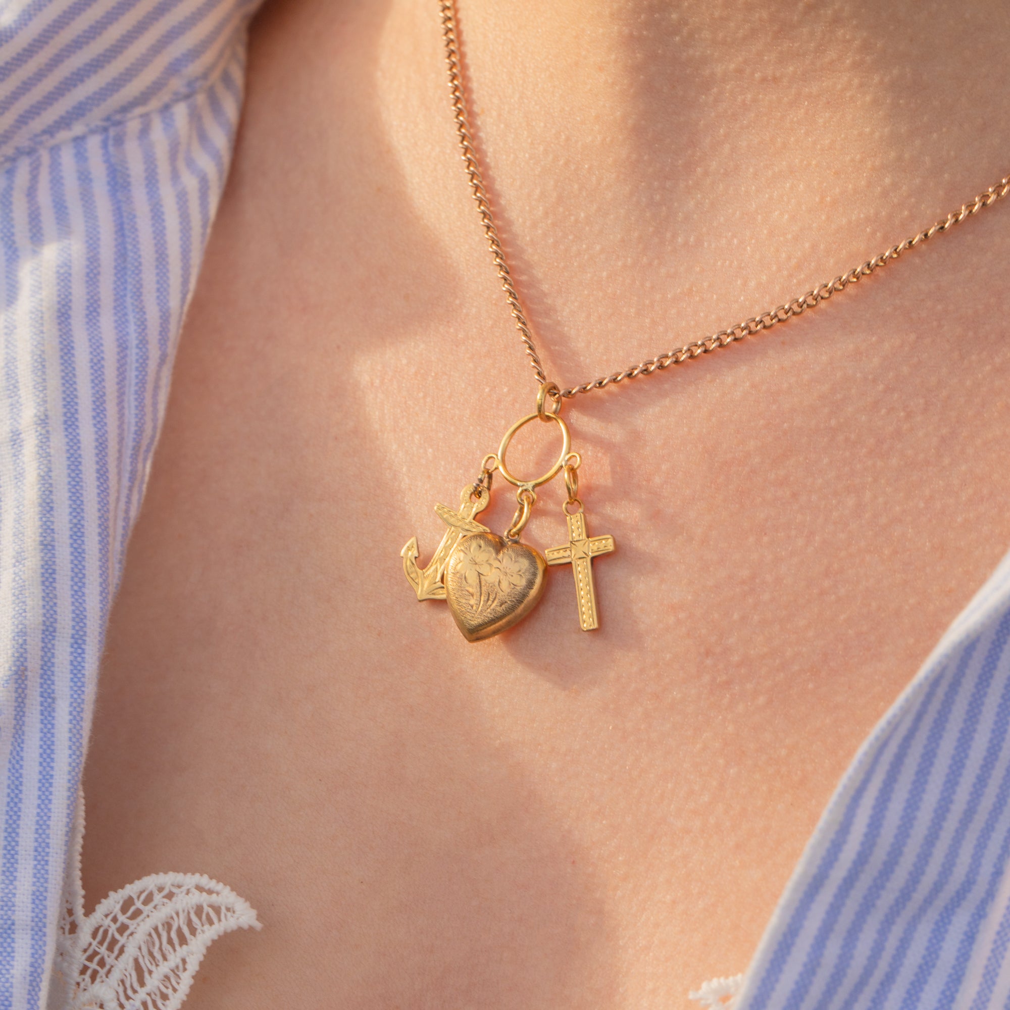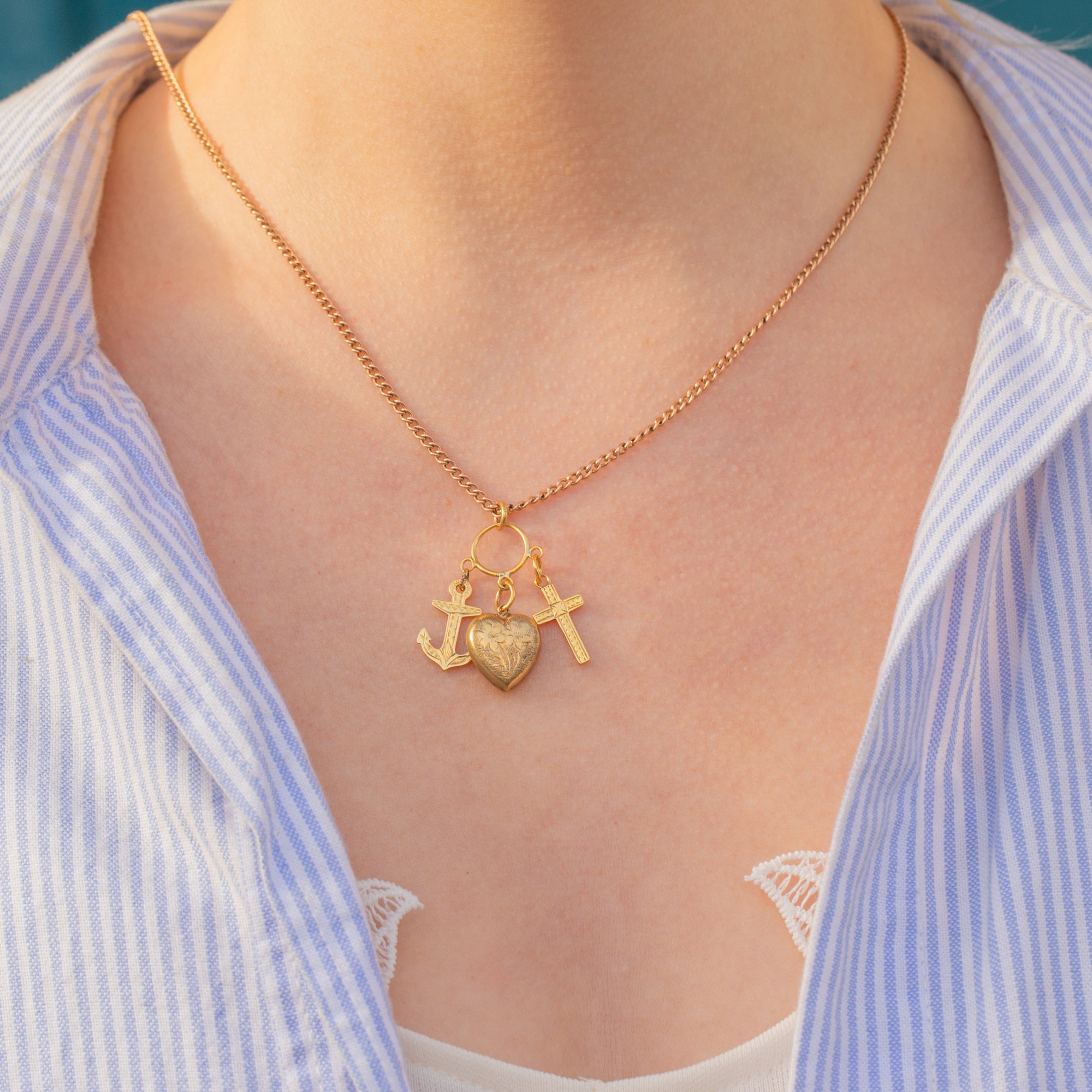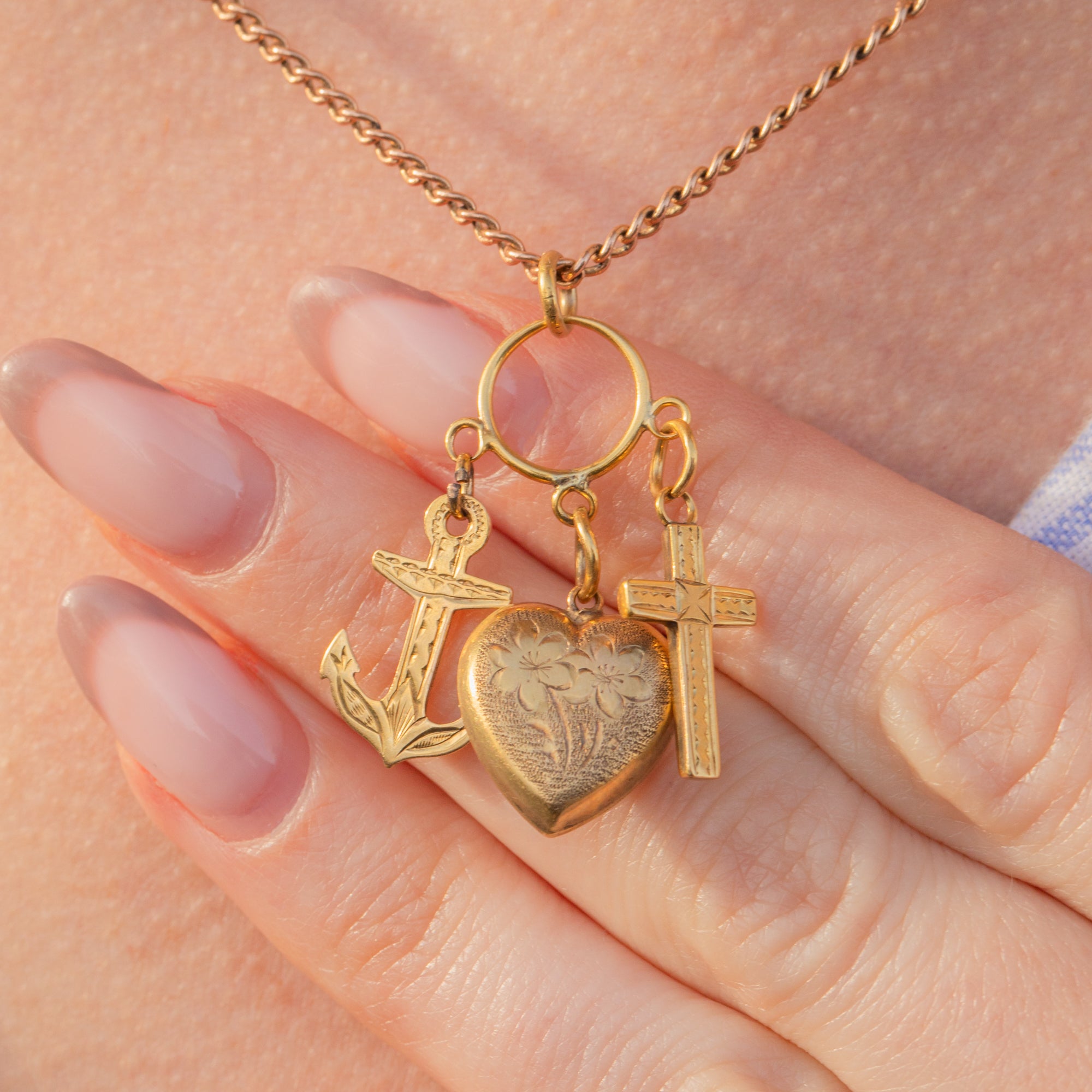 Featuring a floral engraved puffy heart, textured anchor, and embellished cross, she is just bursting with Victorian character! Pretty, lightweight, and versatile, this antique Gold pendant will make the perfect new addition to your jewellery collection.