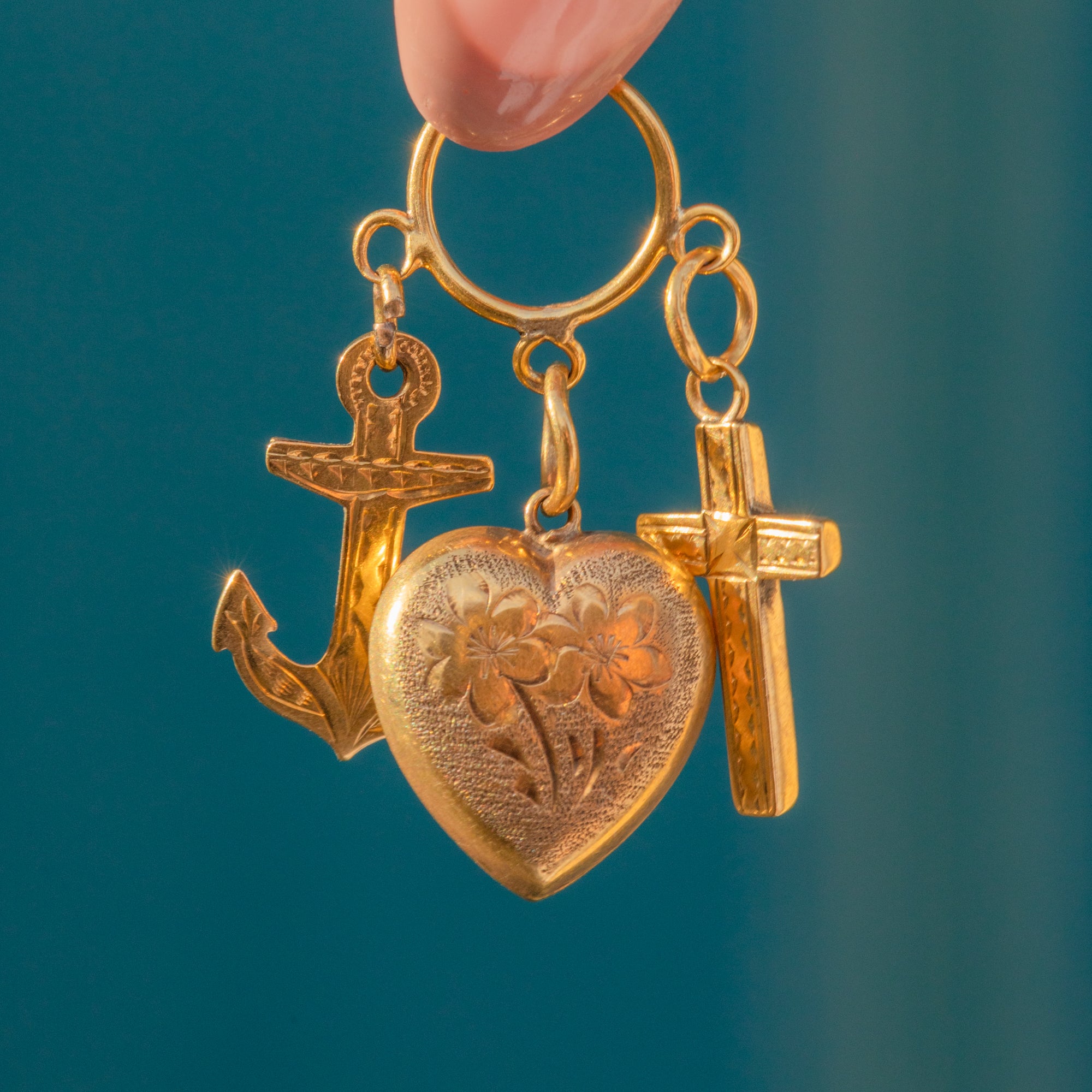 VERY GOOD. This Victorian 9ct Gold faith hope charity charm trio is in very good condition. The engraved markings are still all intact, with their three shapes keeping extremely well. Whilst there is some very minor surface wear to the Gold, this is hardly noticeable at all! Overall, she is a gorgeous testament to Victorian craftsmanship.