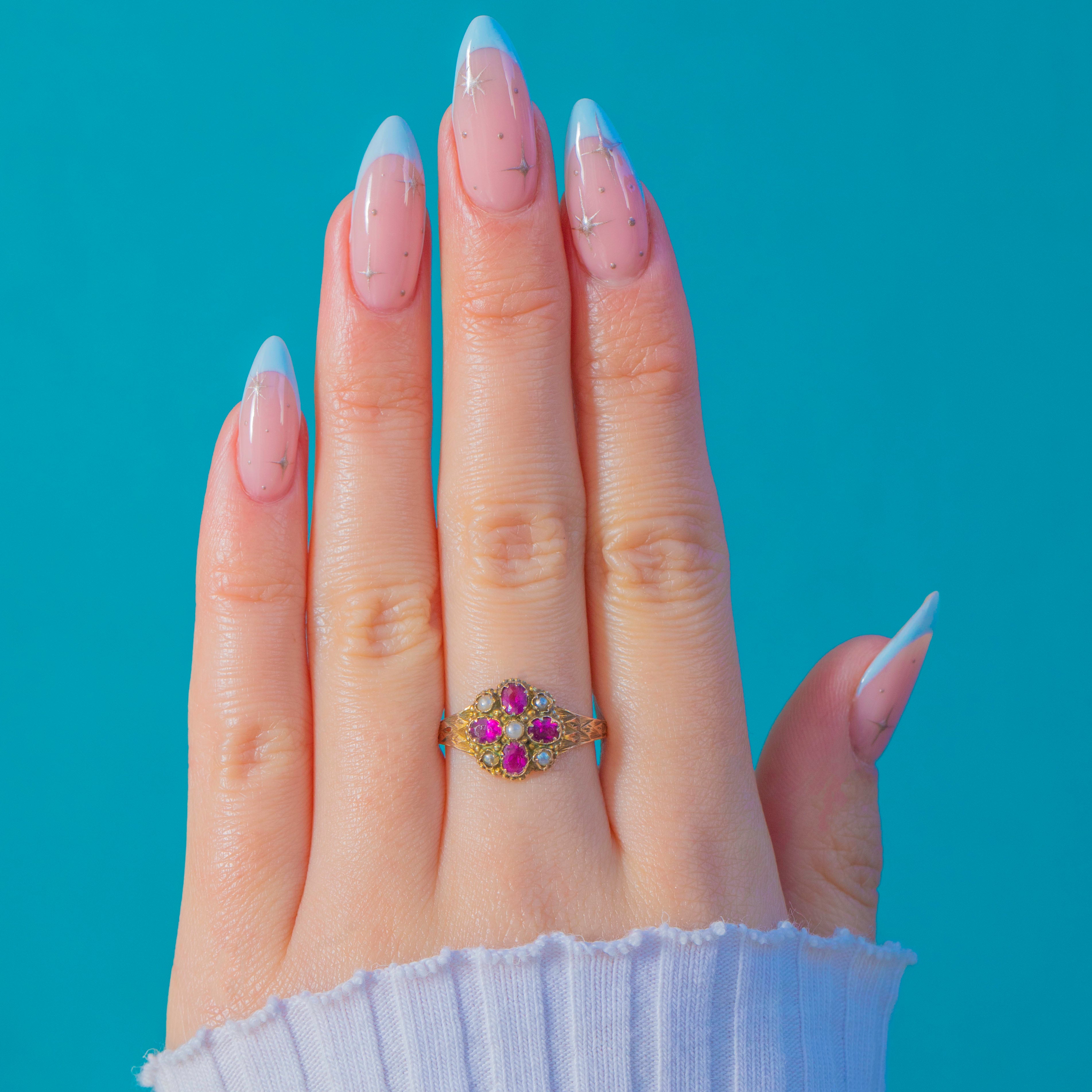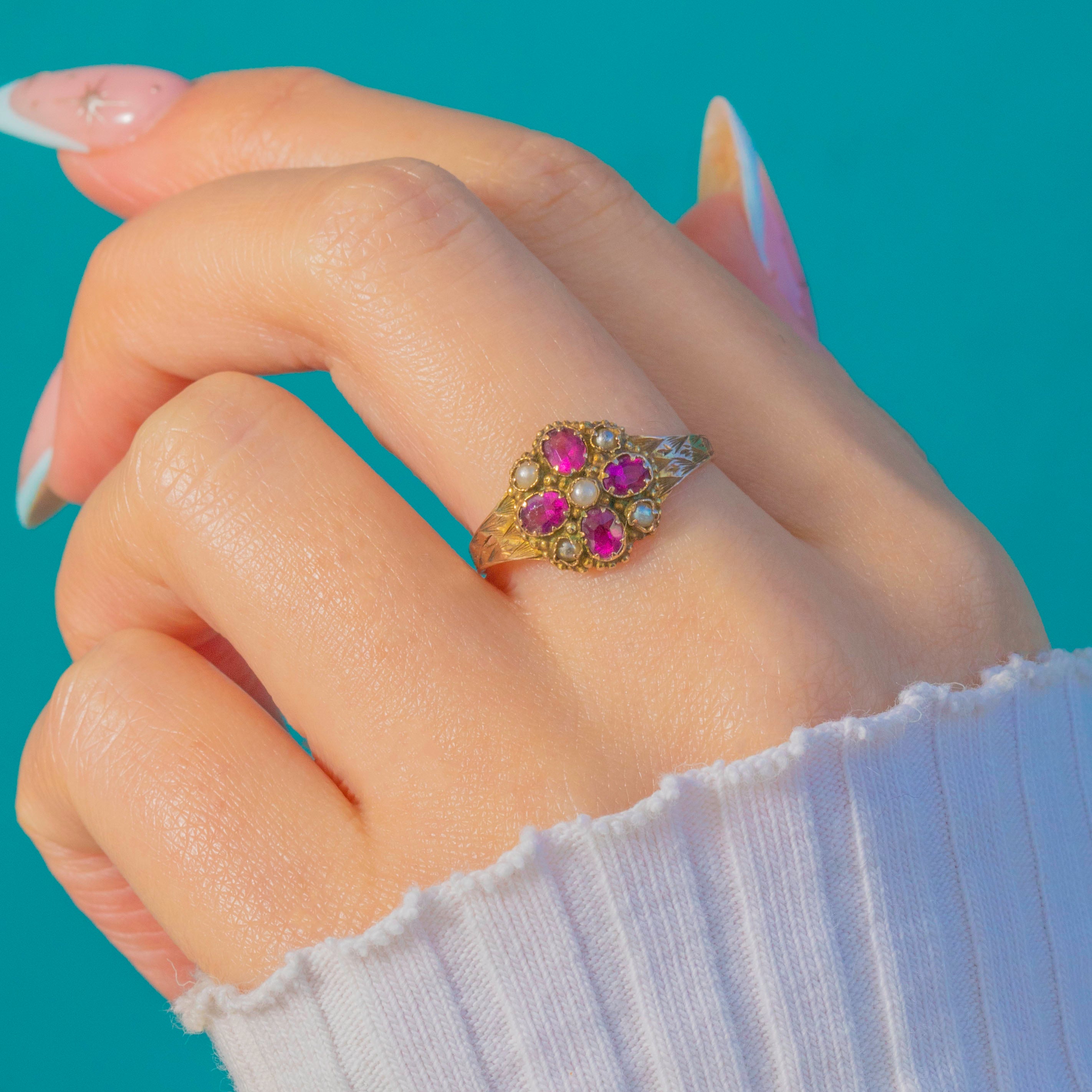 Radiating Victorian charm, this 9ct Gold cluster ring, dated 1876, presents a rounded quatrefoil head glowing with hot pink Paste, elegantly trimmed with natural Split Pearls. The scalloped, beaded settings and hand-chased foliate scrolls flow across the beautifully engraved band, while the hand-fabricated, pierced backplate keeps the profile delightfully low and wearable.