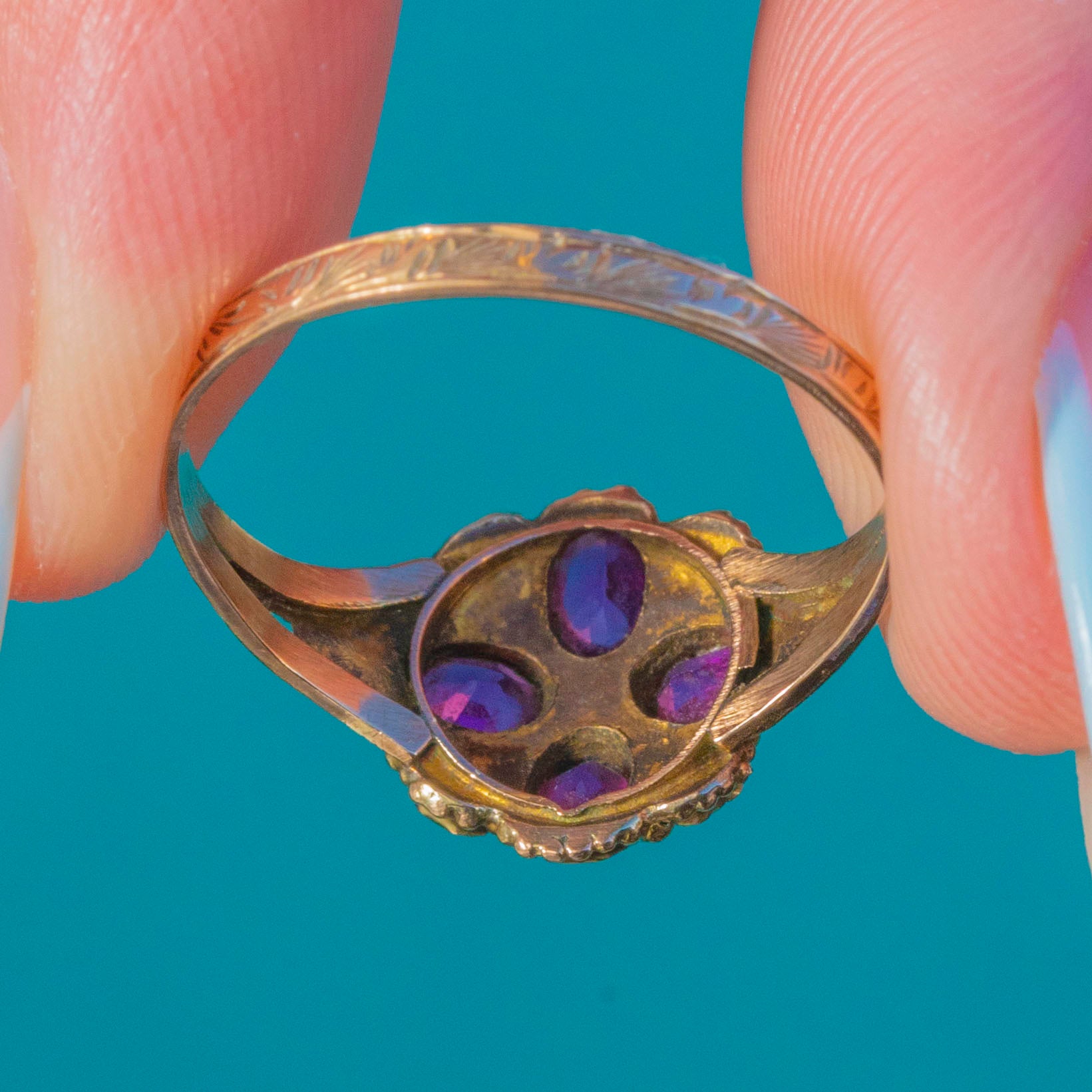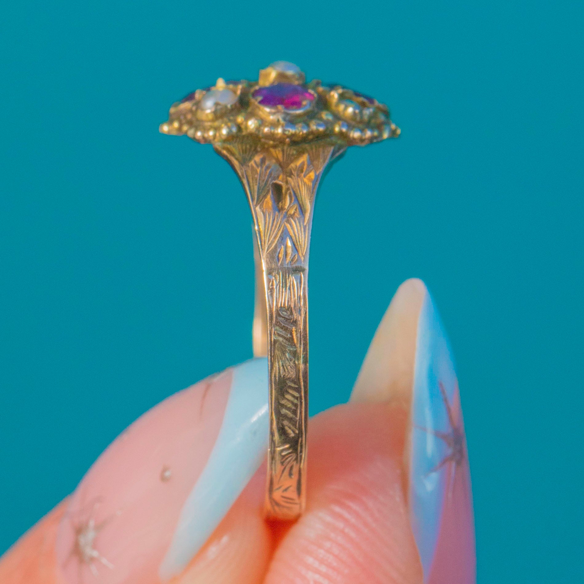 Victorian 9ct Gold Hot Pink Paste & Natural Split Pearl Cluster Ring c.1876
