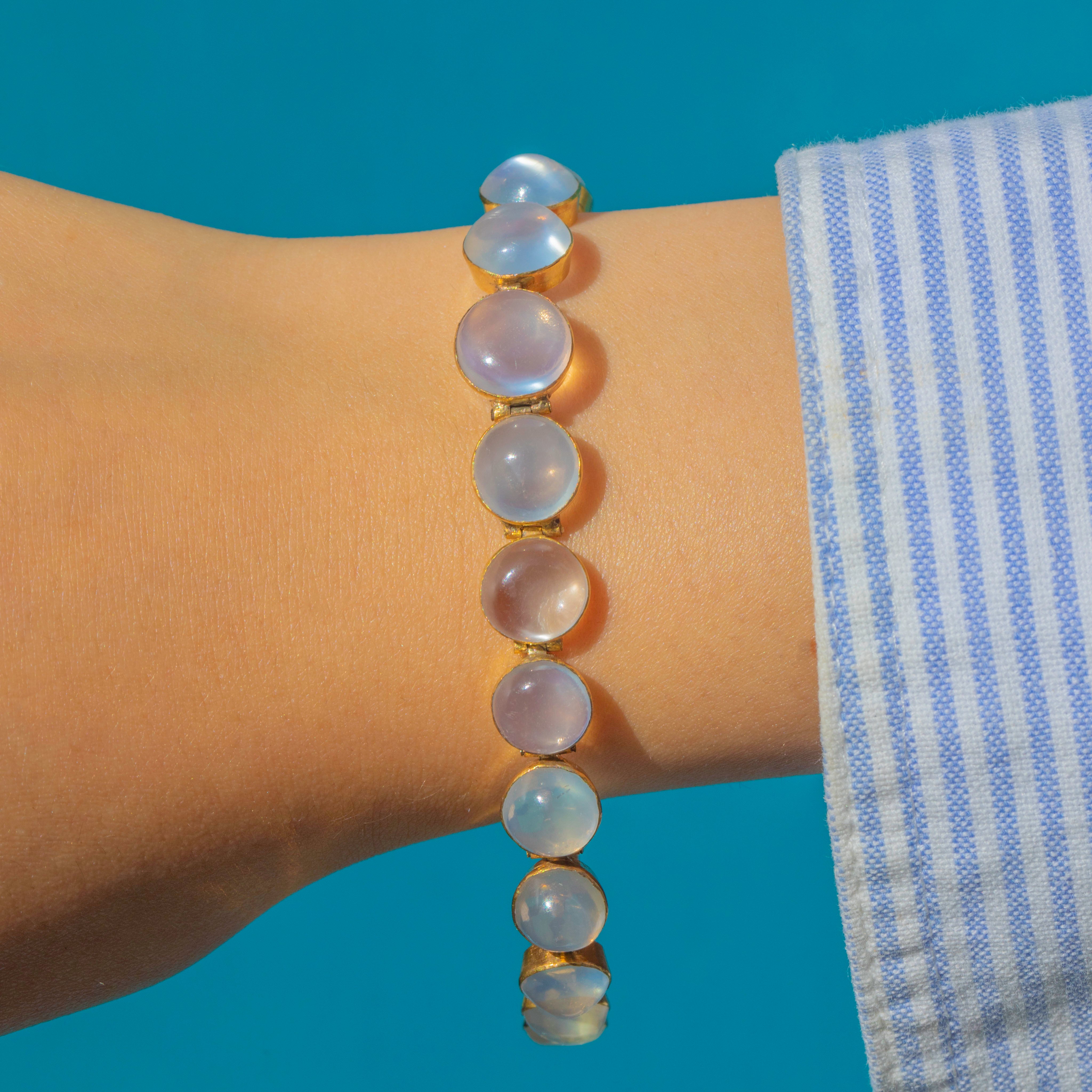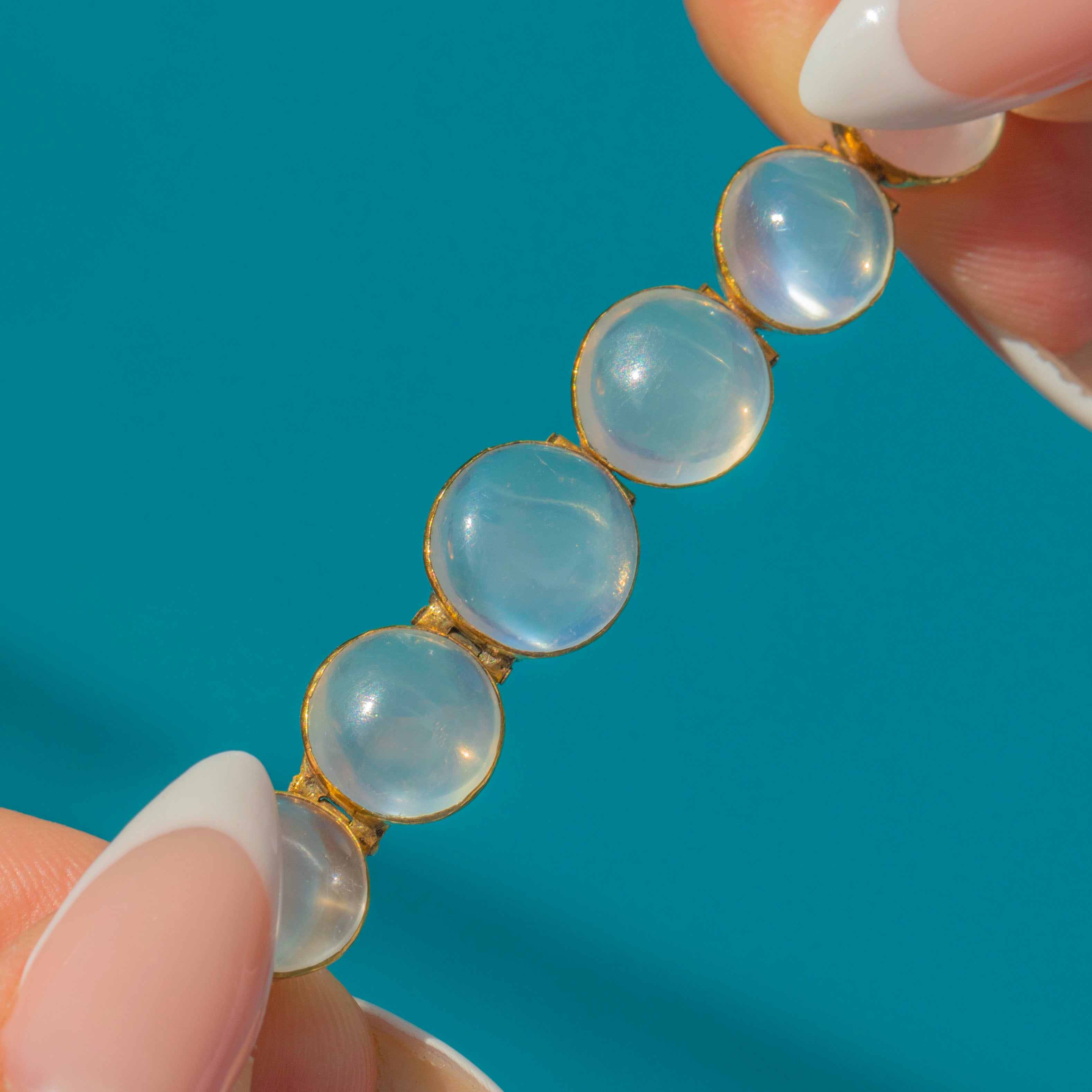 A luminous Victorian Moonstone bracelet in warm 9ct Gold. Round cabochon Moonstones are collet-set in a continuous line, each stone glowing with that ethereal blue sheen the era adored. Elegant on its own and effortless to stack—classic Victorian romance with everyday wearability.