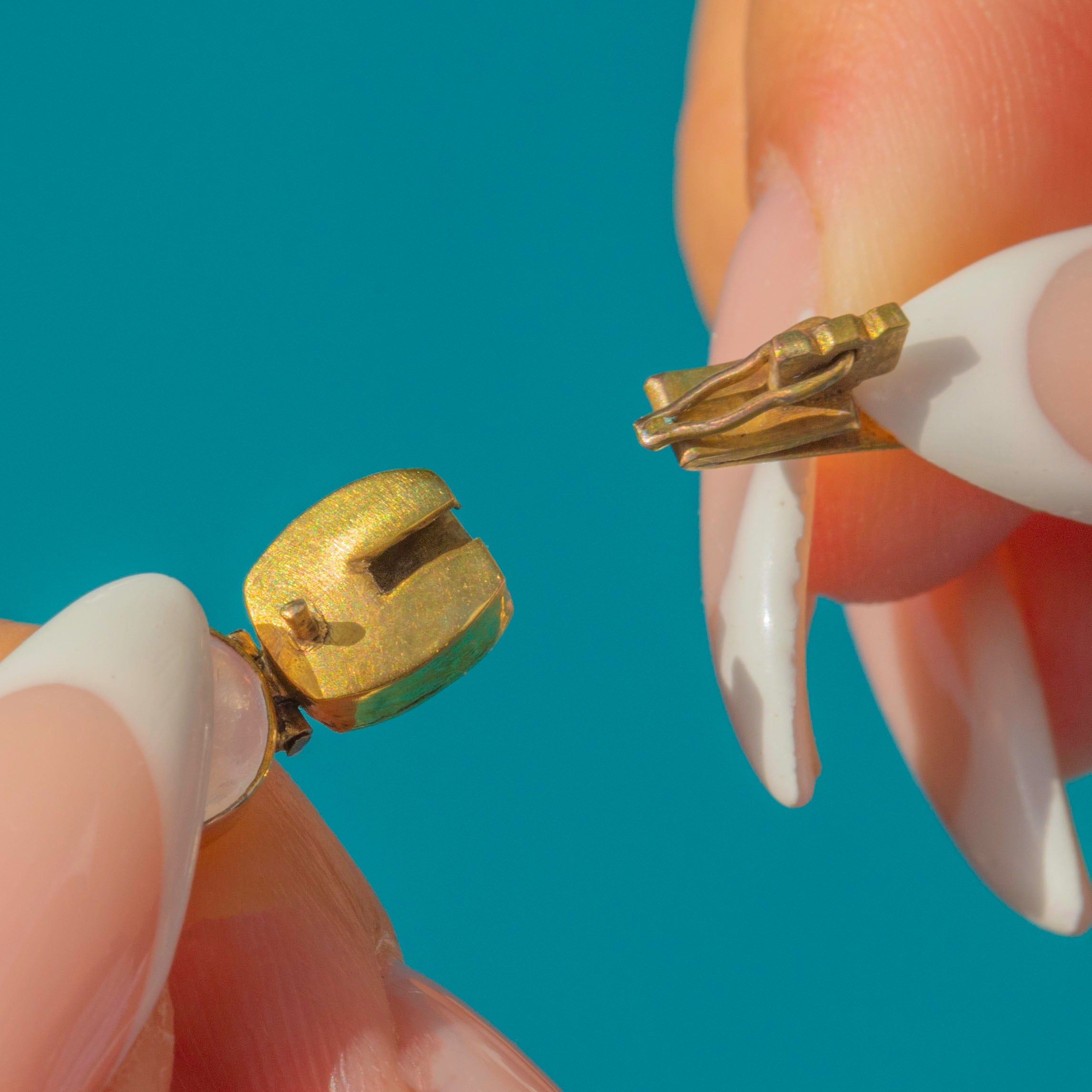 EXCELLENT: Moonstones are bright with no chips noted; settings are secure throughout. Gold shows an attractive, even antique patina with minimal age-related wear.