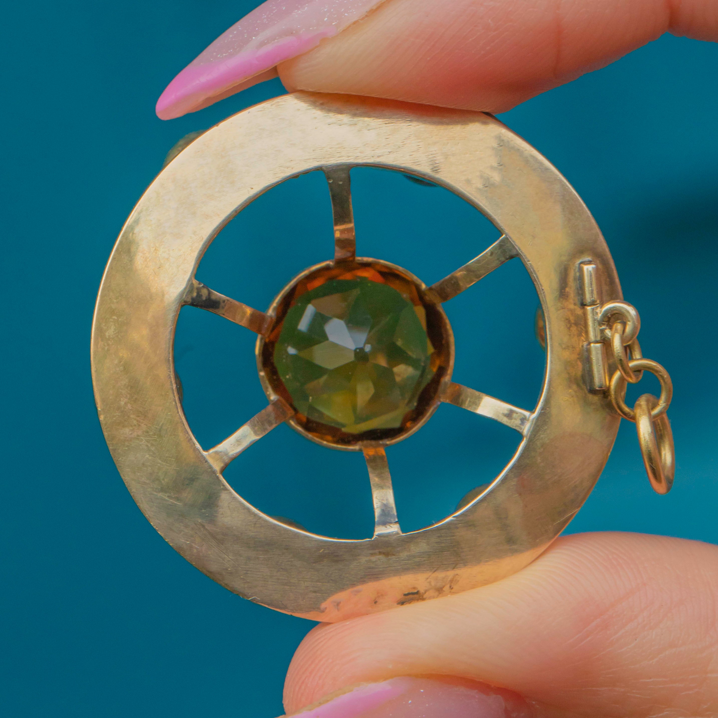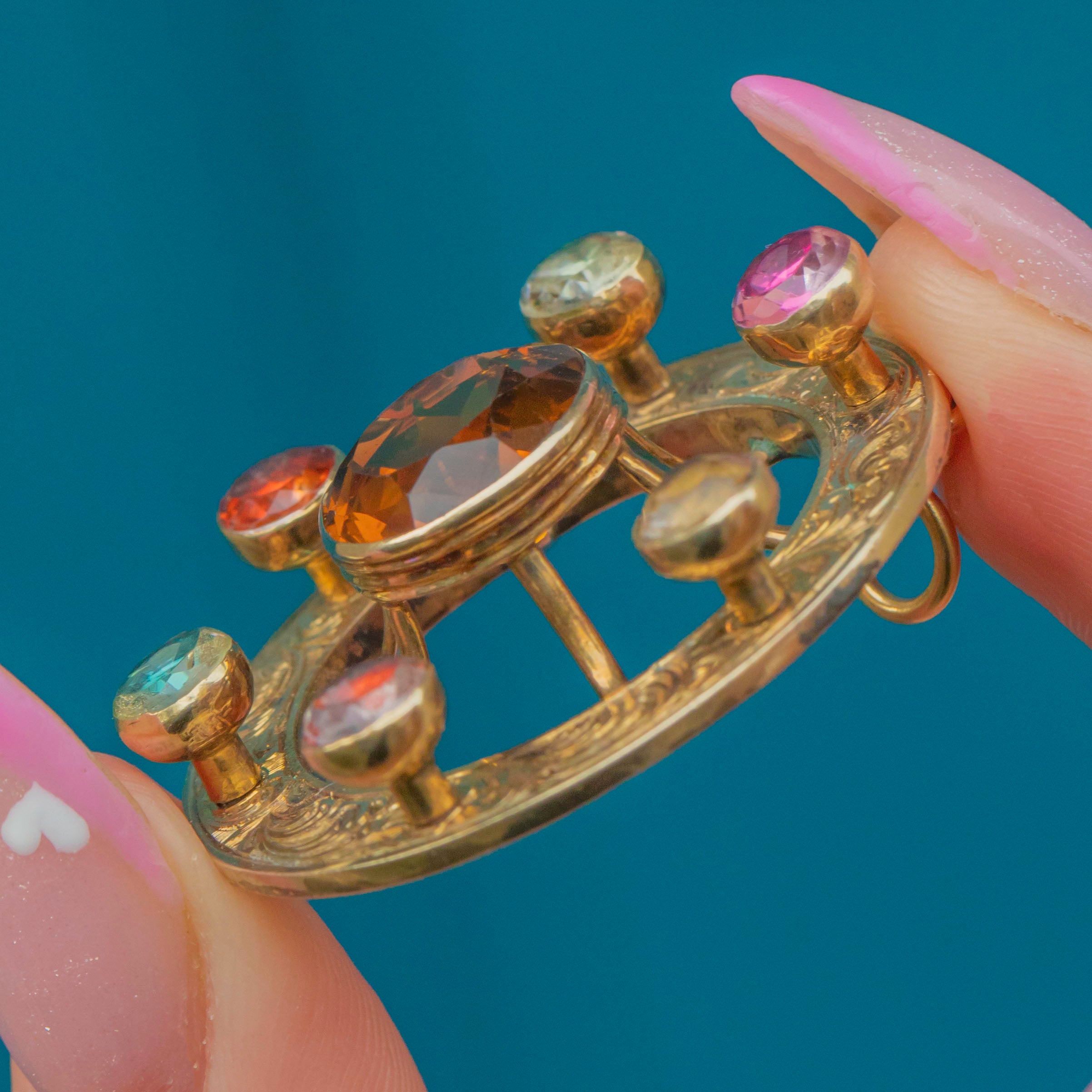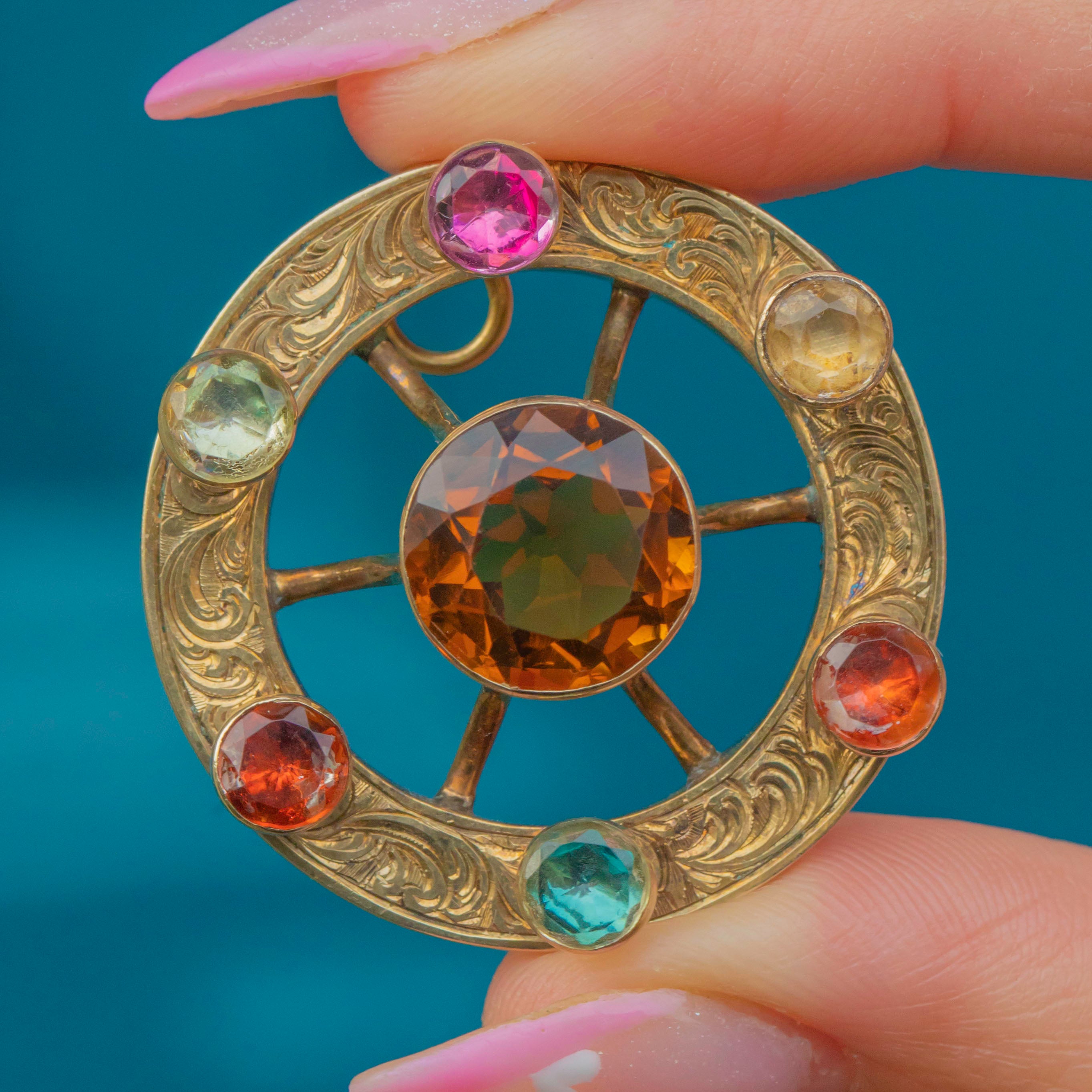 We love everything about this Victorian 9ct Gold Scottish Citrine & Paste pendant. This beauty has been crafted from solid 9ct Gold and boasts a central Madeira Citrine haloed by multicoloured foiled Paste gemstones!